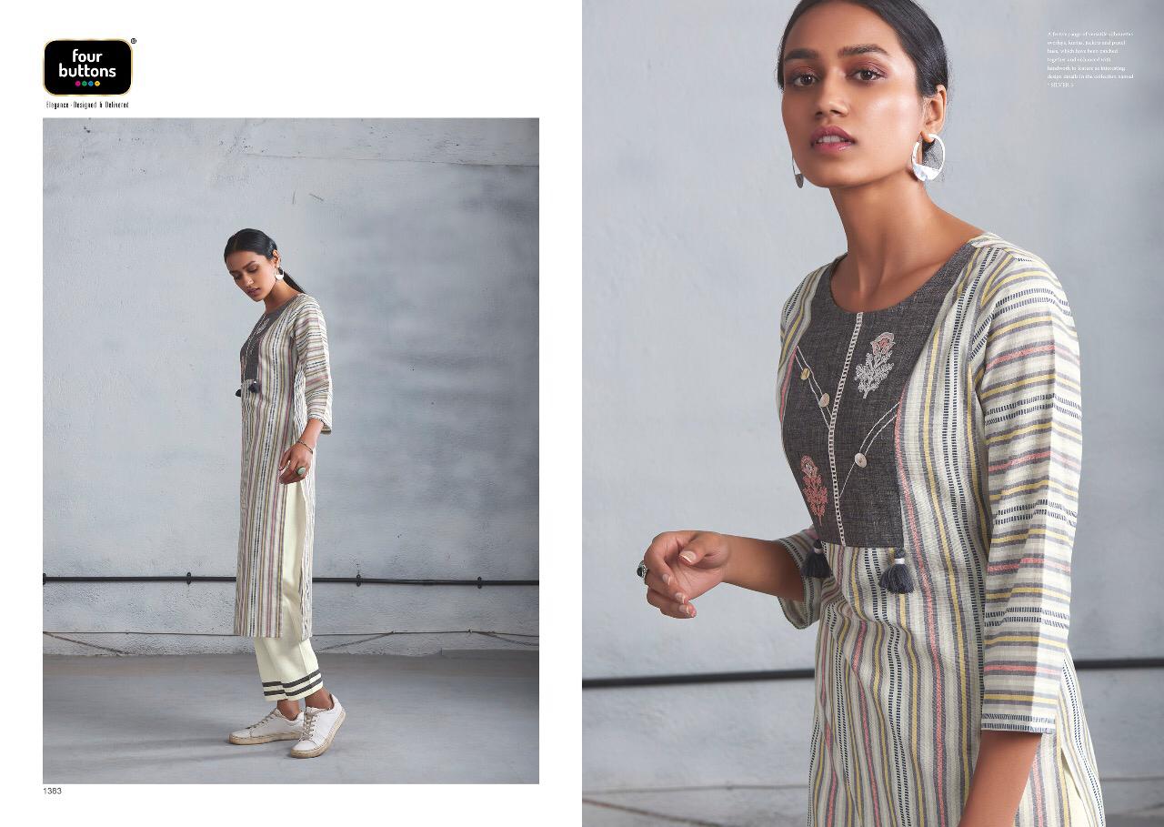 *FOUR BUTTONS * proudly launches its SPRING SUMMER Collection 2020 *"SILVER 5"* *FABRIC* *KURTI* - 100% PURE COTTON WEAVING STRIPES WITH EMBROIDERY ON EITHER DENIM OR HANDLOOM FABRIC *BOTTOM* - COTTON SLUB WITH SOME OR THE OTHER ATTACHMENTS *RATE - Rs 895/-* SIZES - M, L, XL, XXL, 3XL Set to set. GST 5 Percent Extra. Delivery 5-6 days . |