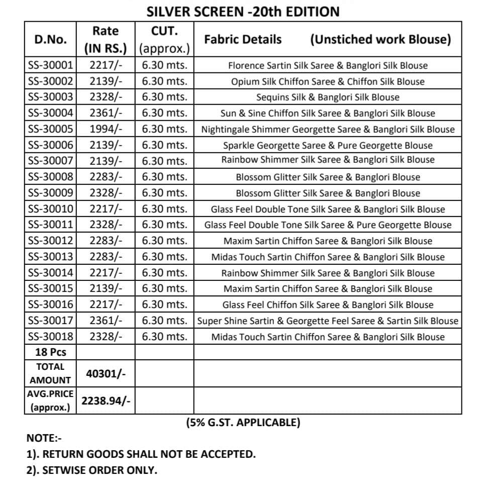 Buy Online SILVER SCREEN 20TH EDITION SERIES 30001 TO 30018 BY TFH FANCY SAREES 18 Pcs of Full Catalogue at Wholesale Price. Looking for SILVER SCREEN 20TH EDITION SERIES 30001 TO 30018 BY TFH FANCY SAREES Full Catalouge at Best Price? Buy Now SILVER SCREEN 20TH EDITION SERIES 30001 TO 30018 BY TFH FANCY SAREES at Wholesale Rate of Rs 40320 with Total 18 Pcs from authroized dealer and supplier of TFH Brand. Cost of Each piece is just only Rs 2240 which is very low and affordable price to resale the product in your retail store ,This is Surat based Wholesale Supplier & Dealer of TFH Brand. Click on Brand name to Know more about TFH Brand's products.Call or Whatsapp on 9898838984 for booking or enquiry