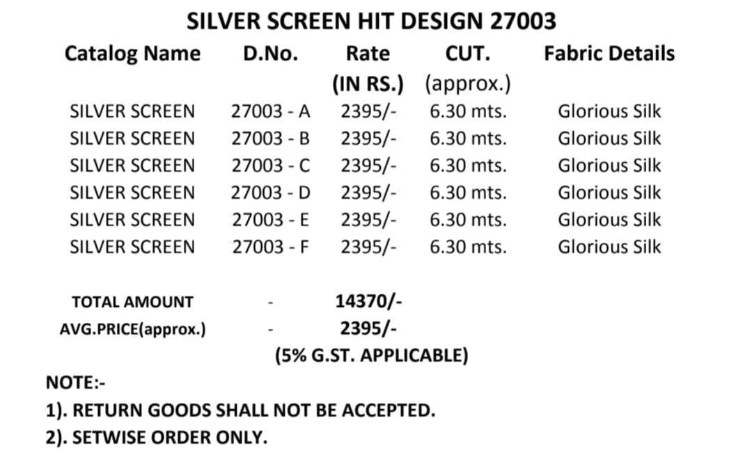 BRAND NAME – *TFH* CATALOG NAME - SILVER SCREEN HIT DESIGN SERIES – 27003A TO 27003F FABRIC DETAILS & RATE LIST ATTCHED GST 5% EXTRA Delivery from today BOOK YOUR ORDER NOW