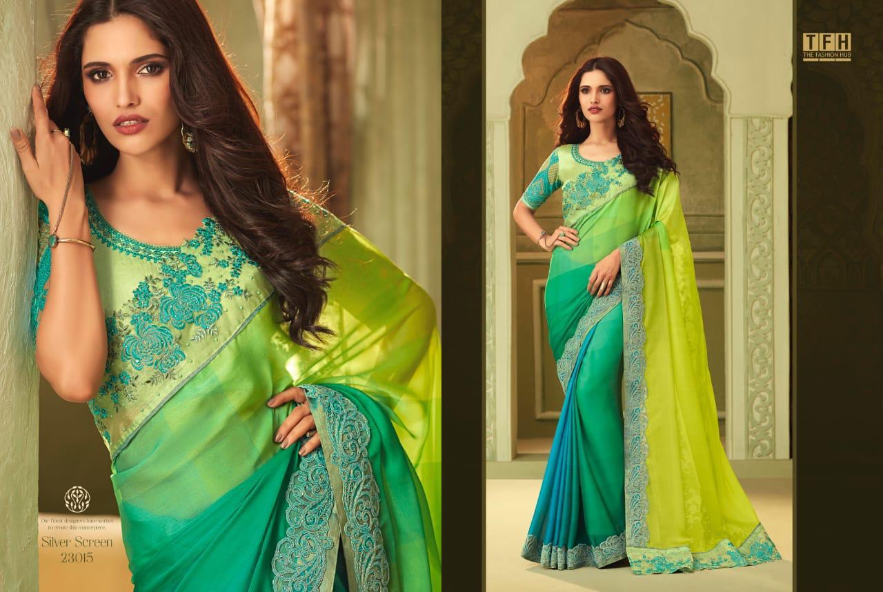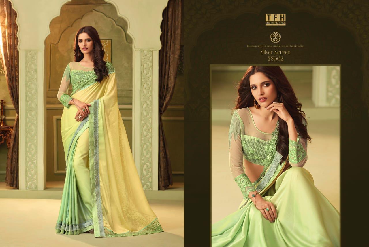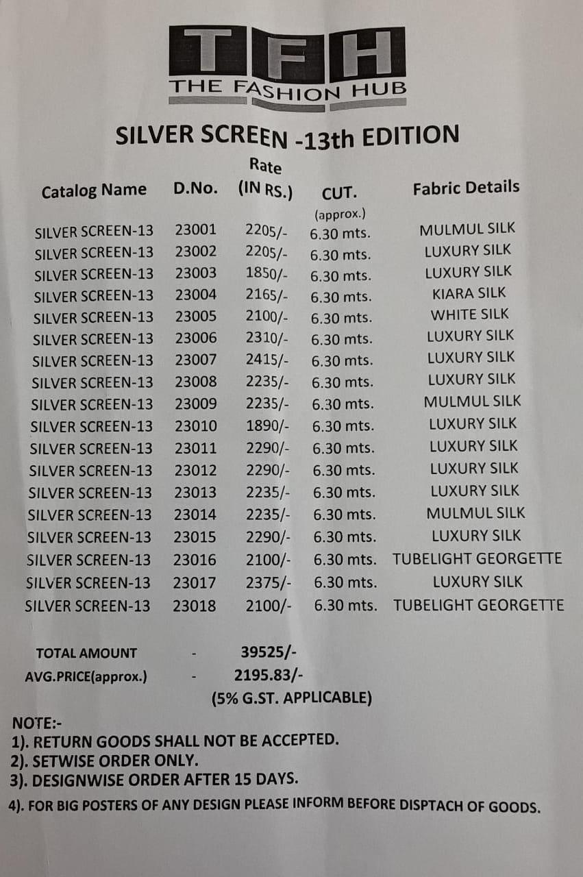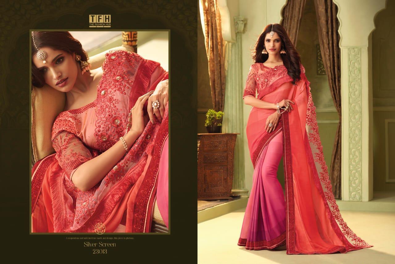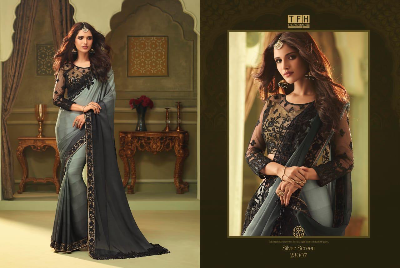 Buy Online Silver Screen Issue 13 By Tfh Series 23001 To 23018 Fancy Party Wear Sarees Wholesale Supplier Gujarat 18 Pcs of Full Catalogue at Wholesale Price. Looking for Silver Screen Issue 13 By Tfh Series 23001 To 23018 Fancy Party Wear Sarees Wholesale Supplier Gujarat Full Catalouge at Best Price? Buy Now Silver Screen Issue 13 By Tfh Series 23001 To 23018 Fancy Party Wear Sarees Wholesale Supplier Gujarat at Wholesale Rate of Rs 39528 with Total 18 Pcs from authroized dealer and supplier of TFH Brand. Cost of Each piece is just only Rs 2196 which is very low and affordable price to resale the product in your retail store ,This is Surat based Wholesale Supplier & Dealer of TFH Brand. Click on Brand name to Know more about TFH Brand's products.Call or Whatsapp on 9898838984 for booking or enquiry