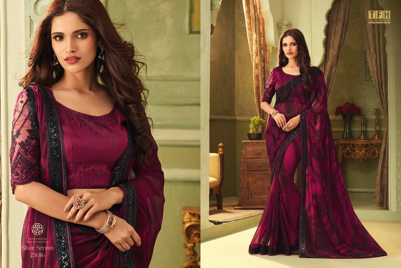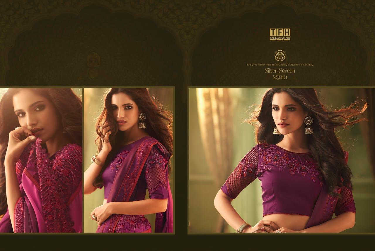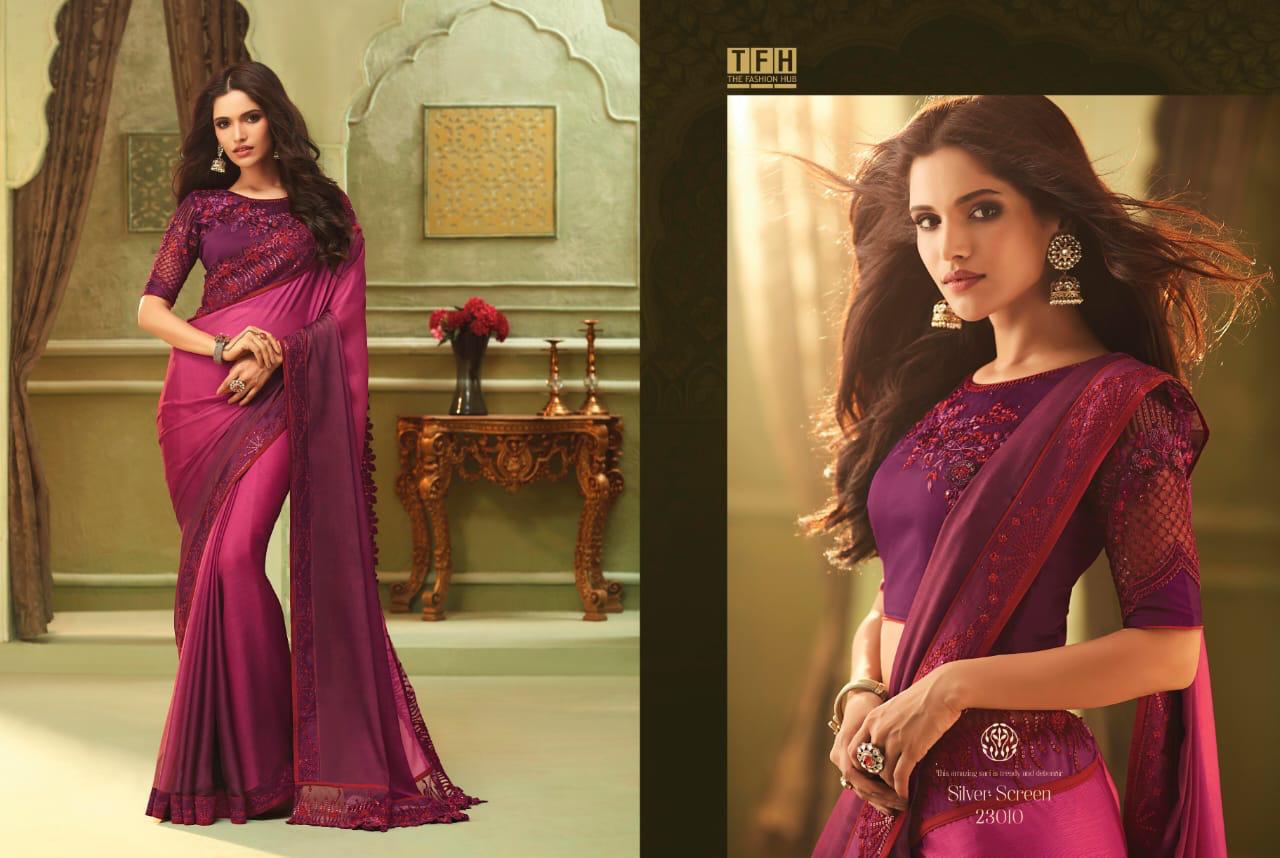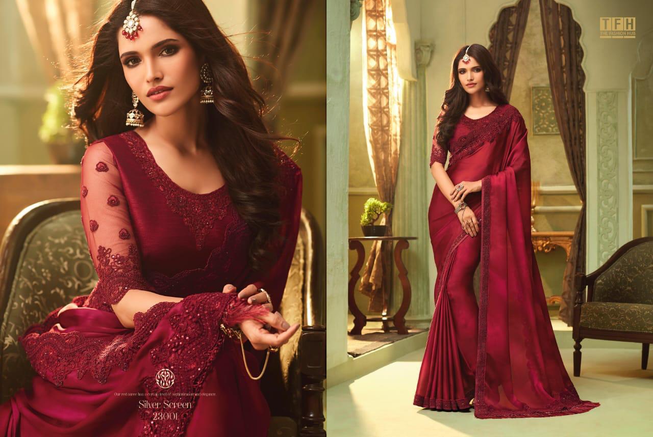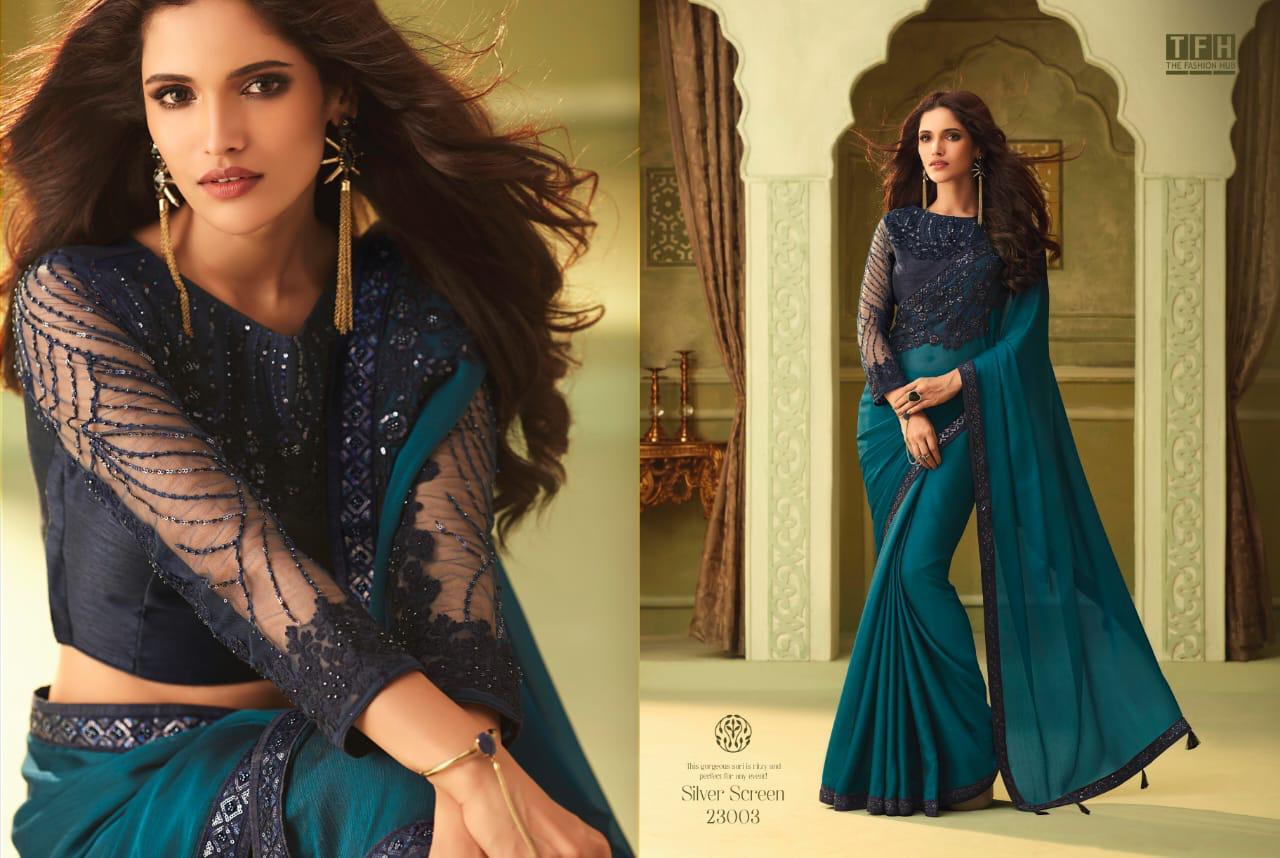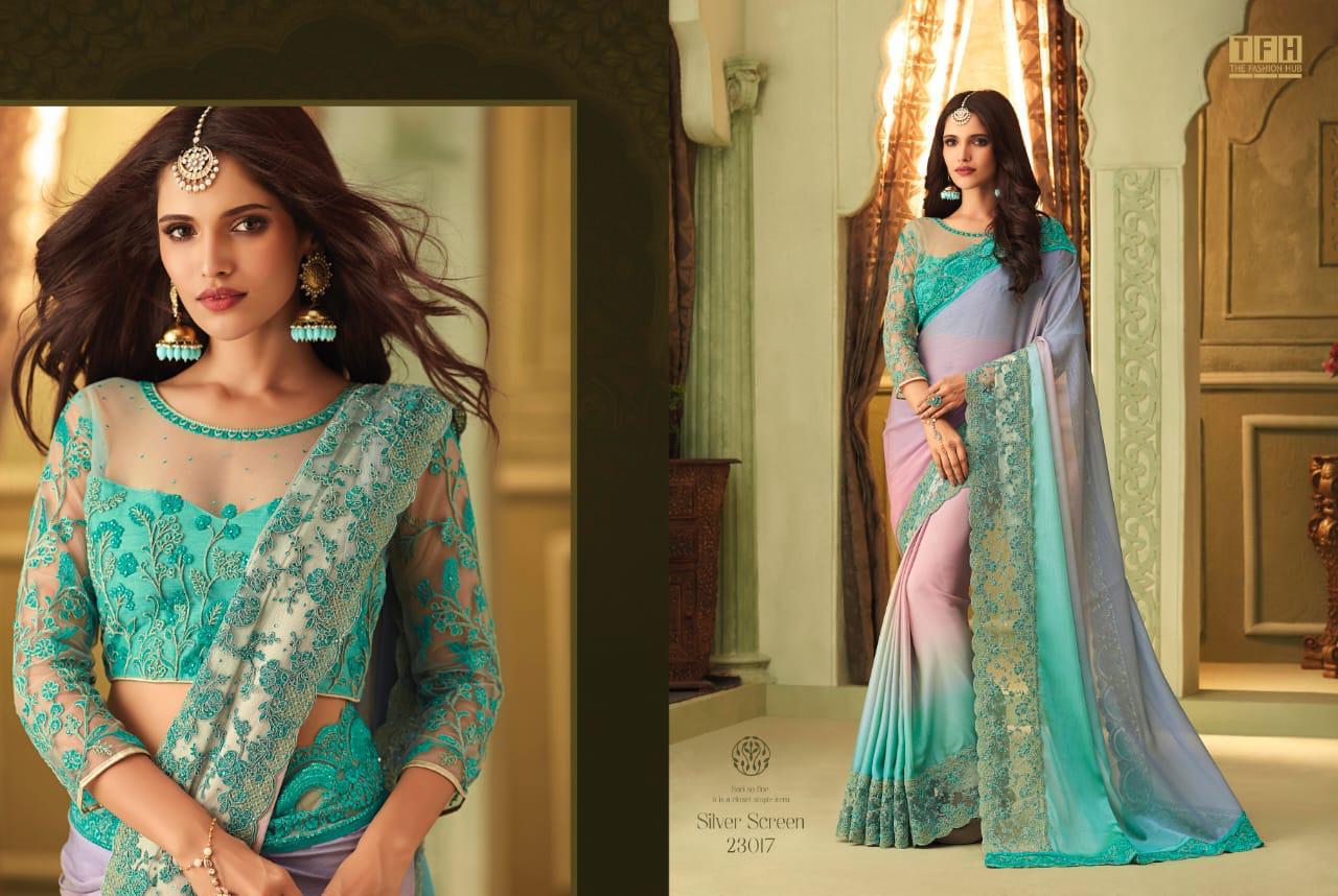Silver Screen Issue 13 By Tfh Series 23001 To 23018 Fancy Party Wear Sarees Wholesale Supplier Gujarat