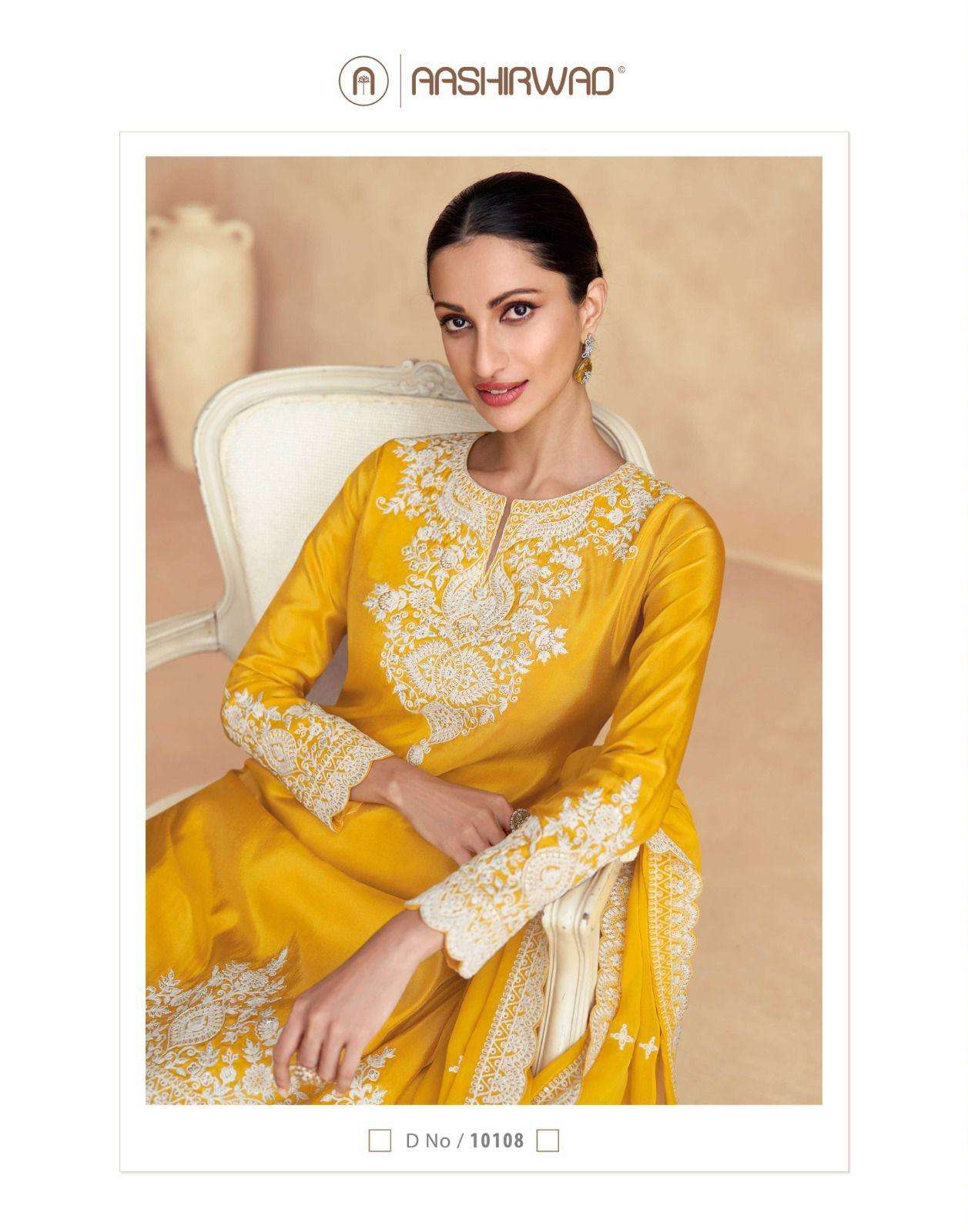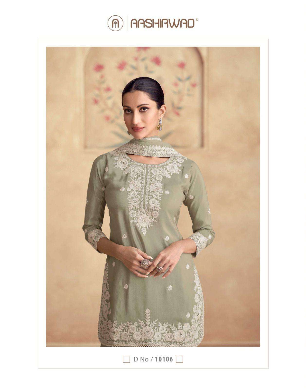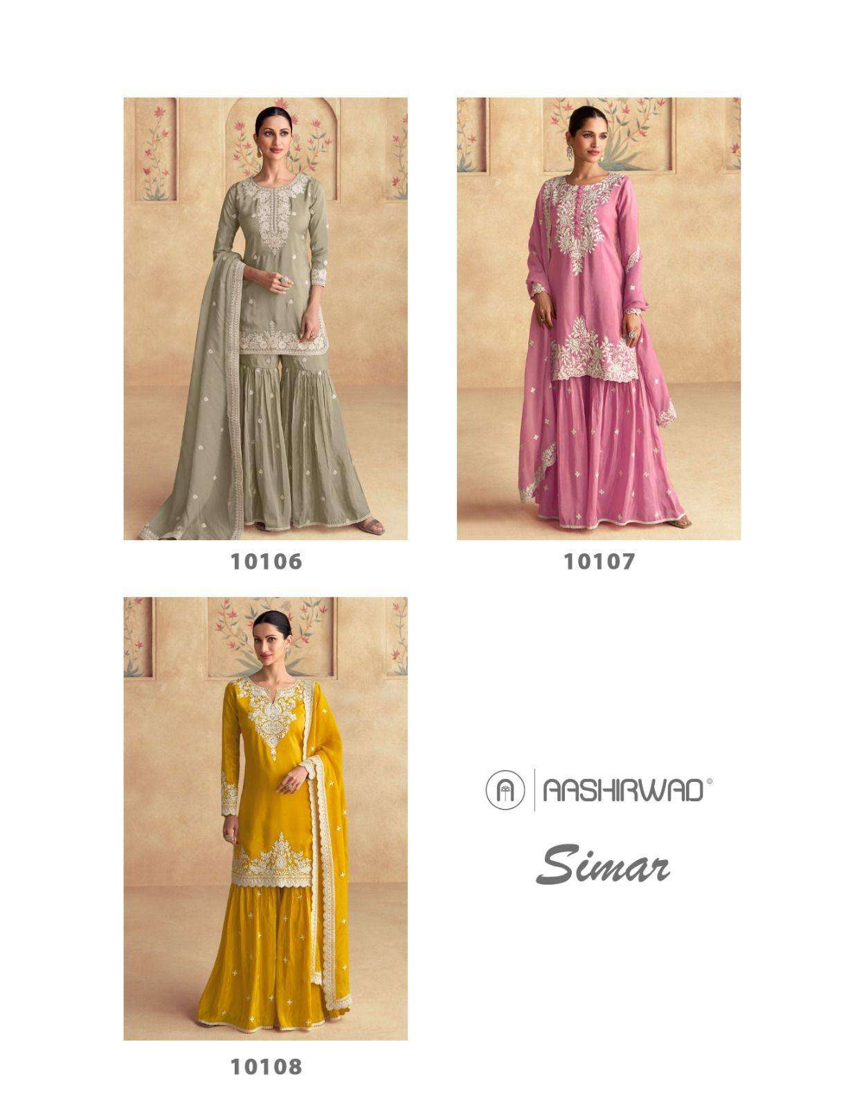Buy Online SIMAR 10106 SERIES by AASHIRWAD CREATION Suit collection manufacturer surat 3 Pcs of Full Catalogue at Wholesale Price. Looking for SIMAR 10106 SERIES by AASHIRWAD CREATION Suit collection manufacturer surat Full Catalouge at Best Price? Buy Now SIMAR 10106 SERIES by AASHIRWAD CREATION Suit collection manufacturer surat at Wholesale Rate of Rs 8400 with Total 3 Pcs from authroized dealer and supplier of AASHIRWAD Brand. Cost of Each piece is just only Rs 2800 which is very low and affordable price to resale the product in your retail store ,This is Surat based Wholesale Supplier & Dealer of AASHIRWAD Brand. Click on Brand name to Know more about AASHIRWAD Brand's products.Call or Whatsapp on 9898838984 for booking or enquiry
