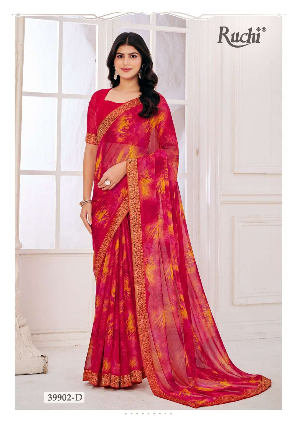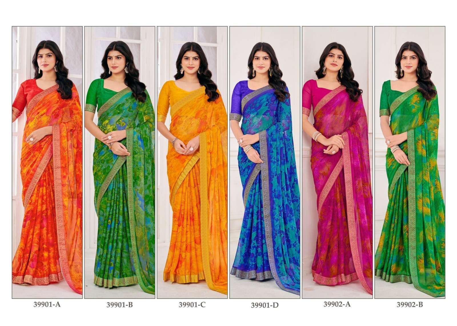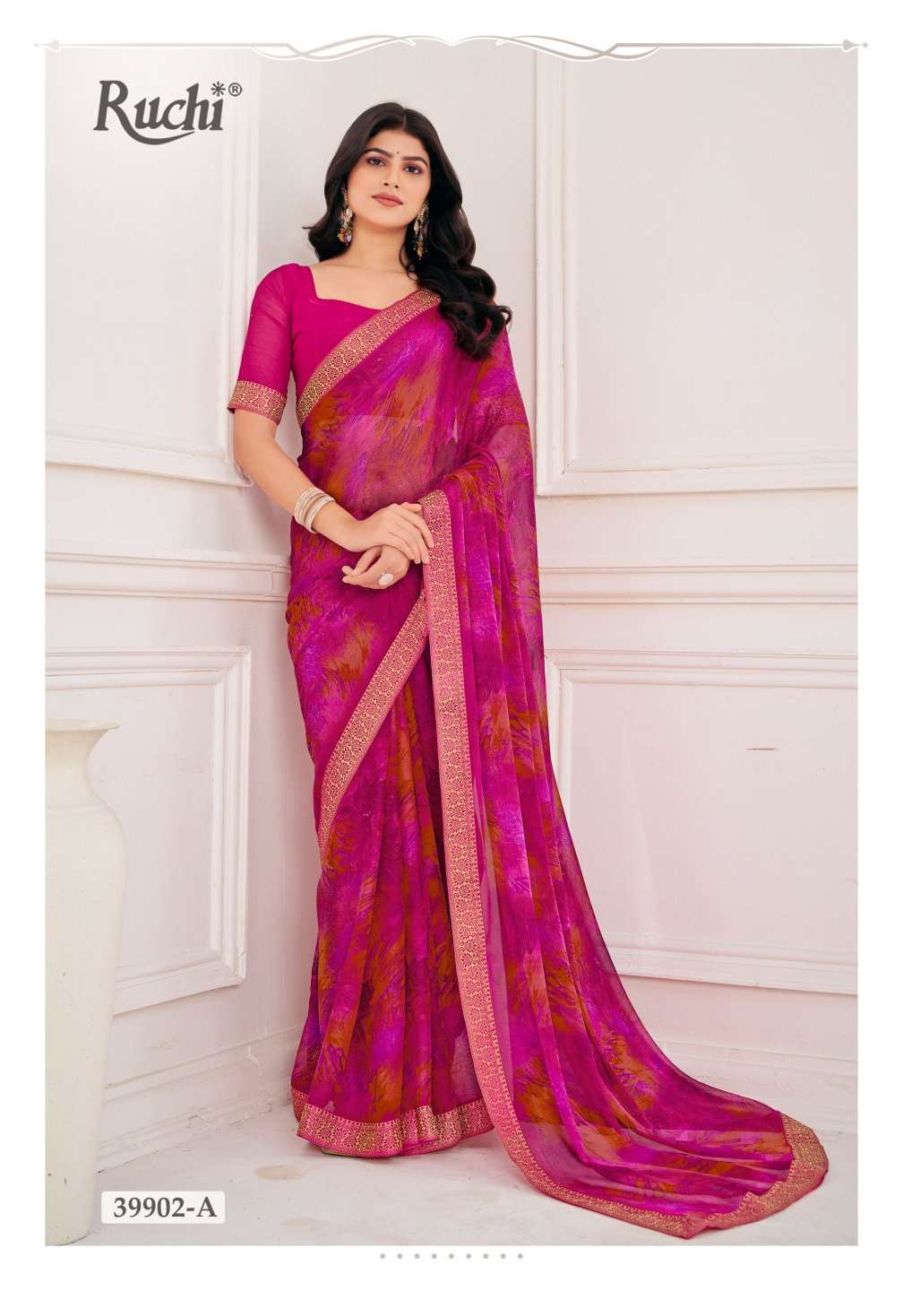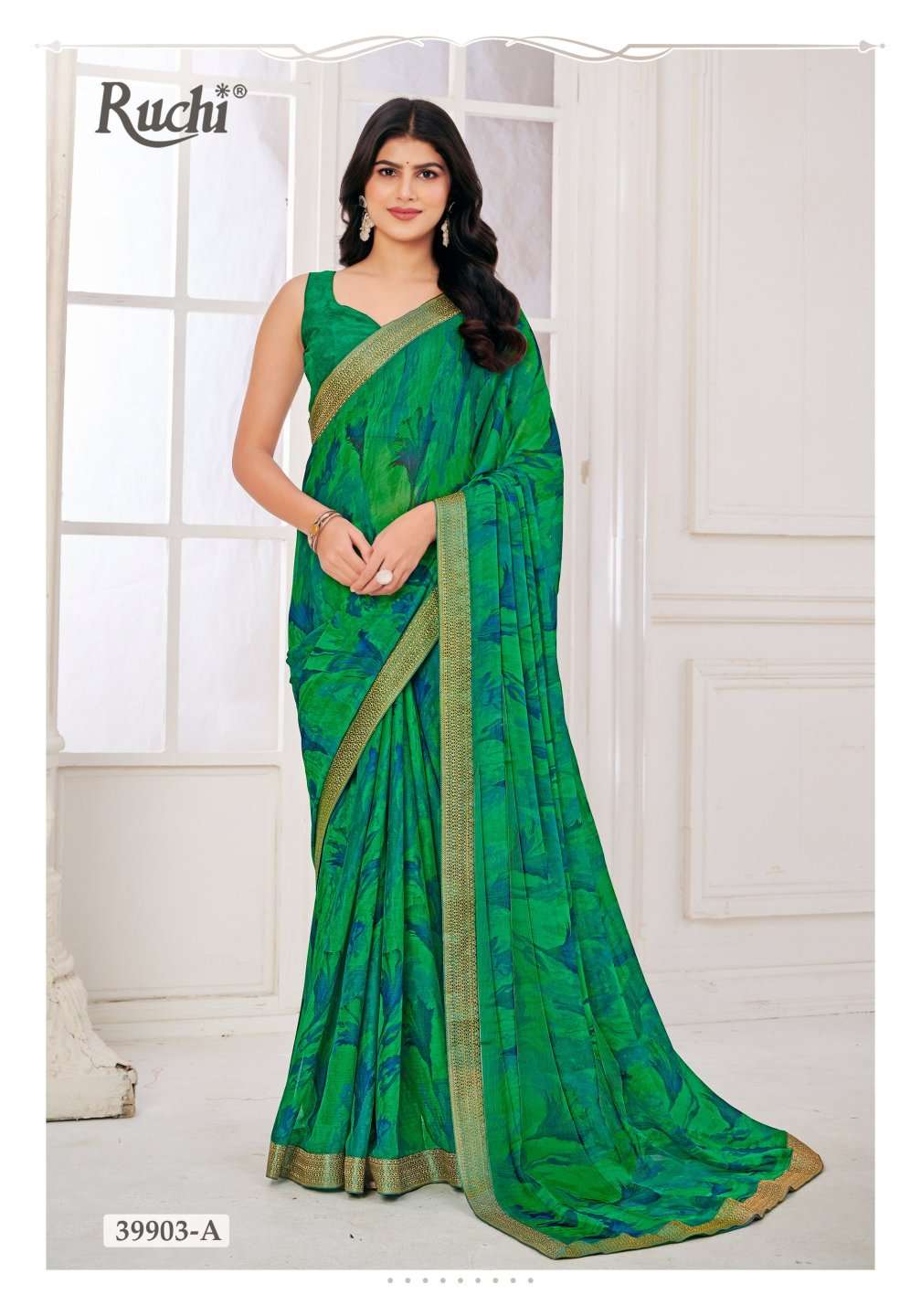Ruchi Sarees Presents "SIMAYAA" 1. Folder - Simayaa 30 2. Pcs. - 12. 3. Fabric - Chiffon Saree with attached border. 4. Packing - Setwise & Designwise 5. Rate- 528/- pcs