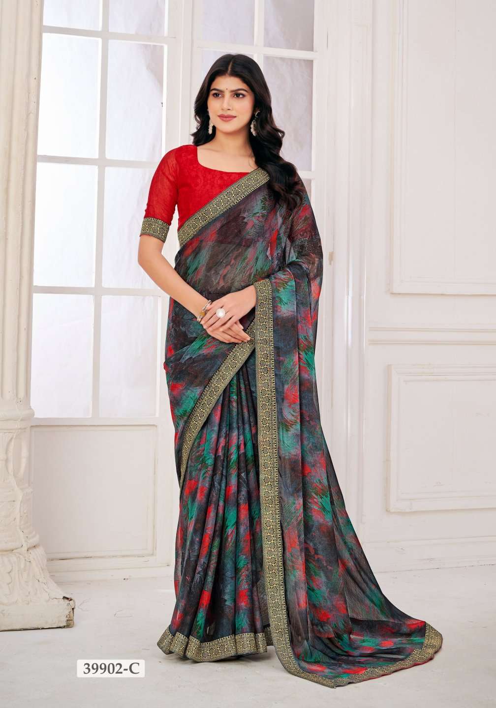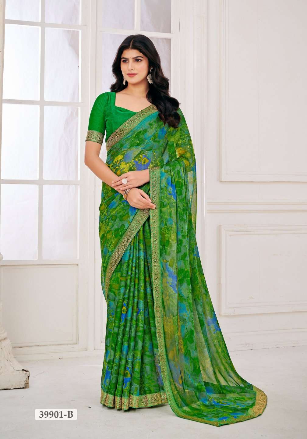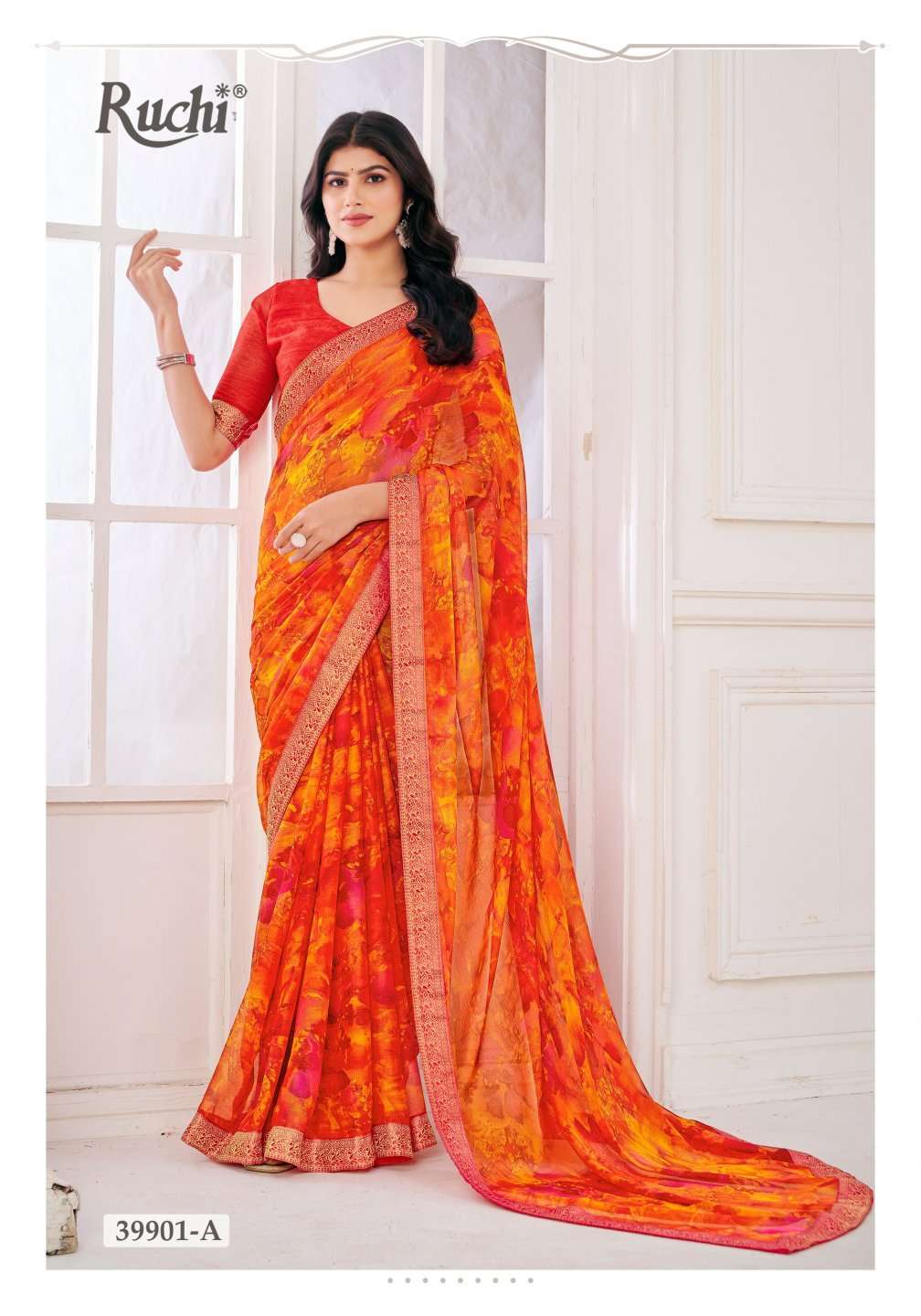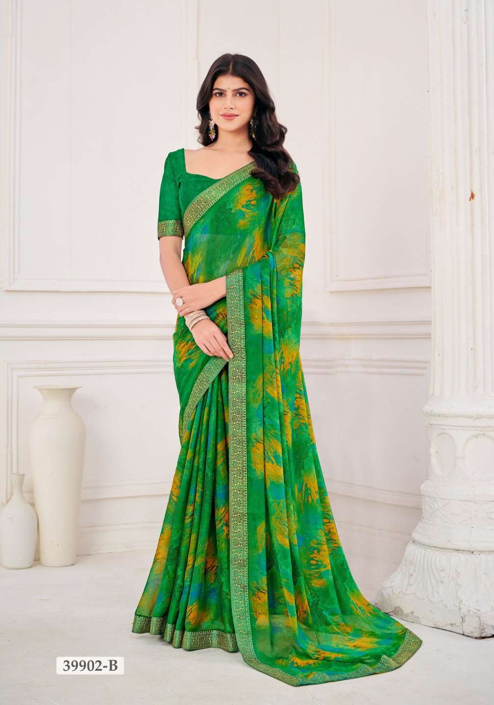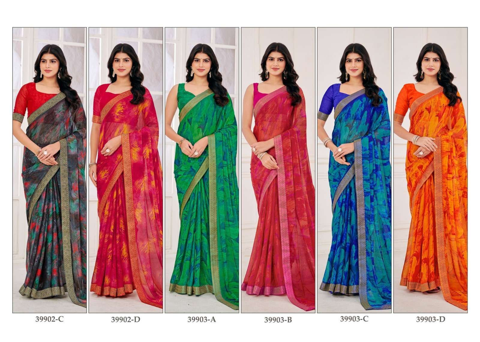 Ruchi Sarees Presents "SIMAYAA" 1. Folder - Simayaa 30 2. Pcs. - 12. 3. Fabric - Chiffon Saree with attached border. 4. Packing - Setwise & Designwise 5. Rate- 528/- pcs