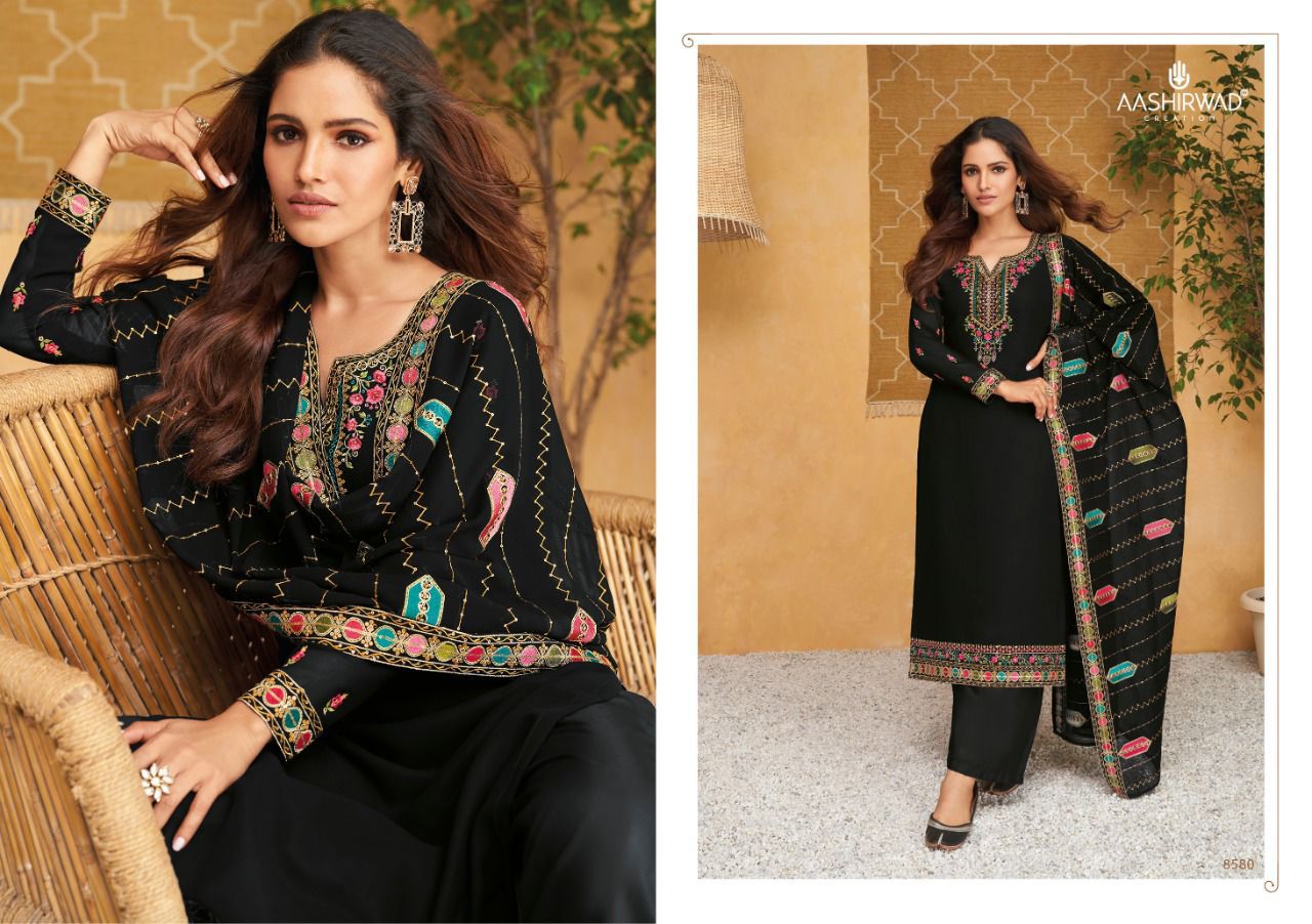 AASHIRWAD CREATION PRESENT NEW CATLOG ??SIMRAN(6 pcs )?? ?FABRIC DETAILS !!!! TOP-REAL GEORGETTE INNER- SILK SANTOON BOTTOM- SILK SANTOON DUPTTA- REAL GEORGETTE with heavy embroidery Price - 1695 per pcs Set to set Dispatching in 3 days !!! |