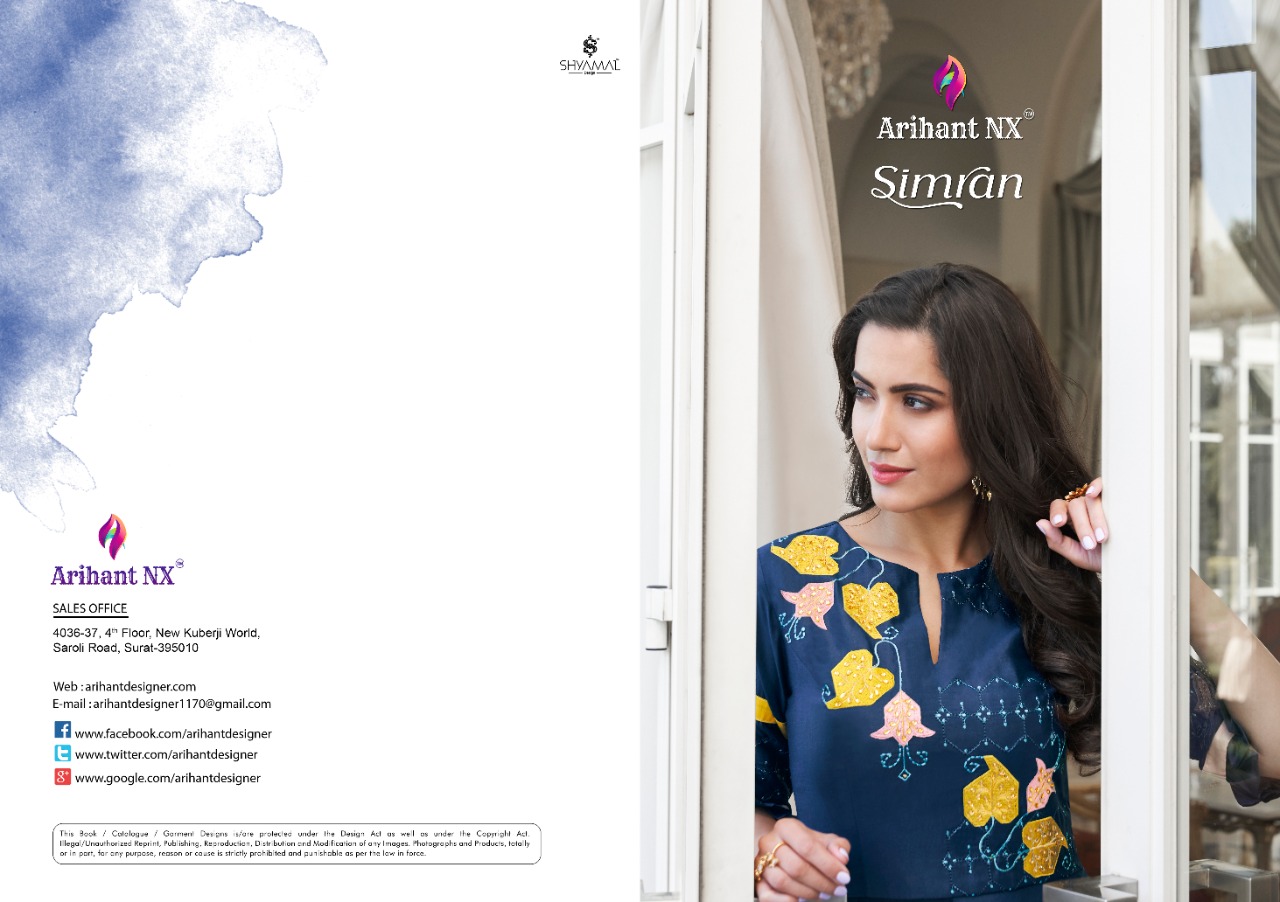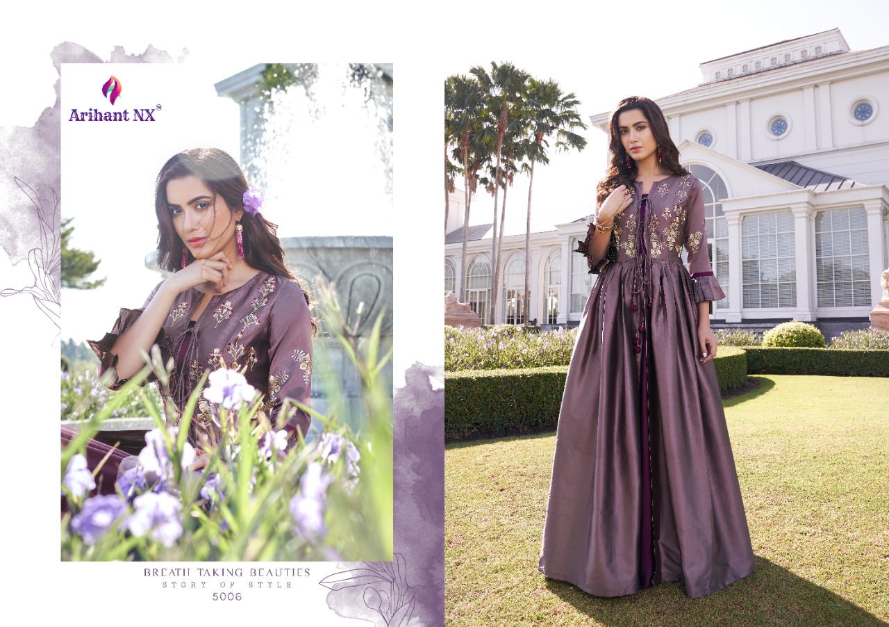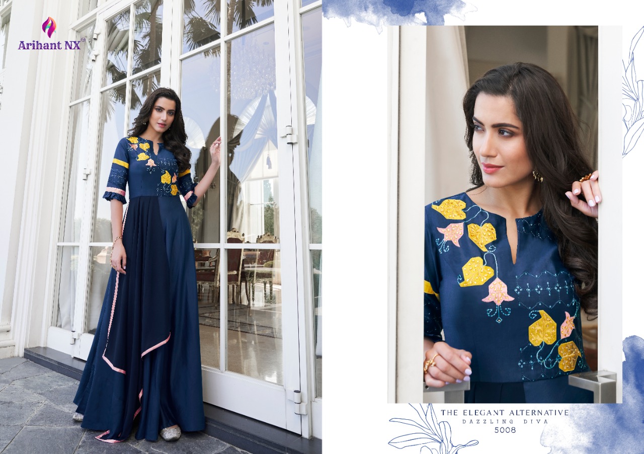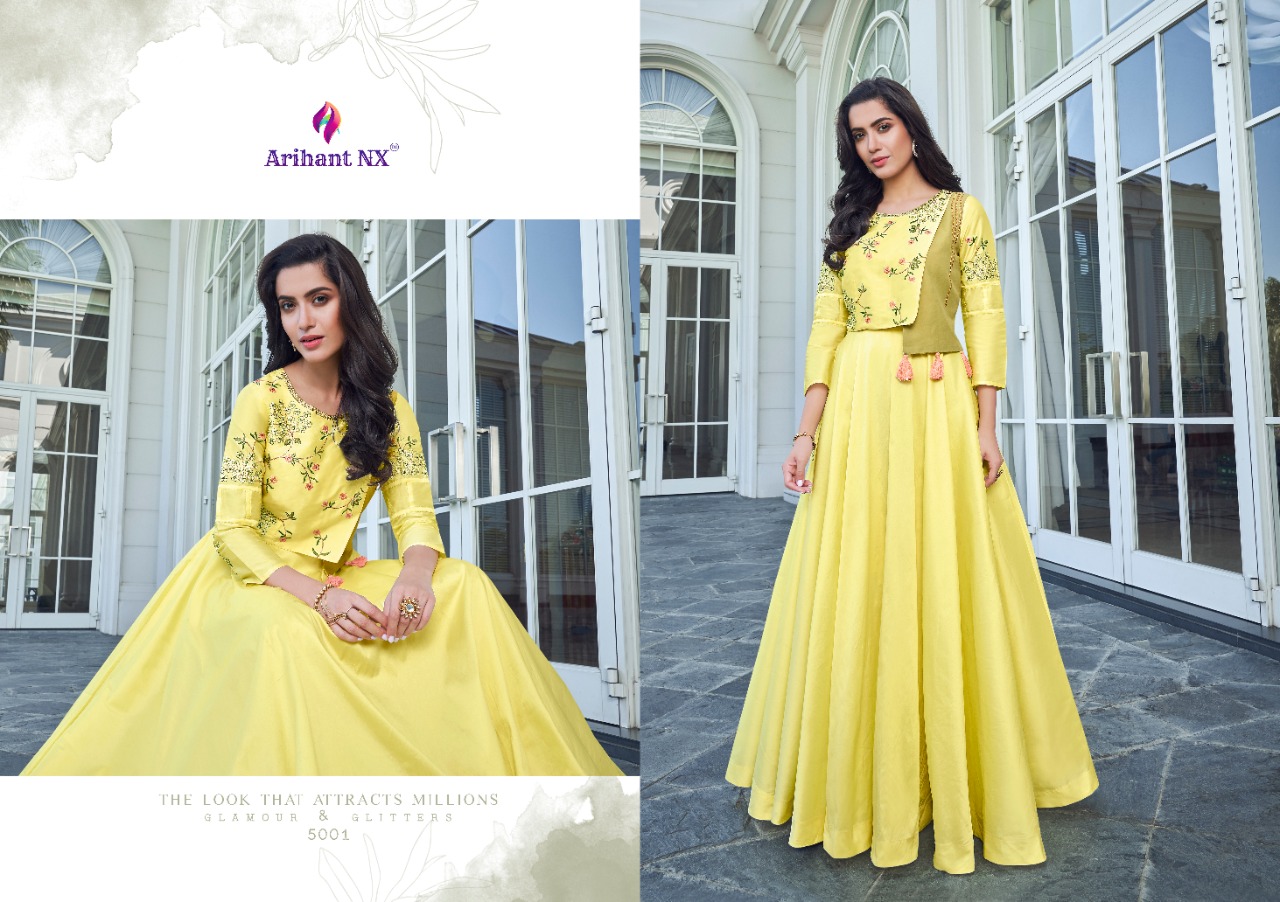 Buy Online Simran By Arihant Nx Series 5001 To 5008 Designer Party Wear Gowns Wholesale Supplier Gujarat 8 Pcs of Full Catalogue at Wholesale Price. Looking for Simran By Arihant Nx Series 5001 To 5008 Designer Party Wear Gowns Wholesale Supplier Gujarat Full Catalouge at Best Price? Buy Now Simran By Arihant Nx Series 5001 To 5008 Designer Party Wear Gowns Wholesale Supplier Gujarat at Wholesale Rate of Rs 7560 with Total 8 Pcs from authroized dealer and supplier of ARIHANT NX Brand. Cost of Each piece is just only Rs 945 which is very low and affordable price to resale the product in your retail store ,This is Surat based Wholesale Supplier & Dealer of ARIHANT NX Brand. Click on Brand name to Know more about ARIHANT NX Brand's products.Call or Whatsapp on 9898838984 for booking or enquiry