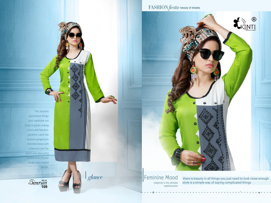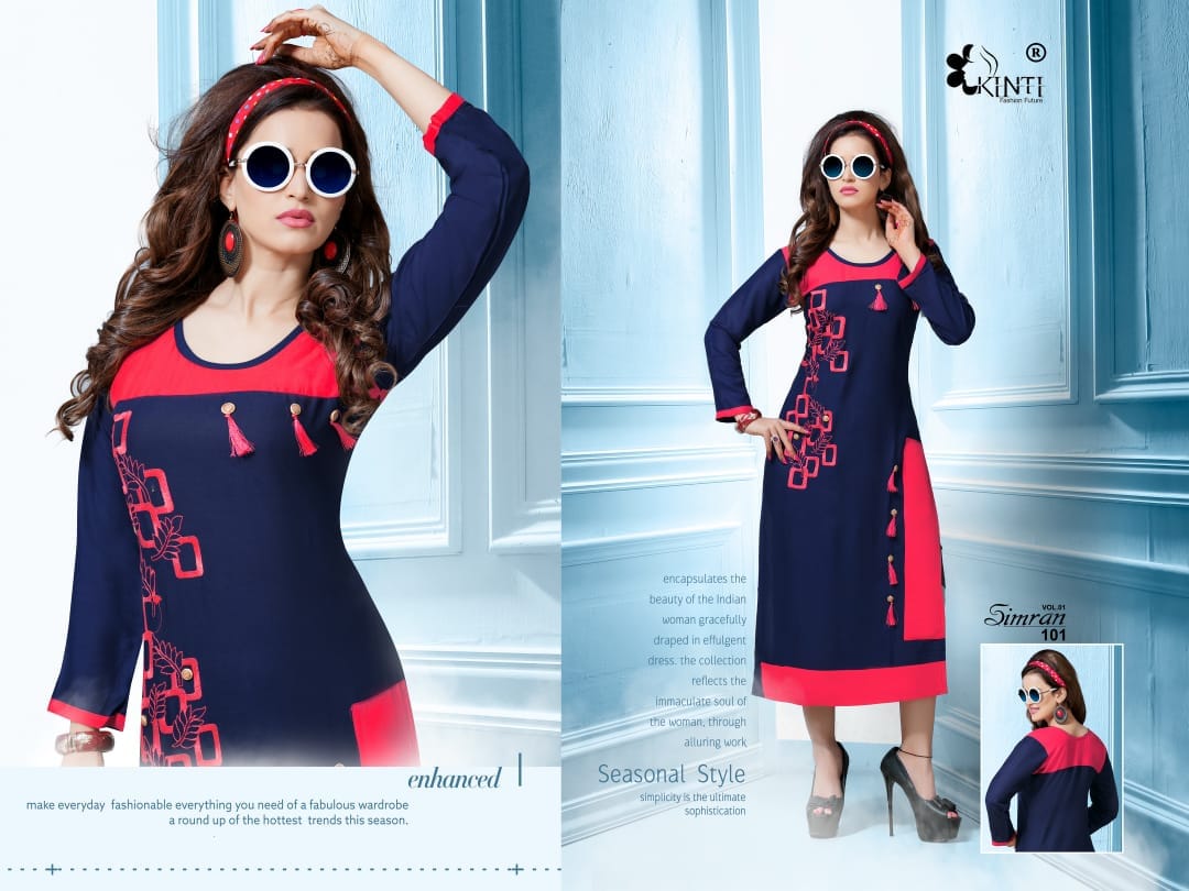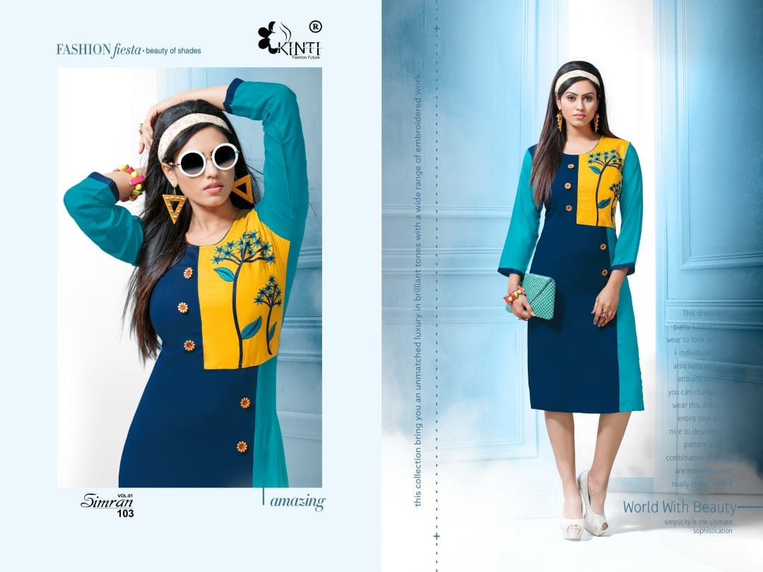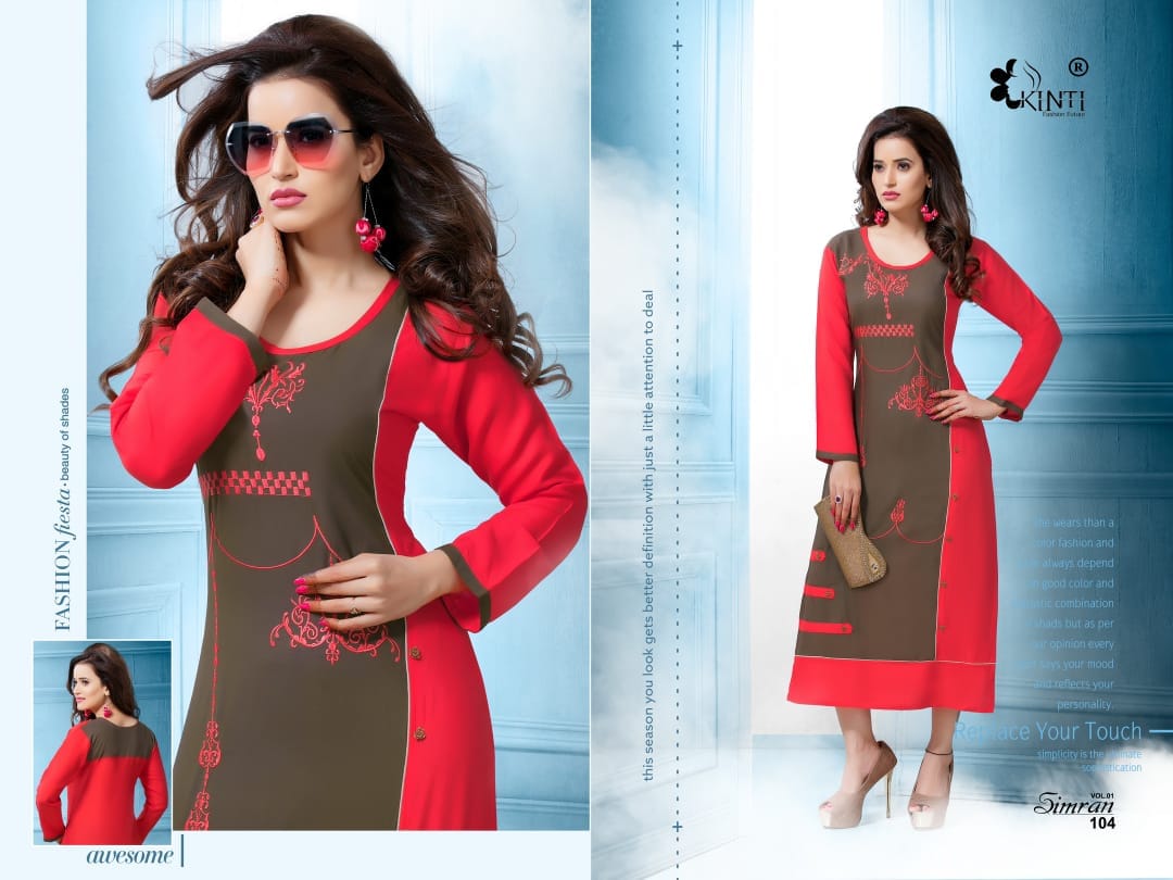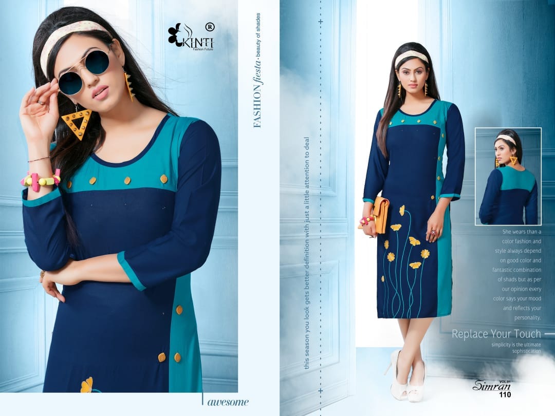 Buy Online Simran By Kinti Series 101 To 112 Heavy Reyon Fancy Embroidered Kurtis Wholesale Dealer And Supplier Surat 12 Pcs of Full Catalogue at Wholesale Price. Looking for Simran By Kinti Series 101 To 112 Heavy Reyon Fancy Embroidered Kurtis Wholesale Dealer And Supplier Surat Full Catalouge at Best Price? Buy Now Simran By Kinti Series 101 To 112 Heavy Reyon Fancy Embroidered Kurtis Wholesale Dealer And Supplier Surat at Wholesale Rate of Rs 4920 with Total 12 Pcs from authroized dealer and supplier of Kinti fashion future Brand. Cost of Each piece is just only Rs 410 which is very low and affordable price to resale the product in your retail store ,This is Surat based Wholesale Supplier & Dealer of Kinti fashion future Brand. Click on Brand name to Know more about Kinti fashion future Brand's products.Call or Whatsapp on 9898838984 for booking or enquiry