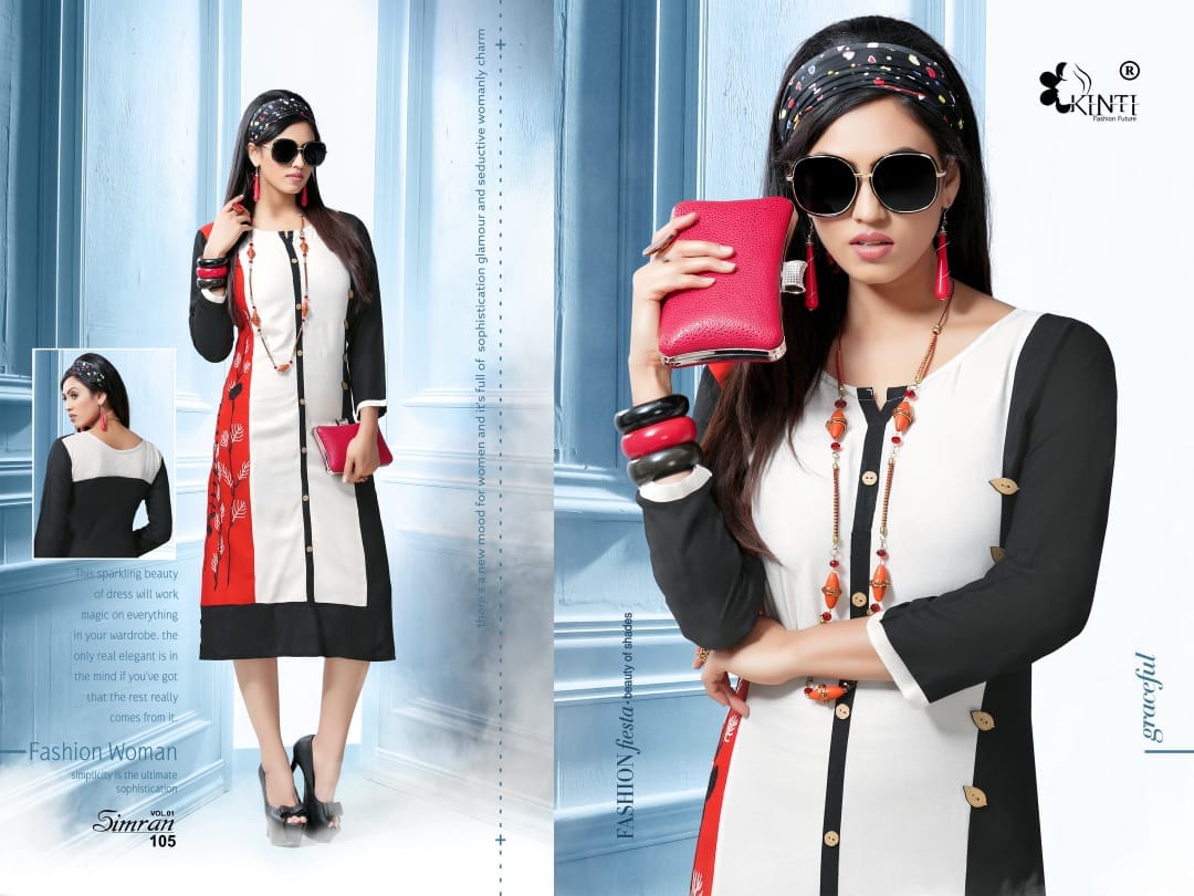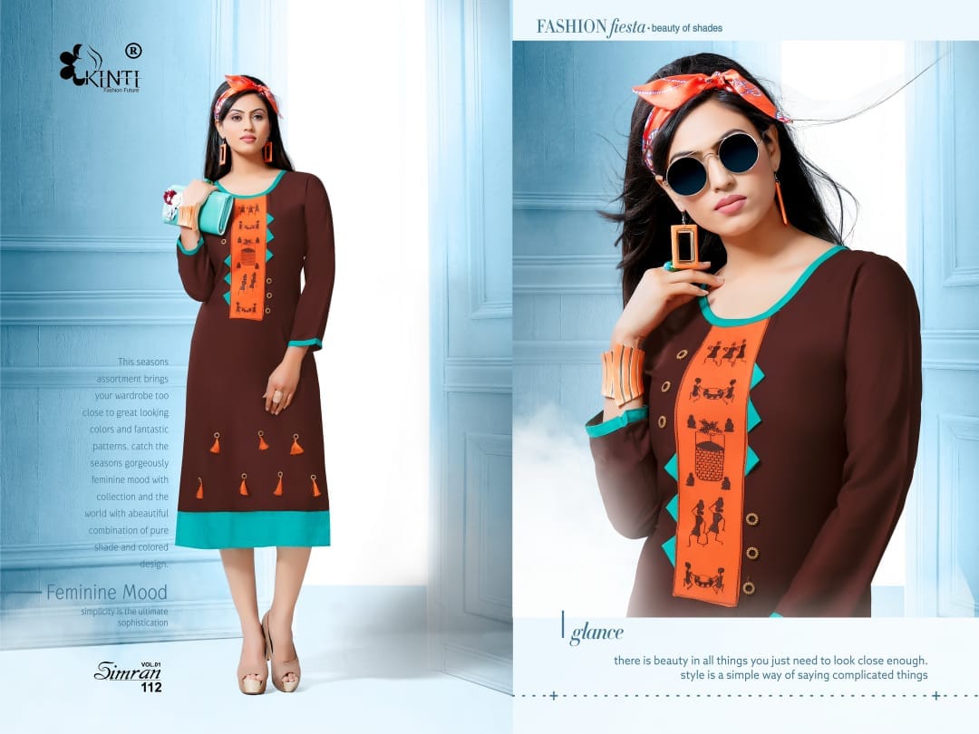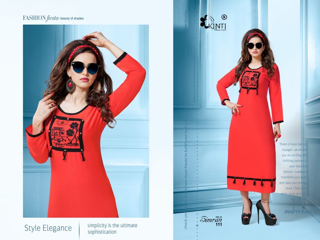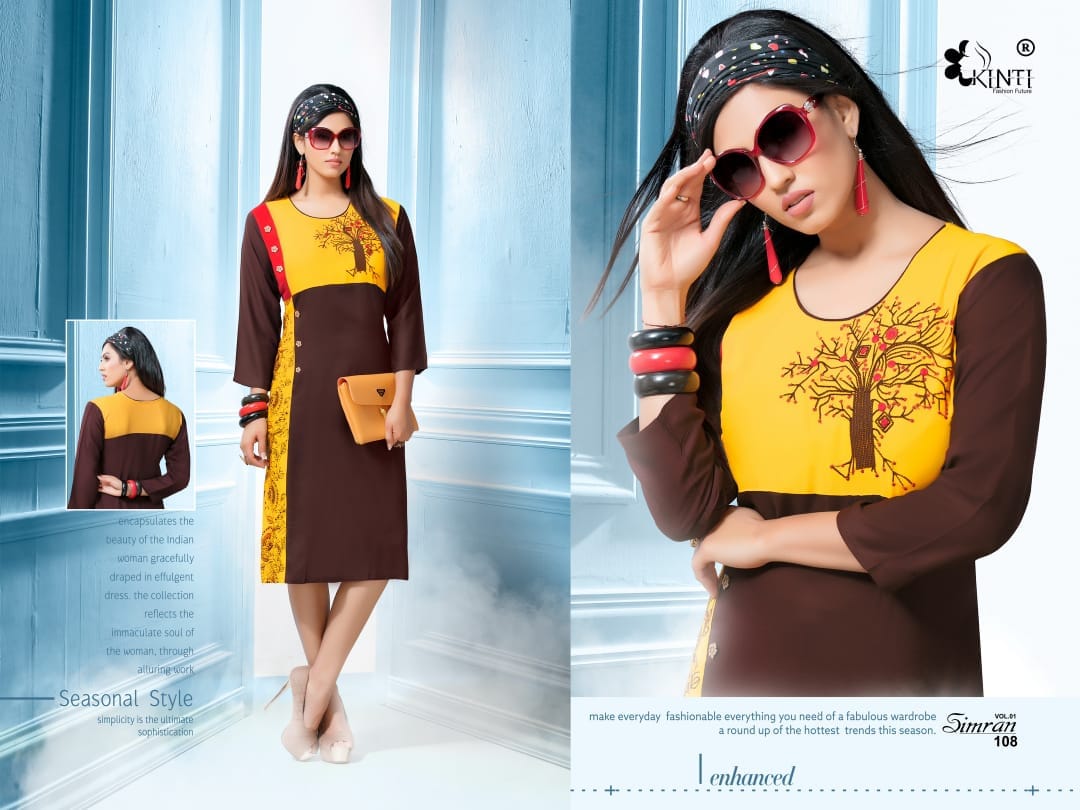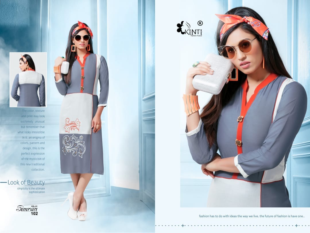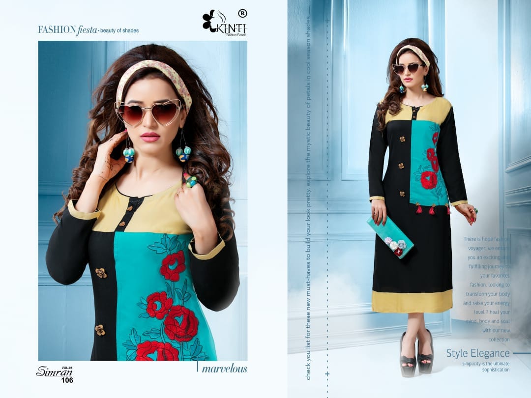 Buy Online Simran By Kinti Series 101 To 112 Heavy Reyon Fancy Embroidered Kurtis Wholesale Dealer And Supplier Surat 12 Pcs of Full Catalogue at Wholesale Price. Looking for Simran By Kinti Series 101 To 112 Heavy Reyon Fancy Embroidered Kurtis Wholesale Dealer And Supplier Surat Full Catalouge at Best Price? Buy Now Simran By Kinti Series 101 To 112 Heavy Reyon Fancy Embroidered Kurtis Wholesale Dealer And Supplier Surat at Wholesale Rate of Rs 4920 with Total 12 Pcs from authroized dealer and supplier of Kinti fashion future Brand. Cost of Each piece is just only Rs 410 which is very low and affordable price to resale the product in your retail store ,This is Surat based Wholesale Supplier & Dealer of Kinti fashion future Brand. Click on Brand name to Know more about Kinti fashion future Brand's products.Call or Whatsapp on 9898838984 for booking or enquiry