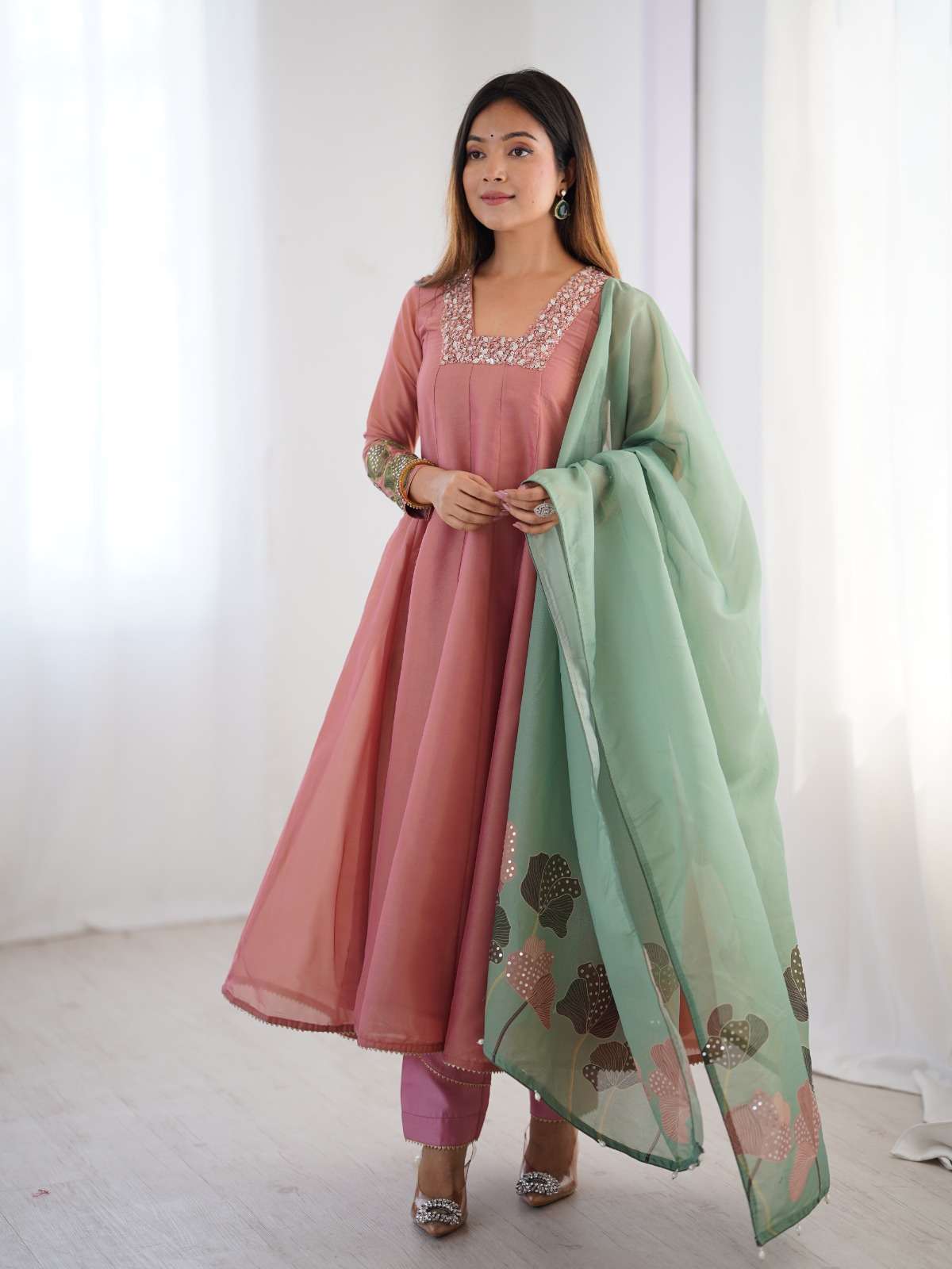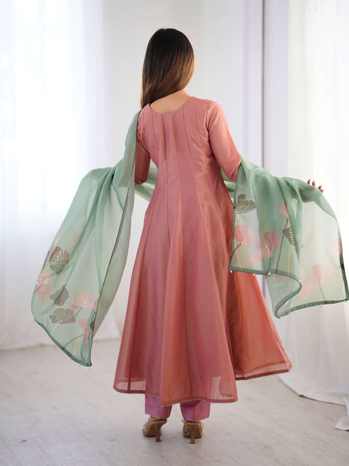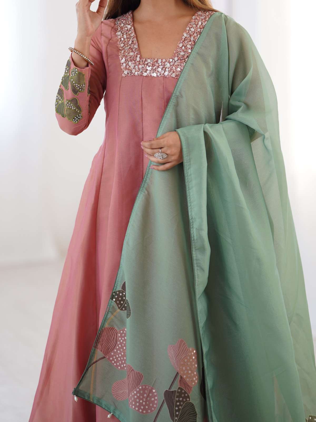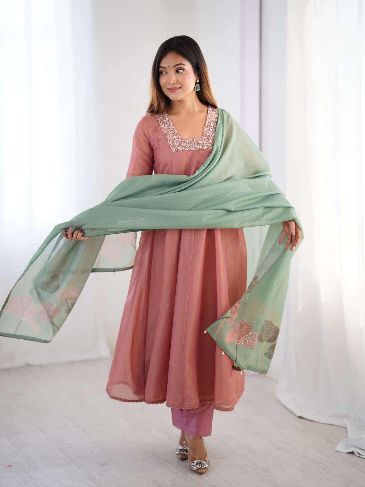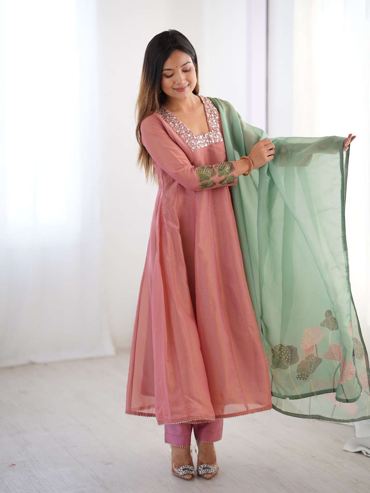 Work - Hand Work Includes - Top, Bottom, Dupatta Size - 34(XS), 36(S), 38(M), 40(L), 42(XL), 44(XXL) Fabric - Tissue Silk
