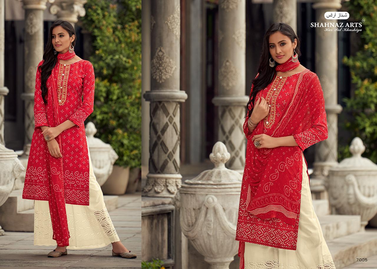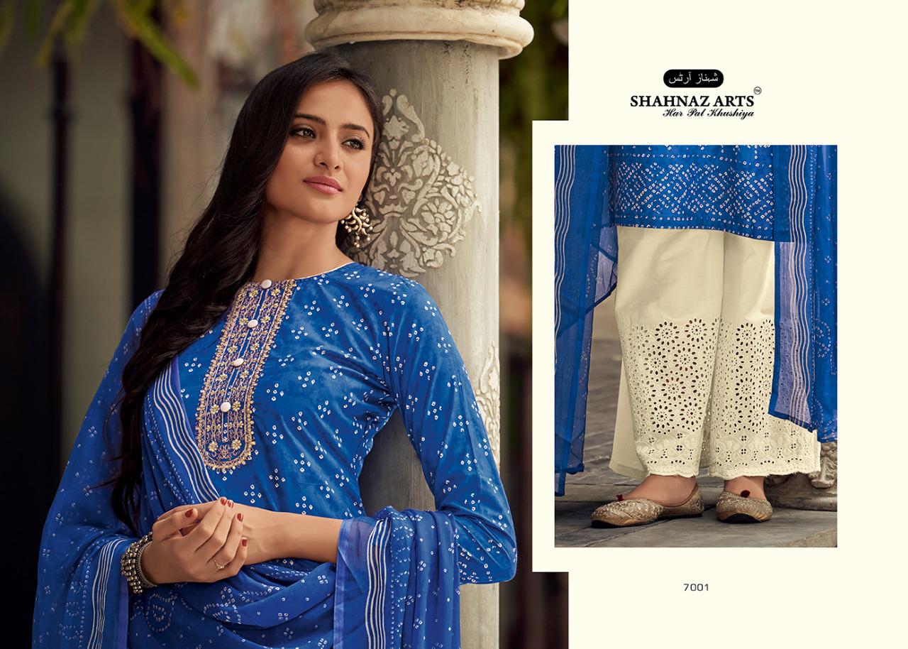 SIYAHI TOP PURE COTTON BANDHNI PRINT WITH CODING EMBRODERY WORK BOTTOM SEMILAWN SIFLI WORK DUPPTA SIFFON PRINT RATE 741 Shahnaz arts |
