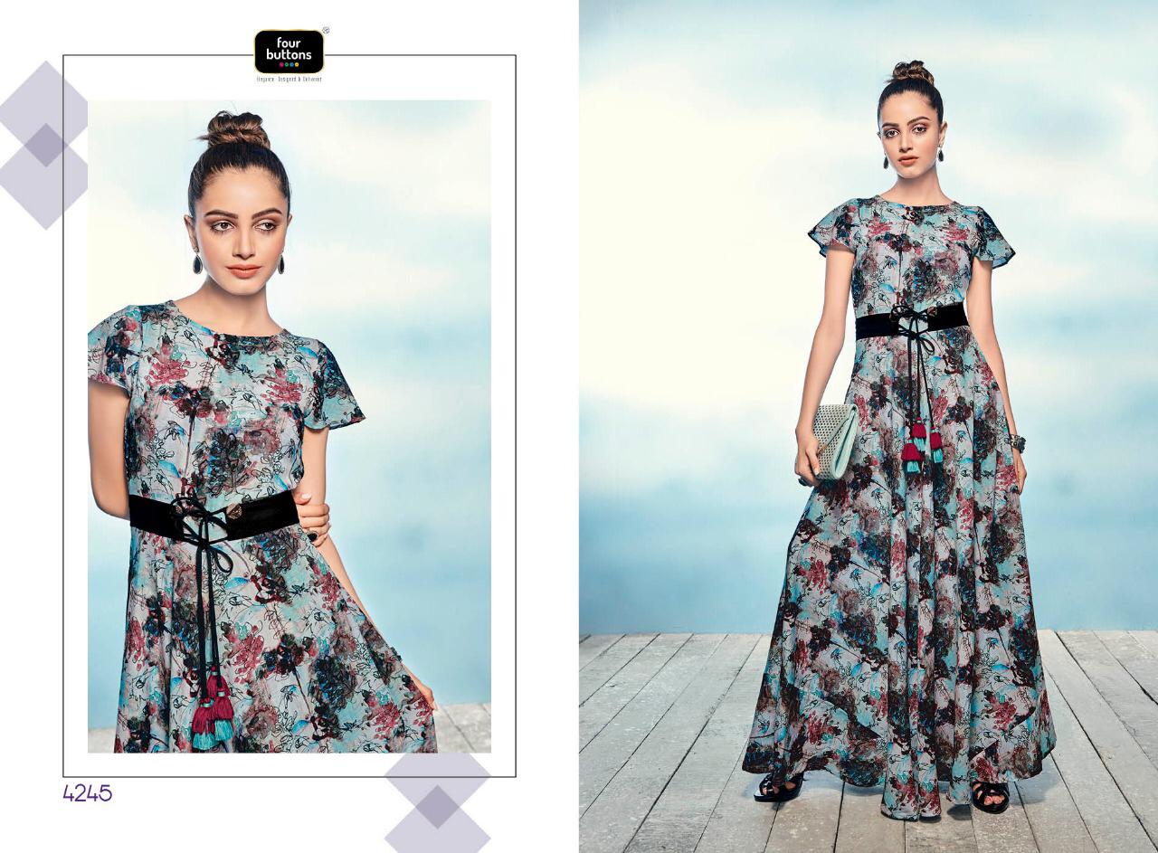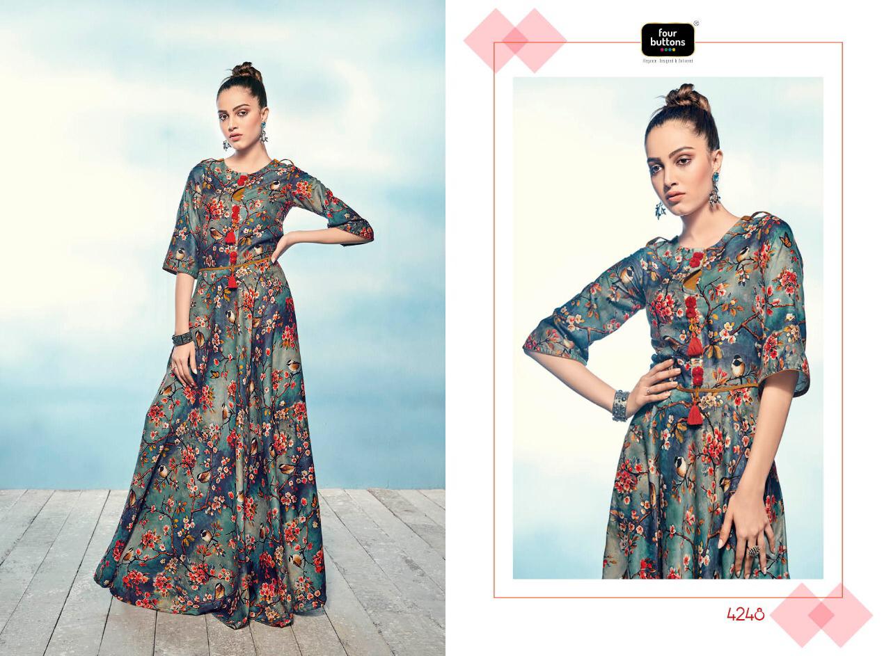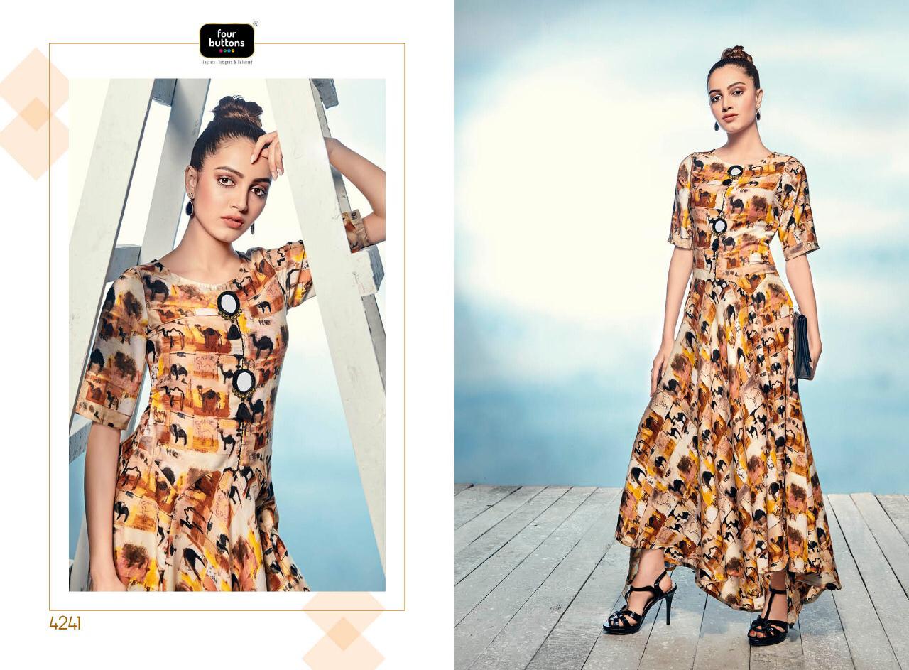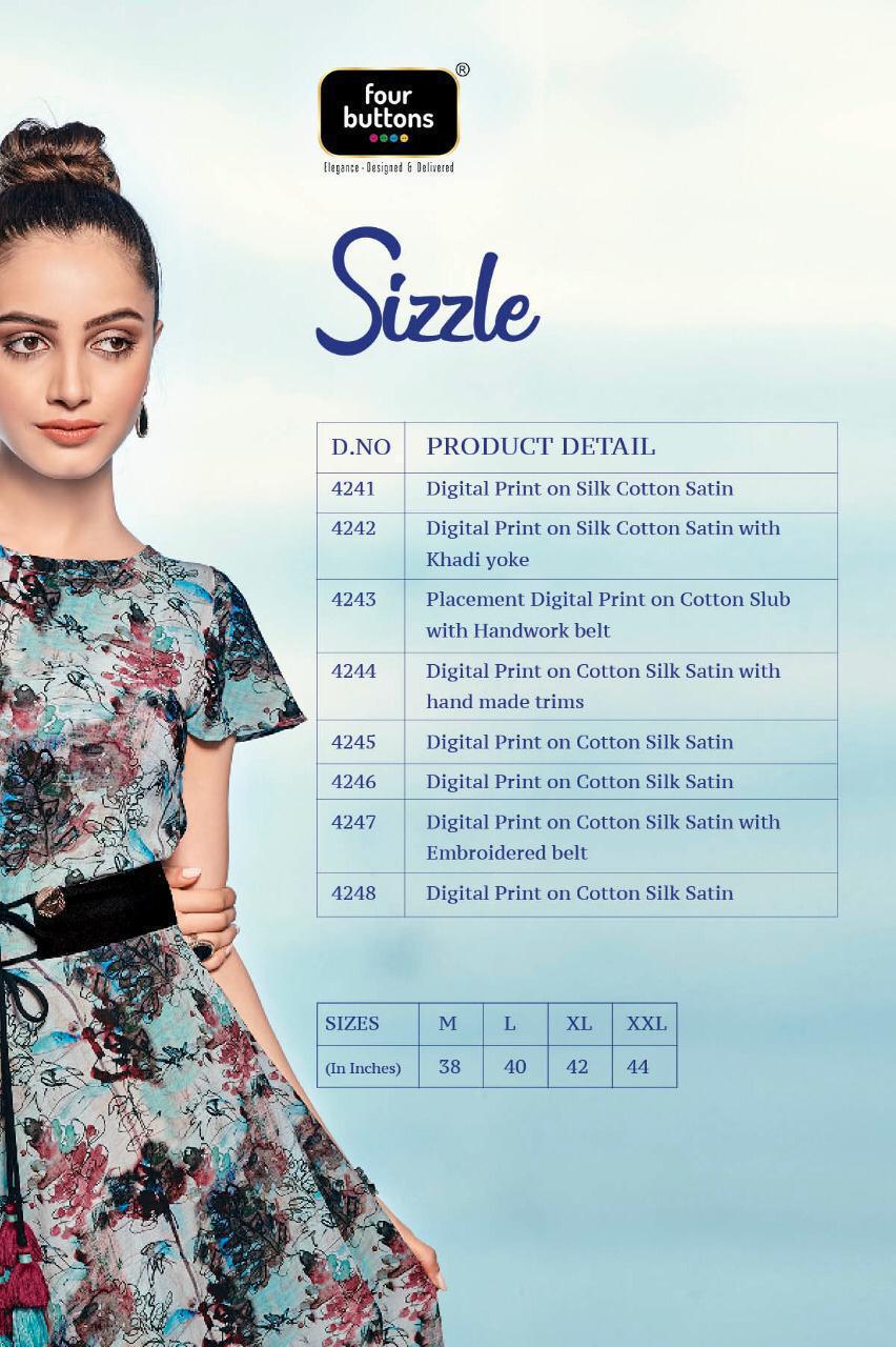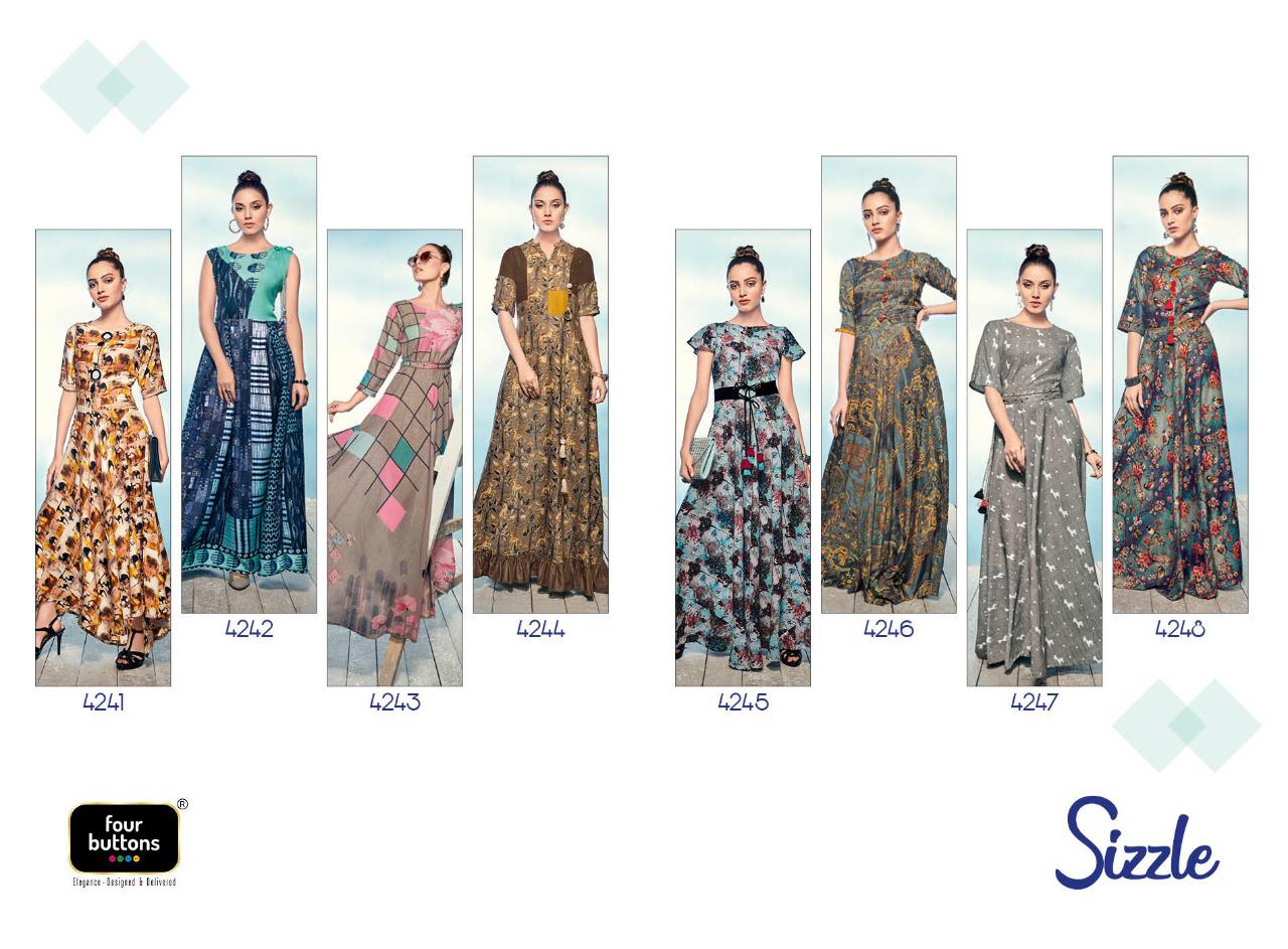 Buy Online Sizzle By Four Buttons 4241 Series Fancy Cotton Satin Silk Printed Gown Style Kurti Catlog Wholesaler Surat 8 Pcs of Full Catalogue at Wholesale Price. Looking for Sizzle By Four Buttons 4241 Series Fancy Cotton Satin Silk Printed Gown Style Kurti Catlog Wholesaler Surat Full Catalouge at Best Price? Buy Now Sizzle By Four Buttons 4241 Series Fancy Cotton Satin Silk Printed Gown Style Kurti Catlog Wholesaler Surat at Wholesale Rate of Rs 6384 with Total 8 Pcs from authroized dealer and supplier of FOUR BUTTONS Brand. Cost of Each piece is just only Rs 798 which is very low and affordable price to resale the product in your retail store ,This is Surat based Wholesale Supplier & Dealer of FOUR BUTTONS Brand. Click on Brand name to Know more about FOUR BUTTONS Brand's products.Call or Whatsapp on 9898838984 for booking or enquiry