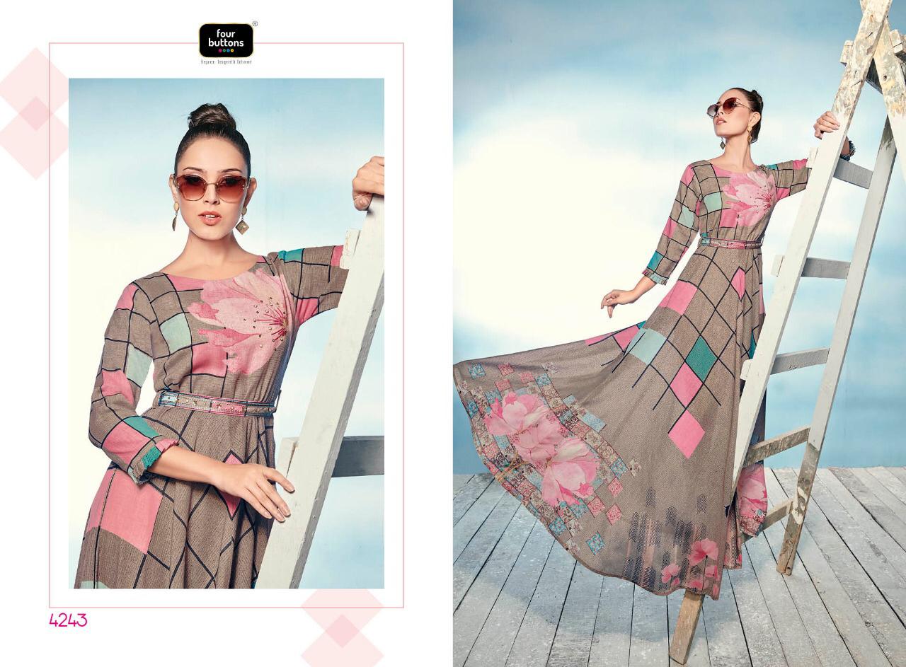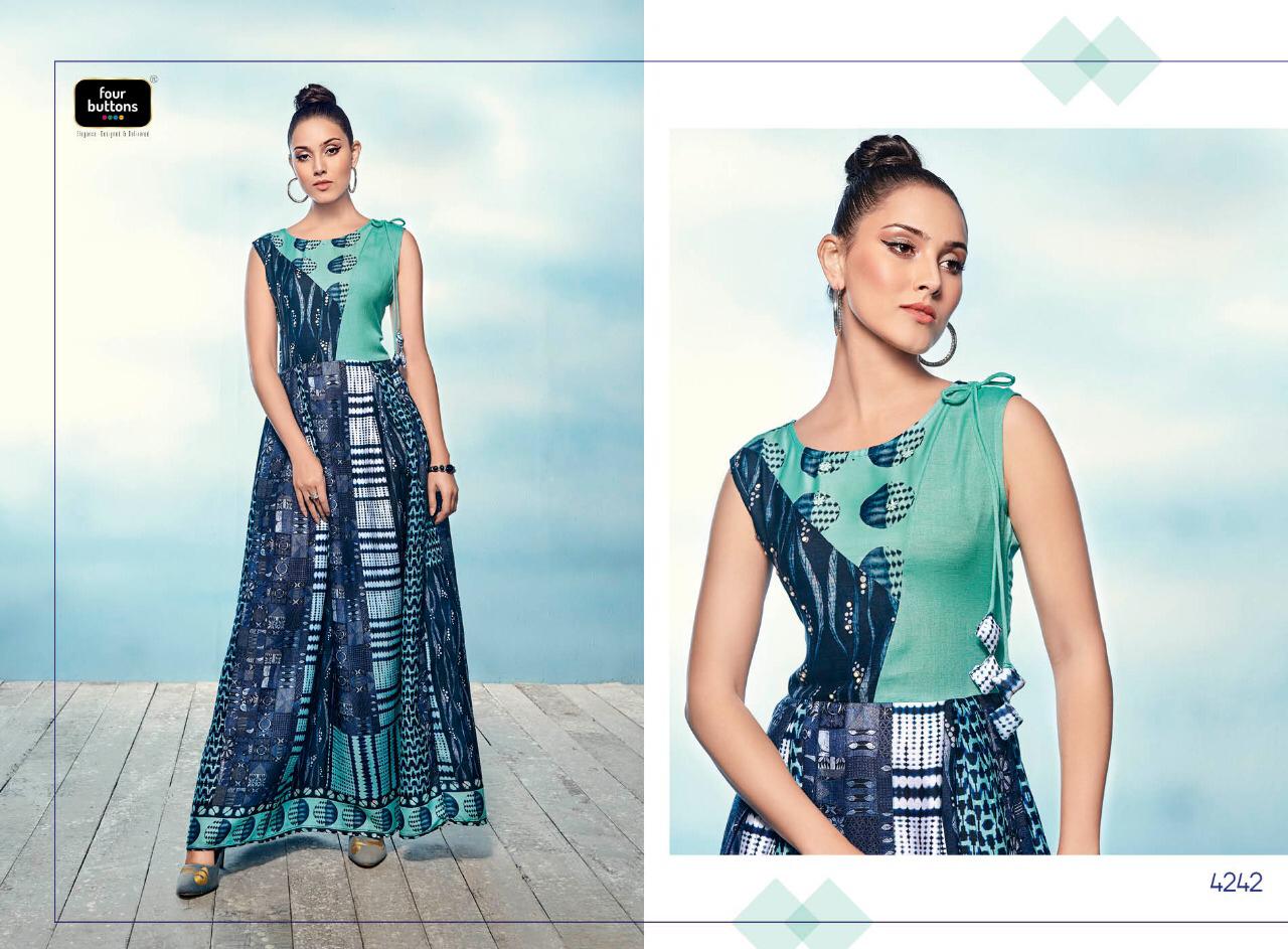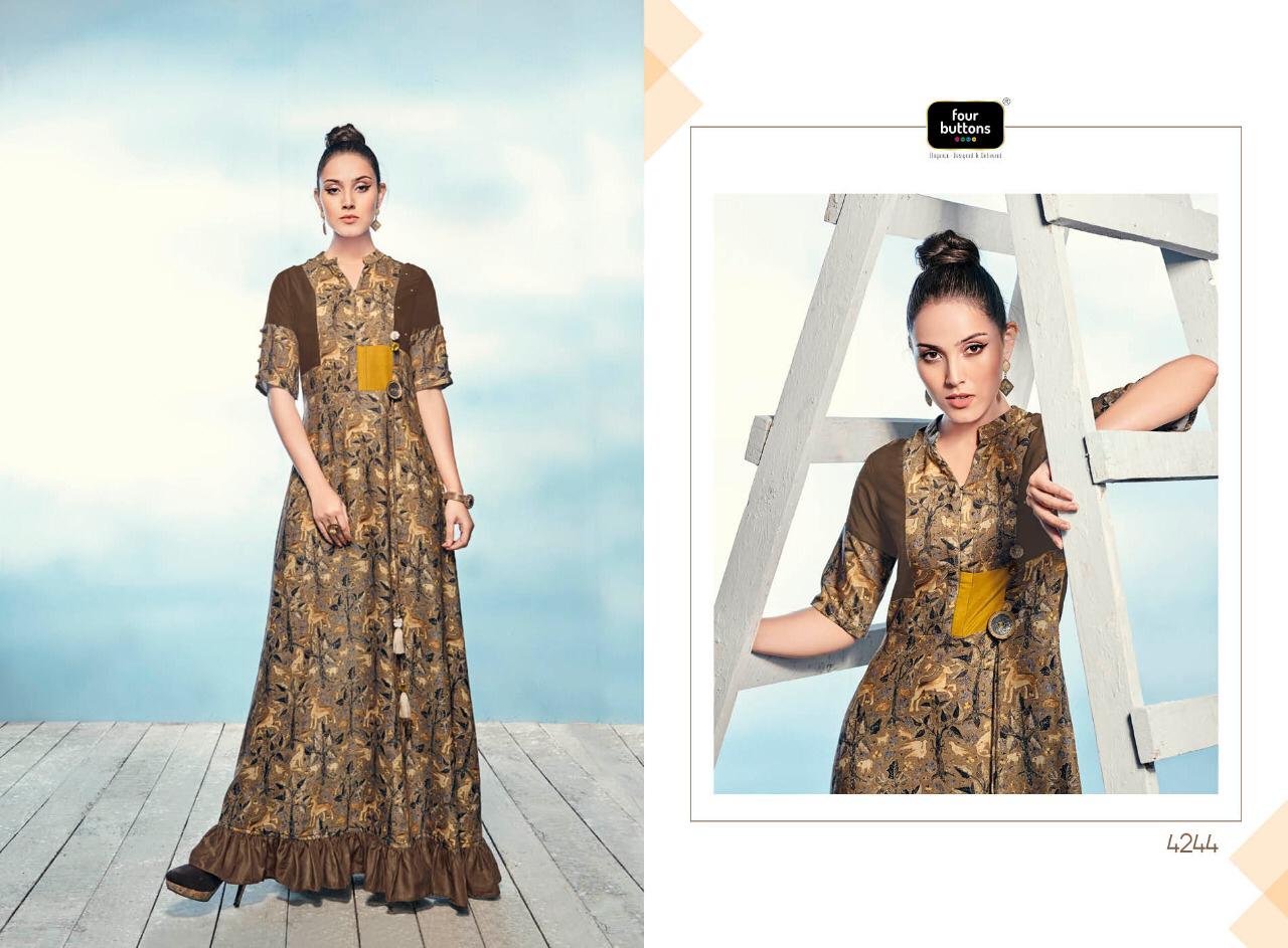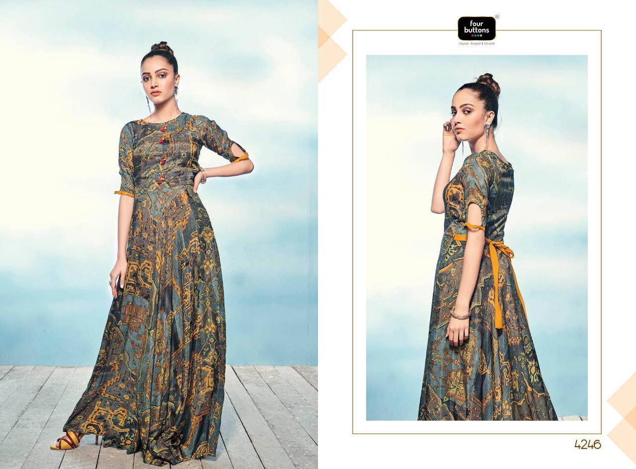 Buy Online Sizzle By Four Buttons 4241 Series Fancy Cotton Satin Silk Printed Gown Style Kurti Catlog Wholesaler Surat 8 Pcs of Full Catalogue at Wholesale Price. Looking for Sizzle By Four Buttons 4241 Series Fancy Cotton Satin Silk Printed Gown Style Kurti Catlog Wholesaler Surat Full Catalouge at Best Price? Buy Now Sizzle By Four Buttons 4241 Series Fancy Cotton Satin Silk Printed Gown Style Kurti Catlog Wholesaler Surat at Wholesale Rate of Rs 6384 with Total 8 Pcs from authroized dealer and supplier of FOUR BUTTONS Brand. Cost of Each piece is just only Rs 798 which is very low and affordable price to resale the product in your retail store ,This is Surat based Wholesale Supplier & Dealer of FOUR BUTTONS Brand. Click on Brand name to Know more about FOUR BUTTONS Brand's products.Call or Whatsapp on 9898838984 for booking or enquiry