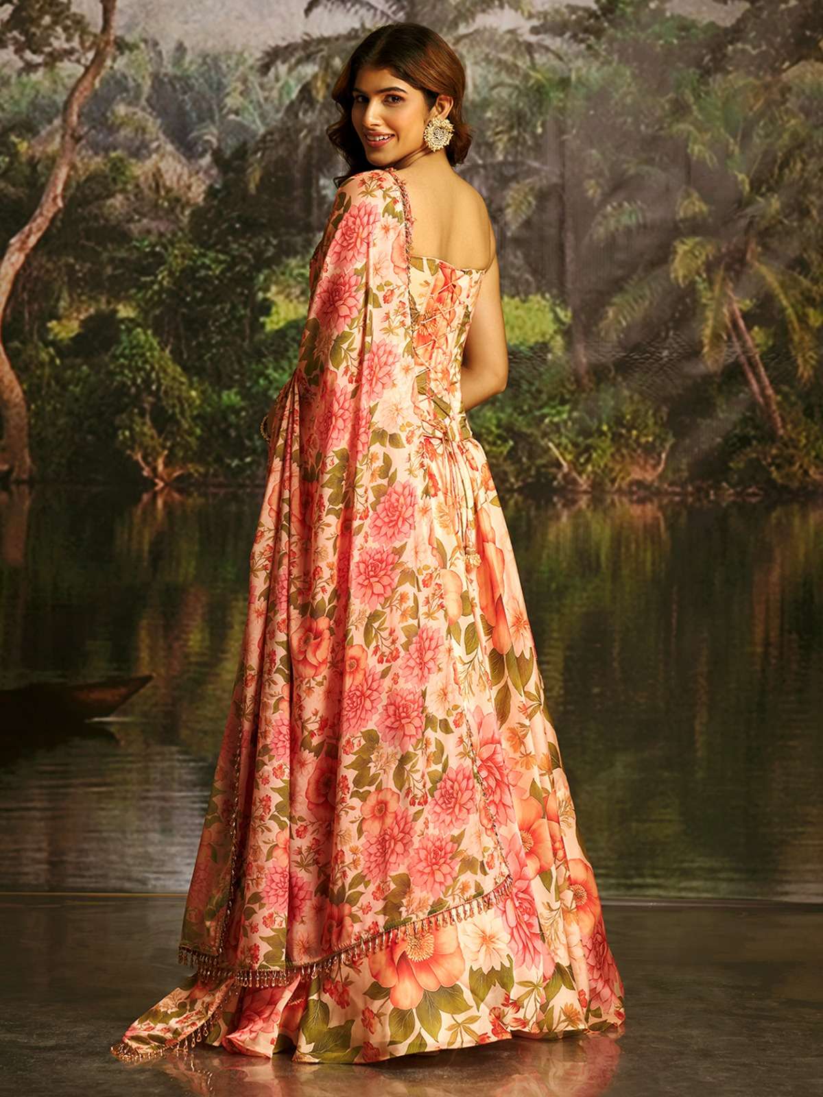 🎨 Color: Peach Color with Multicolor Floral Print ✨ Work: Fine Handwork Detailing Of Cut-dana & Antique-Sequins