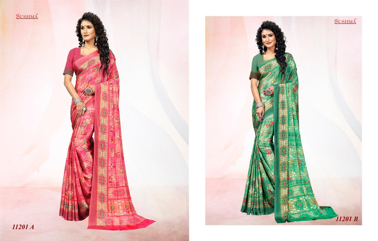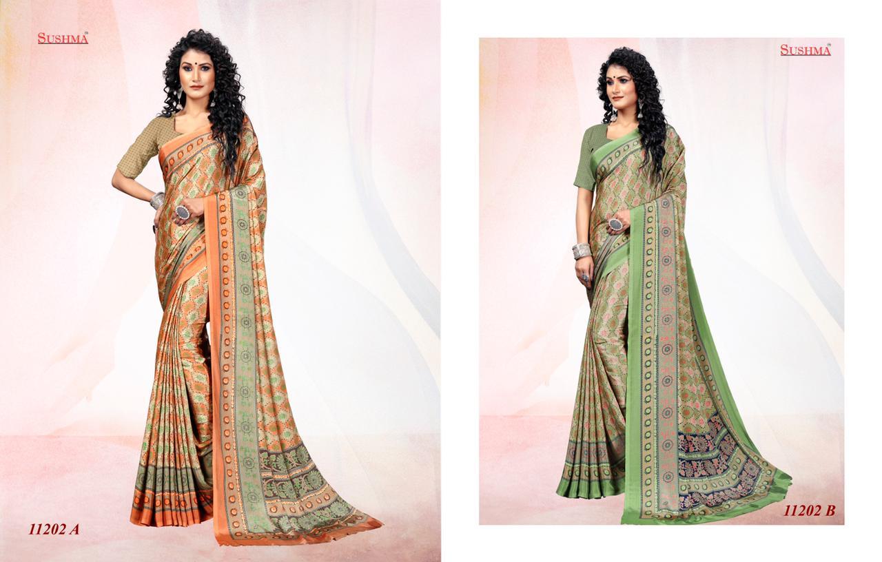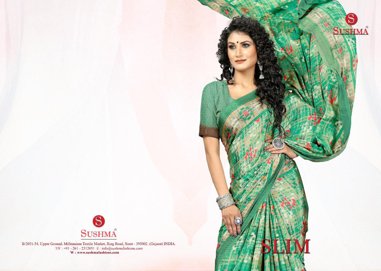 Brand - Sushma . SLIM CATALOG SLIM CRAPE 565/- 6.30 MTRS. 18 SAREES Set to set . GST 5 Percent Extra |