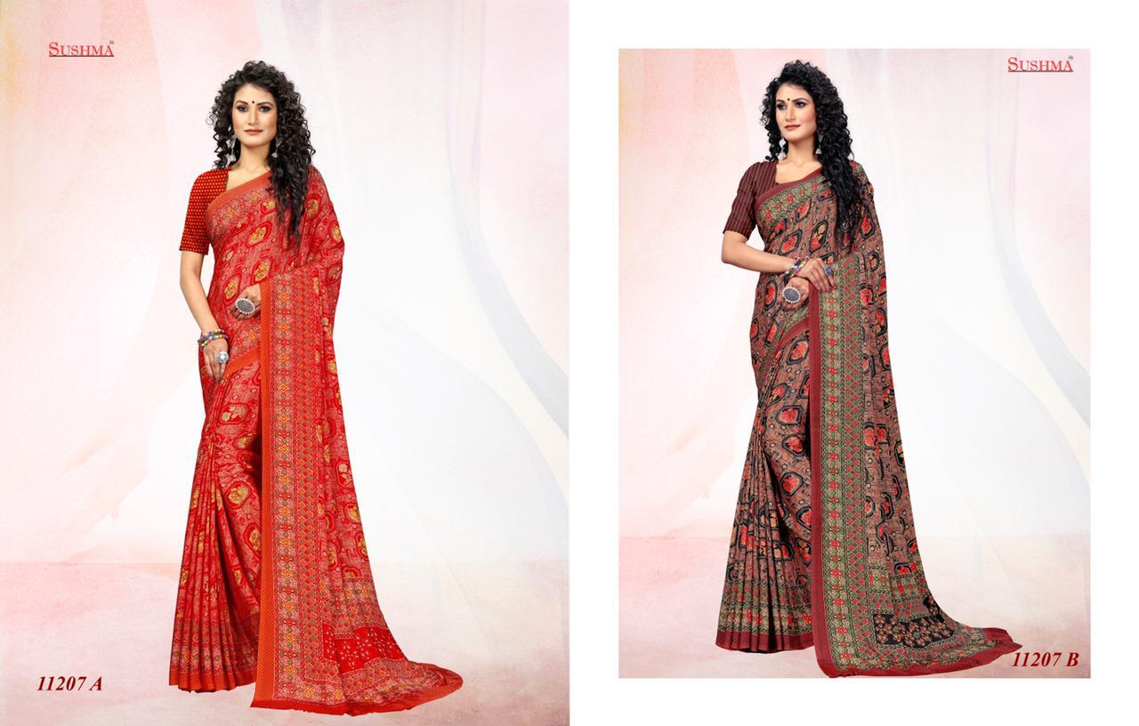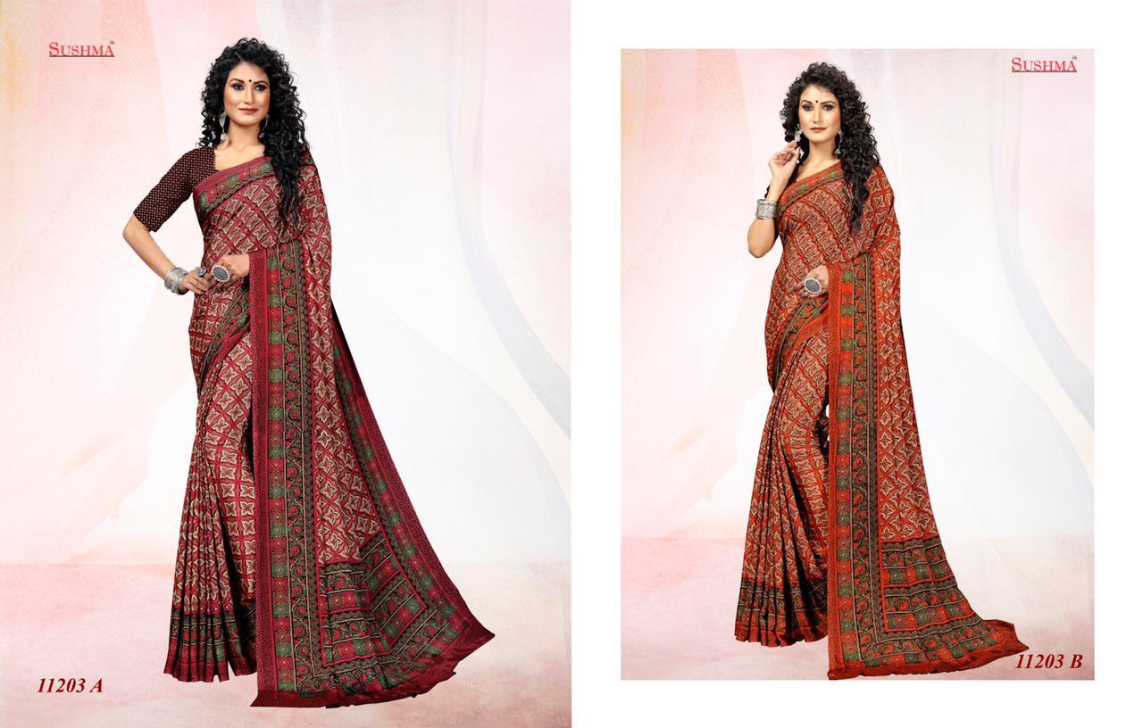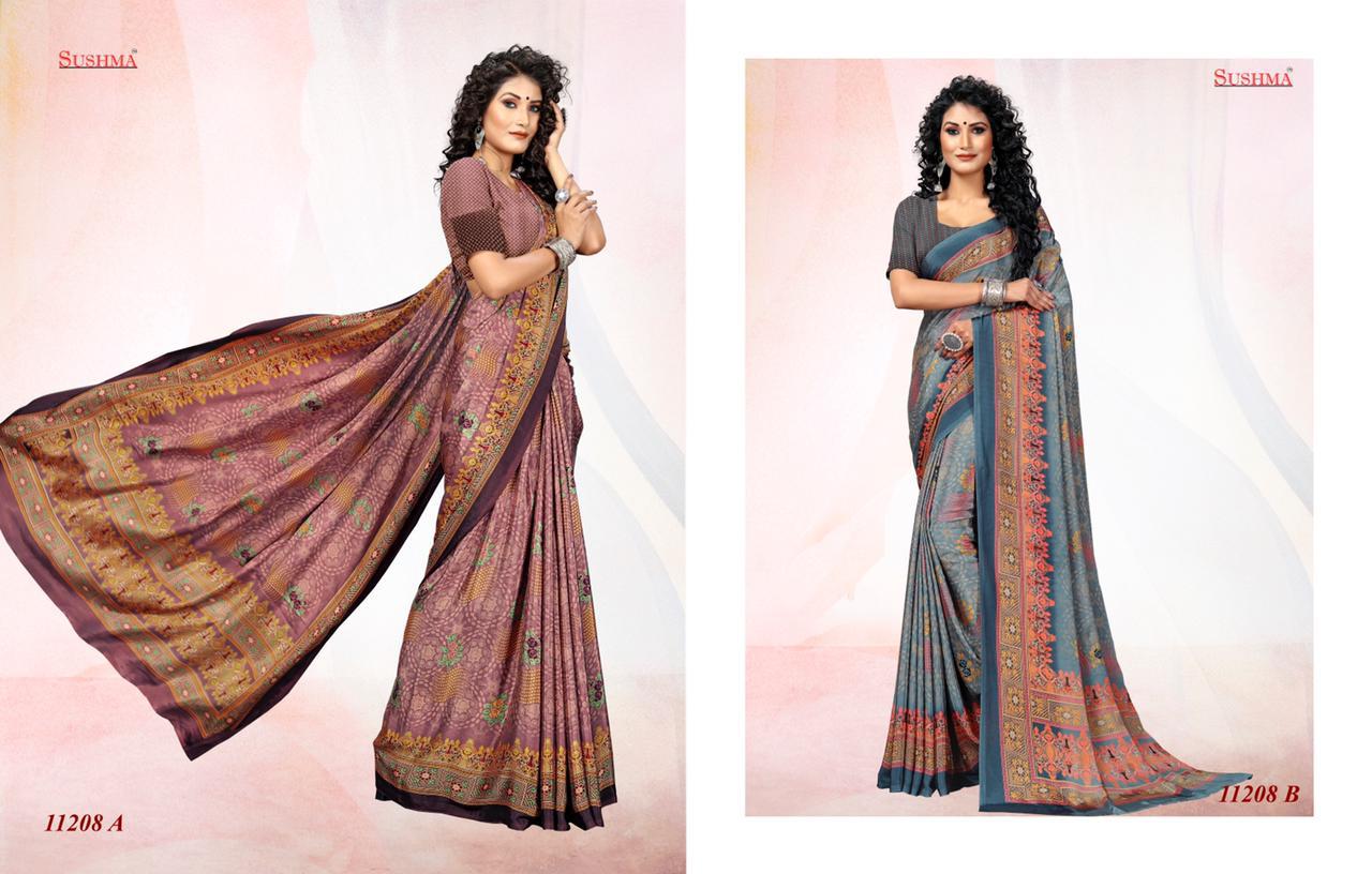 Brand - Sushma . SLIM CATALOG SLIM CRAPE 565/- 6.30 MTRS. 18 SAREES Set to set . GST 5 Percent Extra |