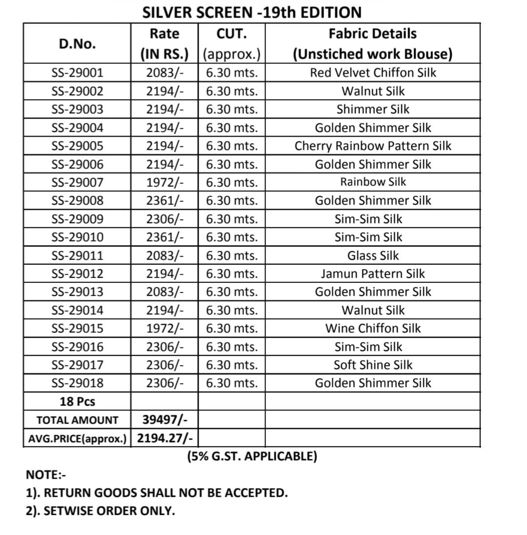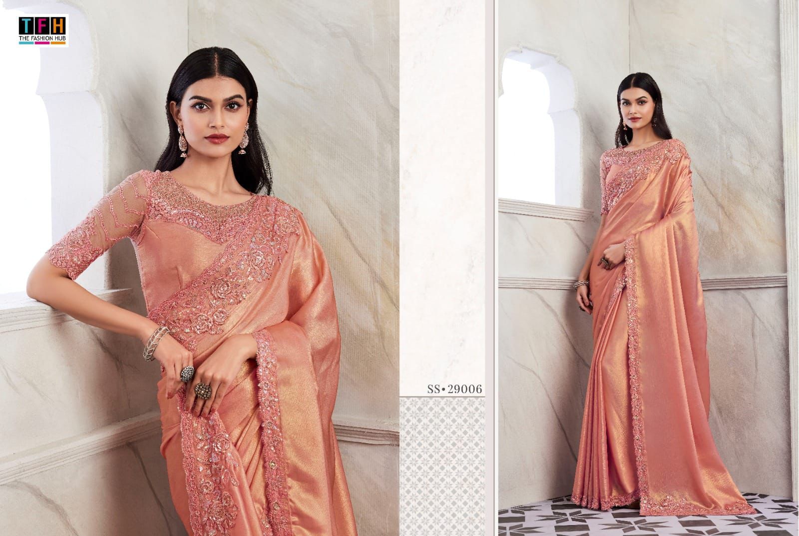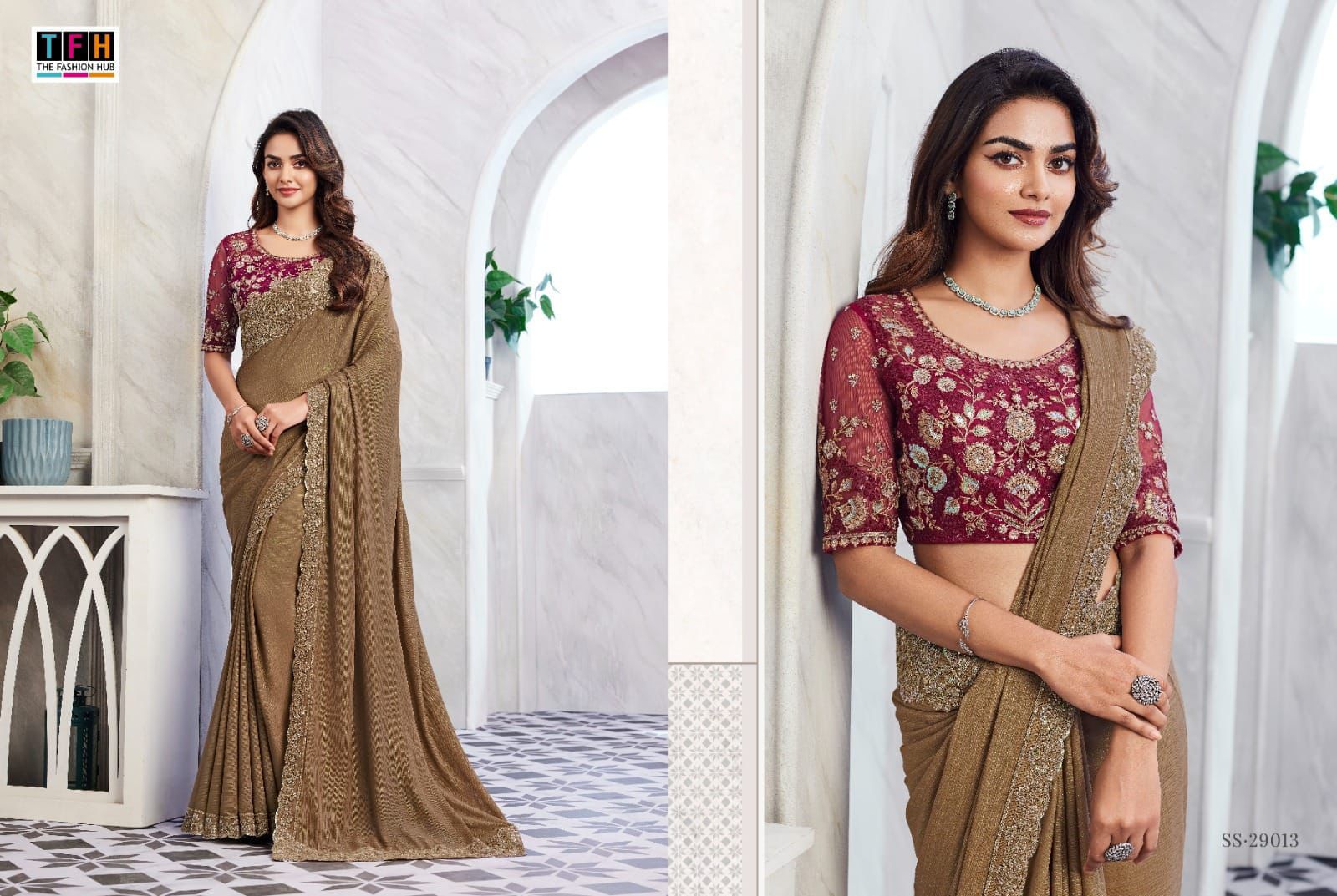 Buy Online Sliver Screen 19 Series 29001 To 29018 By Tfh Stylish Sarees 18 Pcs of Full Catalogue at Wholesale Price. Looking for Sliver Screen 19 Series 29001 To 29018 By Tfh Stylish Sarees Full Catalouge at Best Price? Buy Now Sliver Screen 19 Series 29001 To 29018 By Tfh Stylish Sarees at Wholesale Rate of Rs 0 with Total 18 Pcs from authroized dealer and supplier of TFH Brand. Cost of Each piece is just only Rs 0 which is very low and affordable price to resale the product in your retail store ,This is Surat based Wholesale Supplier & Dealer of TFH Brand. Click on Brand name to Know more about TFH Brand's products.Call or Whatsapp on 9898838984 for booking or enquiry
