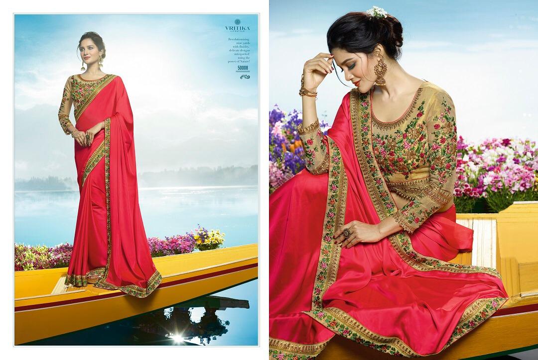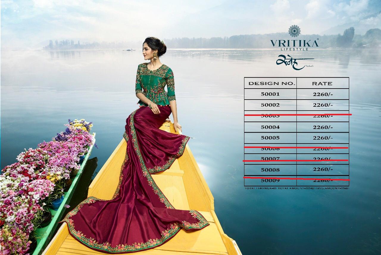 Buy Online Sneh Vol 5 By Vritika Series 50001 To 50009 Fancy Designer Party Wear Sarees Wholesale Supplier Gujarat 9 Pcs of Full Catalogue at Wholesale Price. Looking for Sneh Vol 5 By Vritika Series 50001 To 50009 Fancy Designer Party Wear Sarees Wholesale Supplier Gujarat Full Catalouge at Best Price? Buy Now Sneh Vol 5 By Vritika Series 50001 To 50009 Fancy Designer Party Wear Sarees Wholesale Supplier Gujarat at Wholesale Rate of Rs 20340 with Total 9 Pcs from authroized dealer and supplier of VRITIKA LIFESTYLE Brand. Cost of Each piece is just only Rs 2260 which is very low and affordable price to resale the product in your retail store ,This is Surat based Wholesale Supplier & Dealer of VRITIKA LIFESTYLE Brand. Click on Brand name to Know more about VRITIKA LIFESTYLE Brand's products.Call or Whatsapp on 9898838984 for booking or enquiry