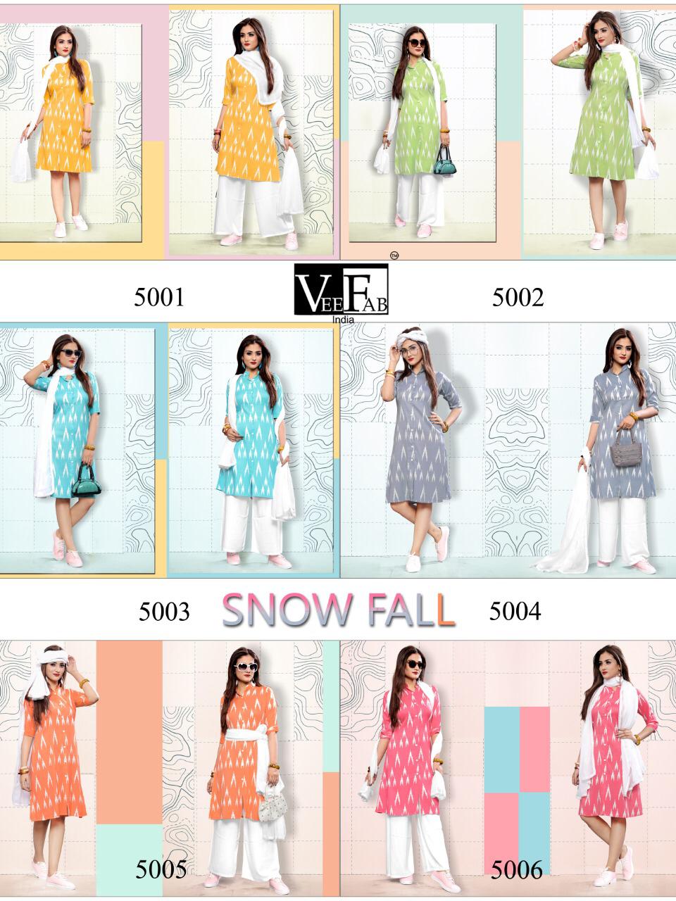Buy Online Snow Fall By Vee Fab India Reyon Kurtis With Duppta Wholesale Supplier And Dealer Surat 6 Pcs of Full Catalogue at Wholesale Price. Looking for Snow Fall By Vee Fab India Reyon Kurtis With Duppta Wholesale Supplier And Dealer Surat Full Catalouge at Best Price? Buy Now Snow Fall By Vee Fab India Reyon Kurtis With Duppta Wholesale Supplier And Dealer Surat at Wholesale Rate of Rs 3240 with Total 6 Pcs from authroized dealer and supplier of Veefab india Brand. Cost of Each piece is just only Rs 540 which is very low and affordable price to resale the product in your retail store ,This is Surat based Wholesale Supplier & Dealer of Veefab india Brand. Click on Brand name to Know more about Veefab india Brand's products.Call or Whatsapp on 9898838984 for booking or enquiry