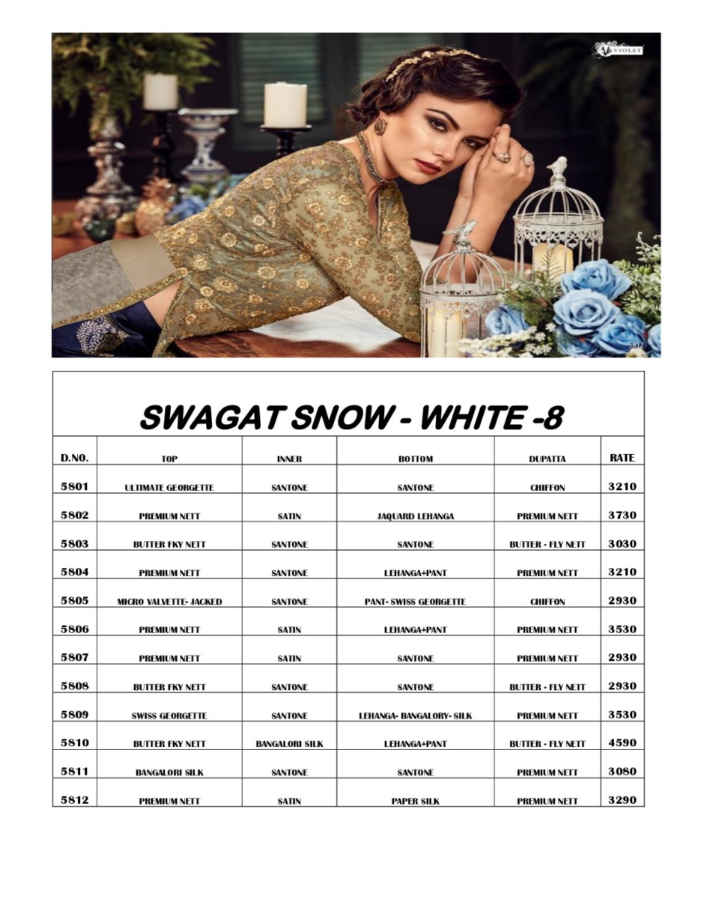 Brand - Swagat. Catlog name - Snow White -8. Series -5801 to 5812 Set & Loose . Single and multipal available GST 5 Percent Extra. Delivery date -26-09-18. Book your order. For singleÂ?s price call or whatsapp on +919898838984 |
