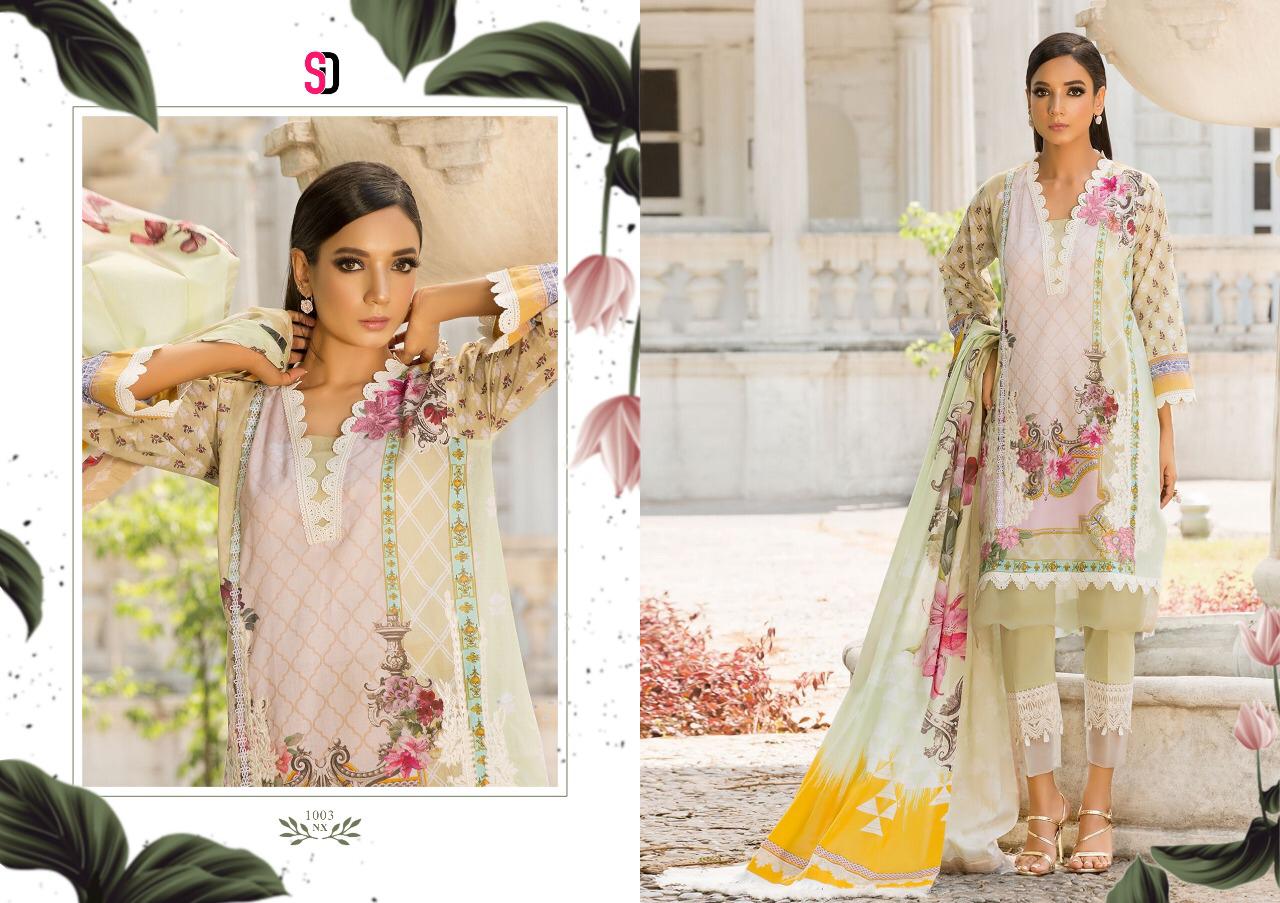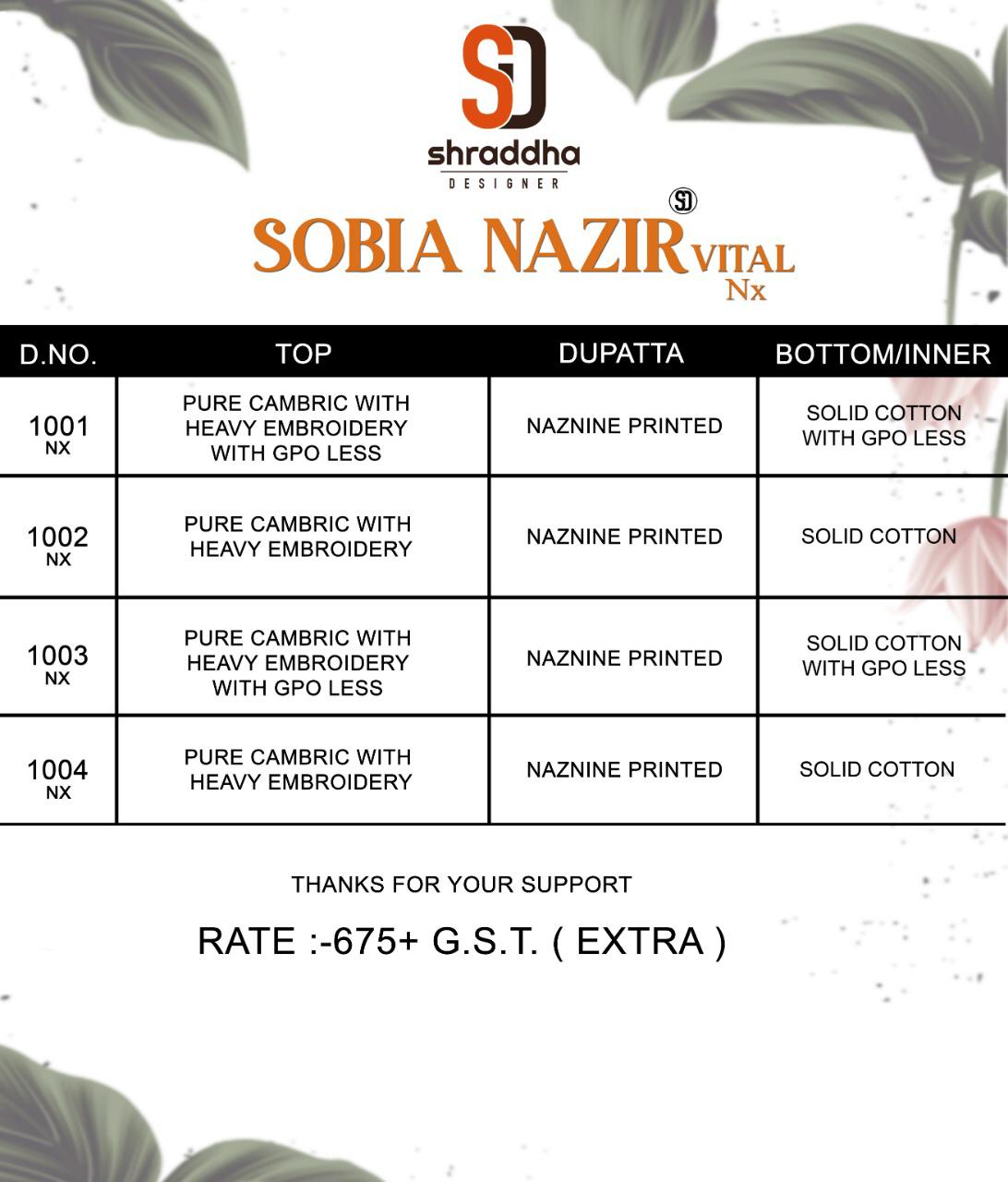 *SHARADDHA DESIGNER* is happy to announce the launch of new catalog. *?SOBIA NAZIR VITAL NX?* ? Catalogue Name :- *SOBIA NAZIR VITAL NX* ?Description? ?Top: PURE COTTON PRINT HEAVY EMBROIDERY WITH D.NO. 1001/1003 GPO LESS ?Bottom- SOLID COTTON PRINT With GPO LESS ?Dupp: NAZMINE PRINT WITH INTER LOOK ?Beautiful : 4 DESIGNS RATE- *675* Gst extra Set To Set . GST 5 Percent Extra. Delivery 4-5 days Regards, SHARADDHA DESIGNER FIRST COME FIRST DISPATCH |
