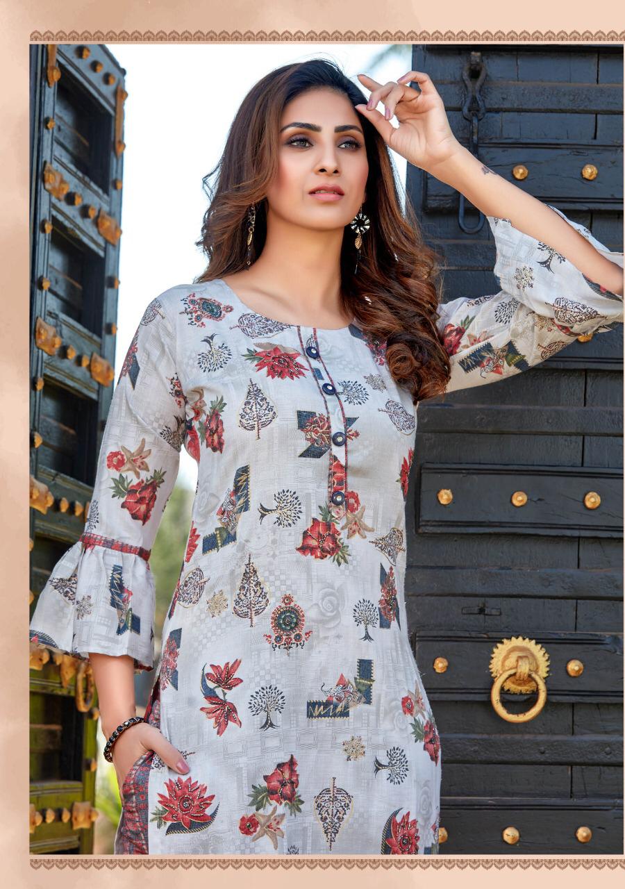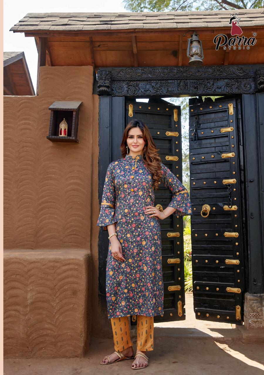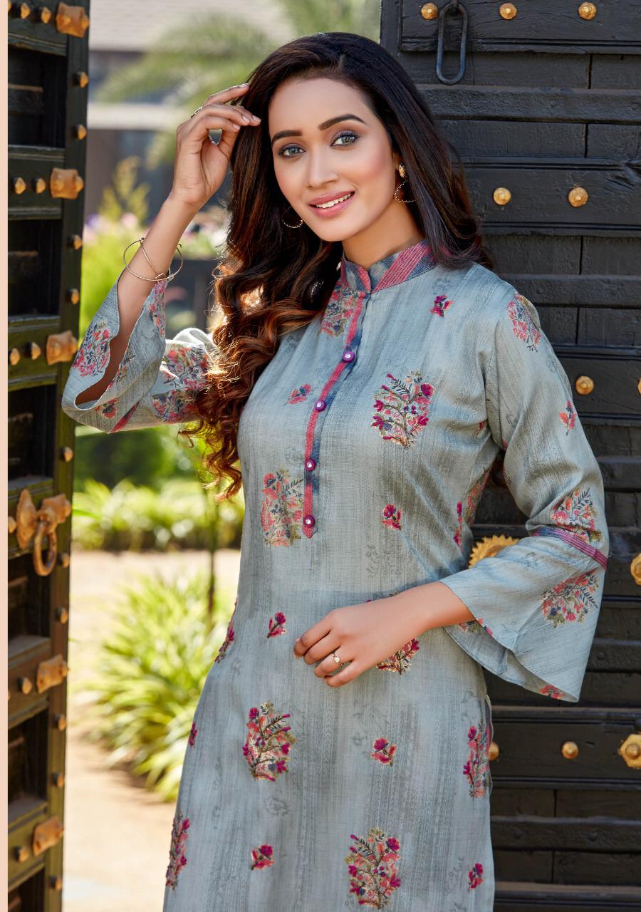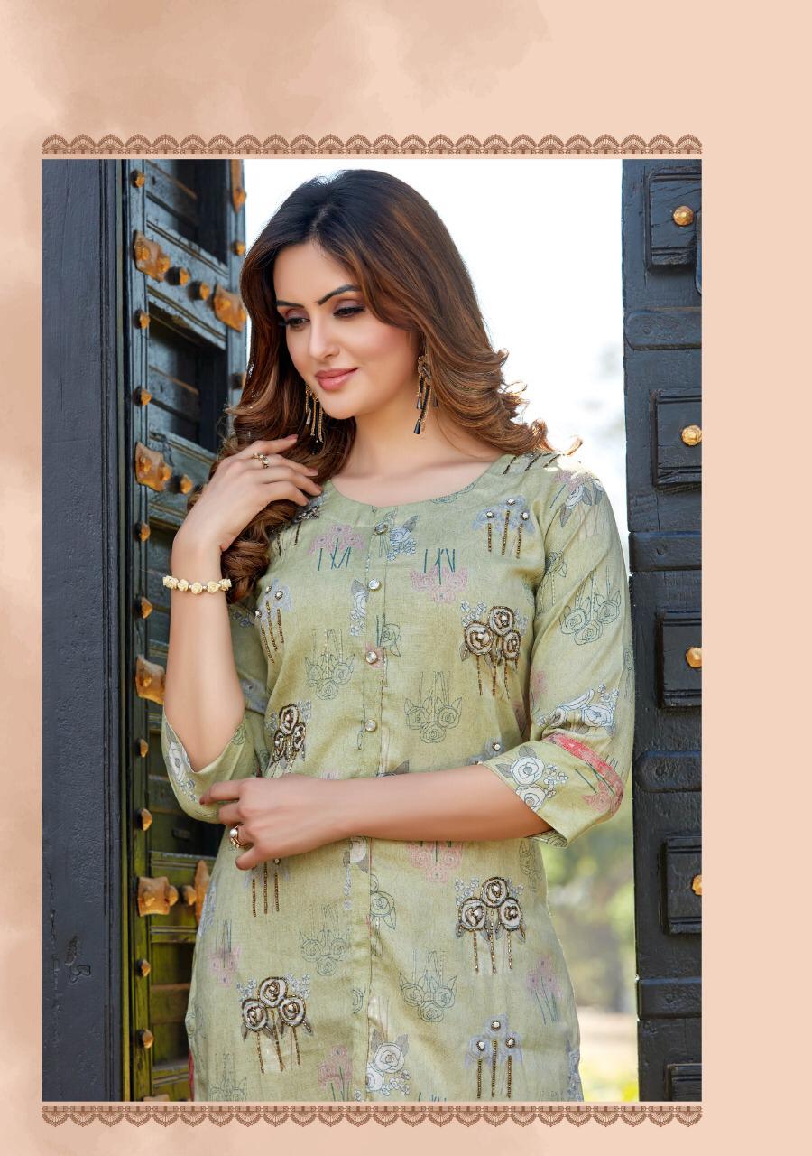 ## *PARRA STUDIO* ## Hello Sir/Madam For This Season Exclusive Designers Kurties *SOFIA VOL 1* Catalogue is Coming Soon. *2 PCS CONCEPT* *7 KURTIES* With *PENT* And Beautiful Catalogue Having Designer Concepts. ? *FABRICS* ? TOP. :- *PURE REYAN FOIL MILL PRINT WITH KHATLI WORK* PENT :- *PURE REYAN FOIL MILL PRINT WITH POCKET* ?Size - *M (38)* *L (40)* *XL (42)* *XXL (44)* *3XL (46)* Lenght - *46*" ?Rate - *720/- ? 5% GST* So Please Hurry up Book ur Orders Now.... Set to set . * Delivery 7-8 days * ?Thanks For ur Kind Support.? *REGARDS* *RANGAT ART* |