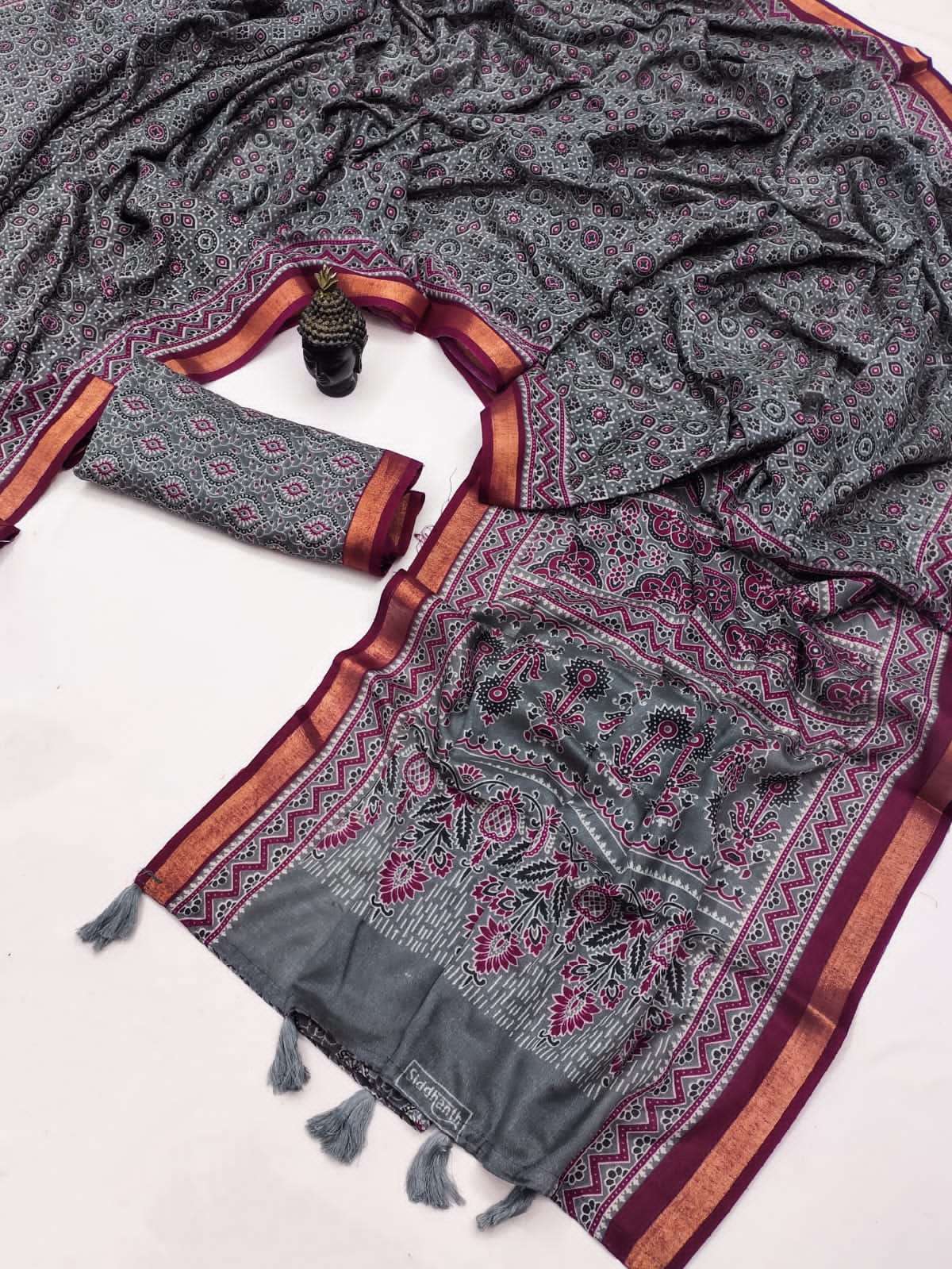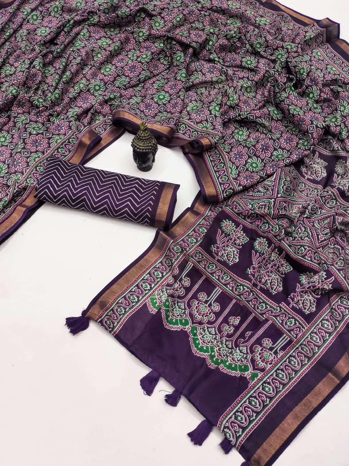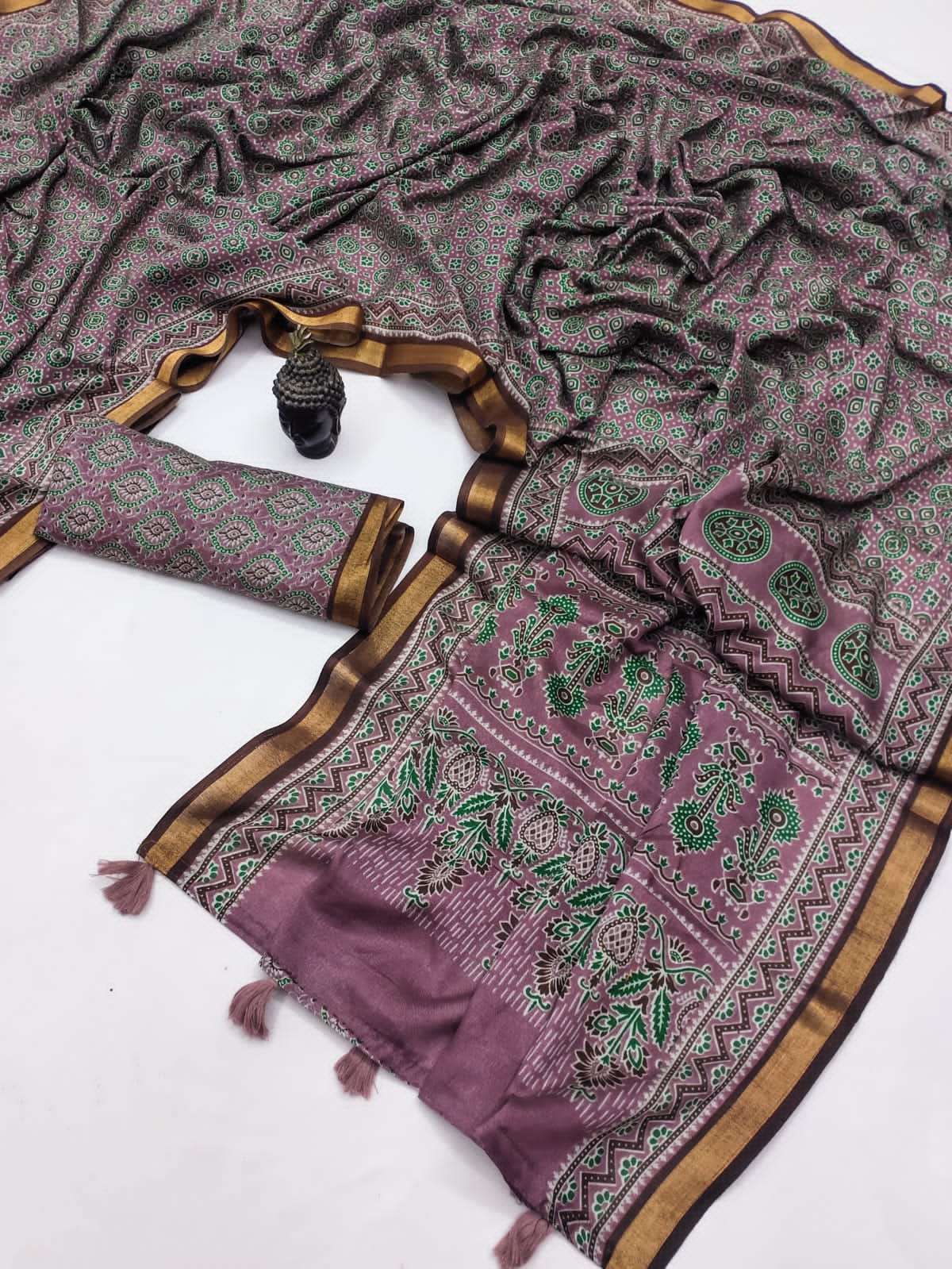 Presenting the graceful Soft Mal Mal Cotton Ajrakh Print Saree, designed for comfort and everyday elegance. Crafted from soft mal mal cotton fabric, this saree is lightweight, breathable, and perfect for all-day wear. The saree features beautiful Ajrakh-inspired prints all over, giving it a traditional yet stylish look. It is enhanced with a fancy floral printed pallu that adds a charming highlight to the design. Paired with a running blouse piece, this saree creates a simple yet elegant ethnic outfit suitable for casual wear, office wear, and small gatherings. Product Highlights: