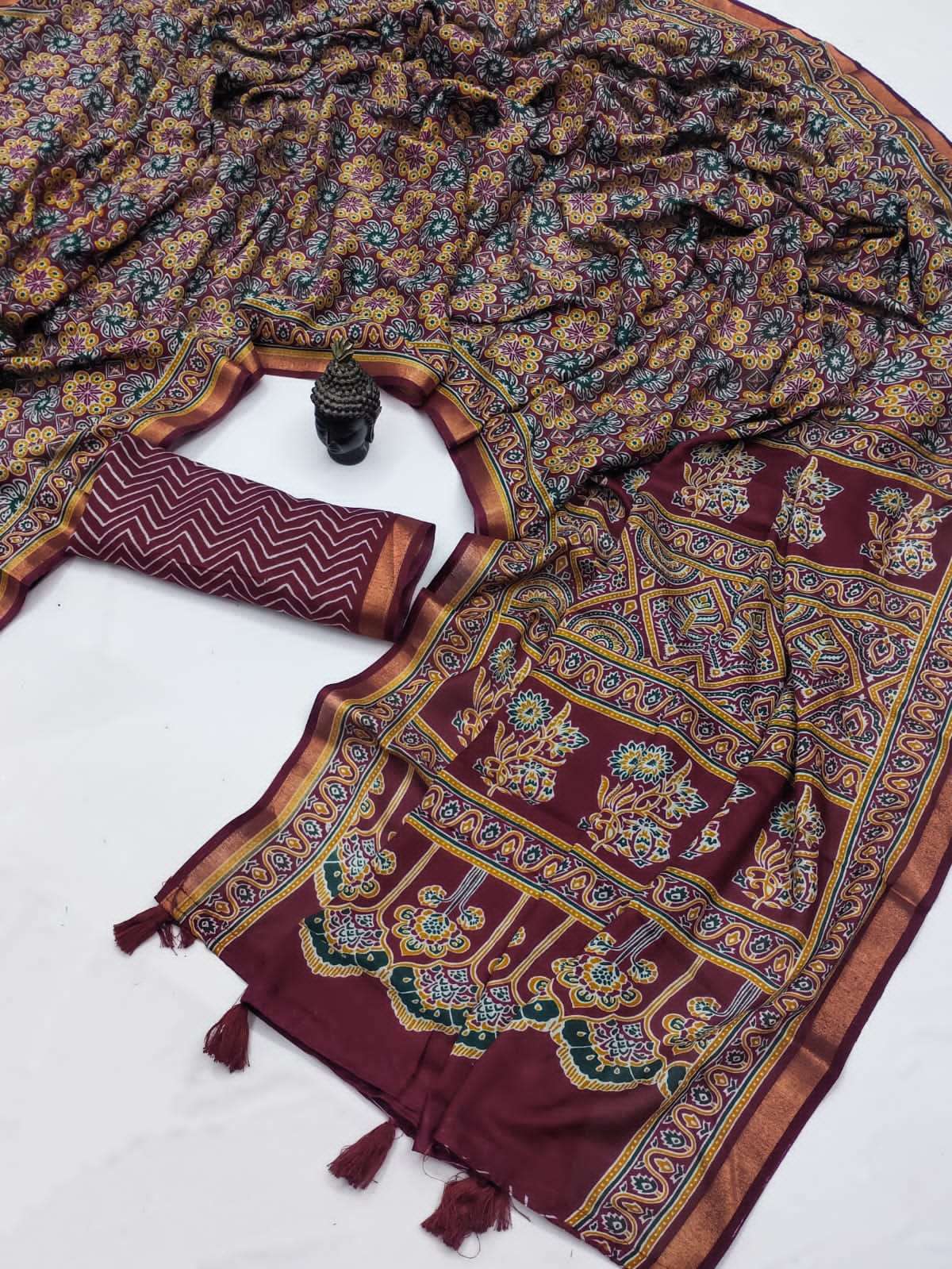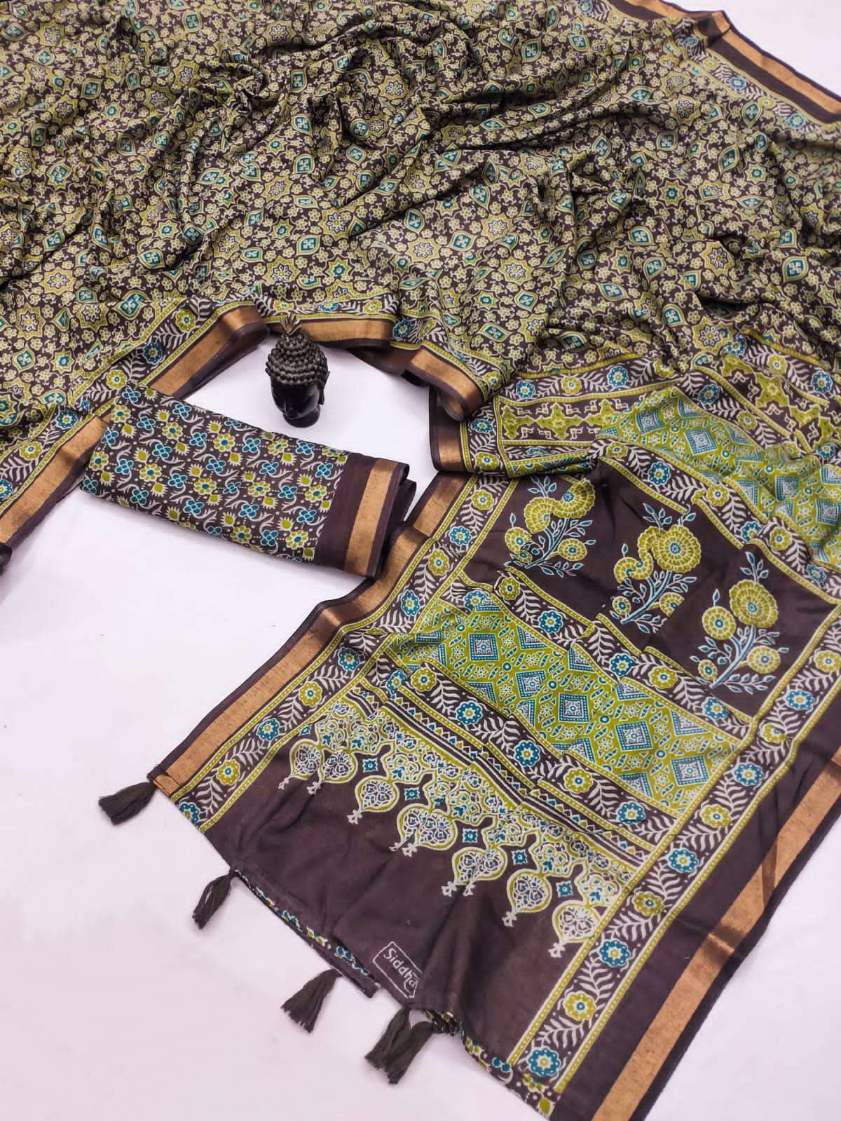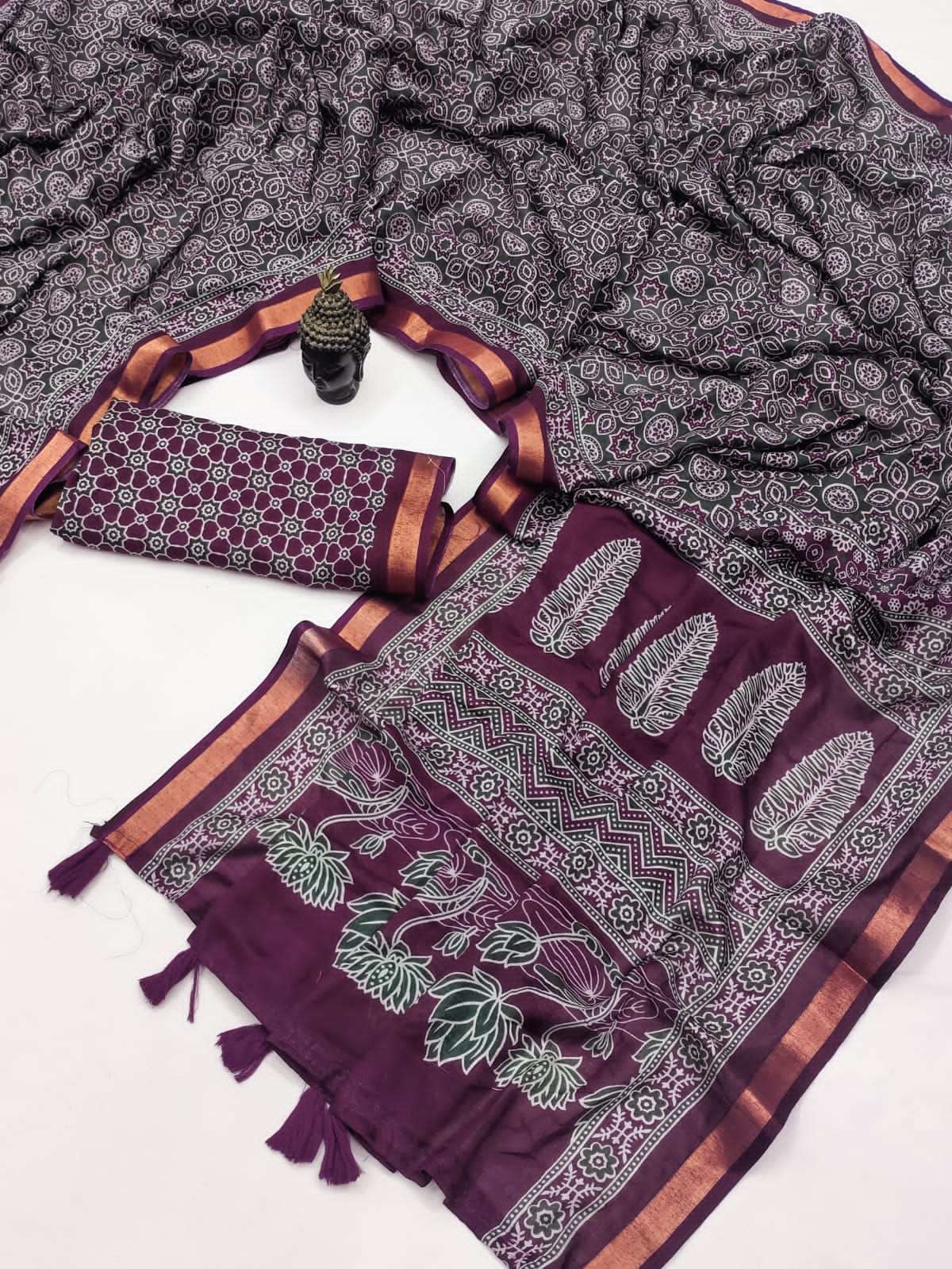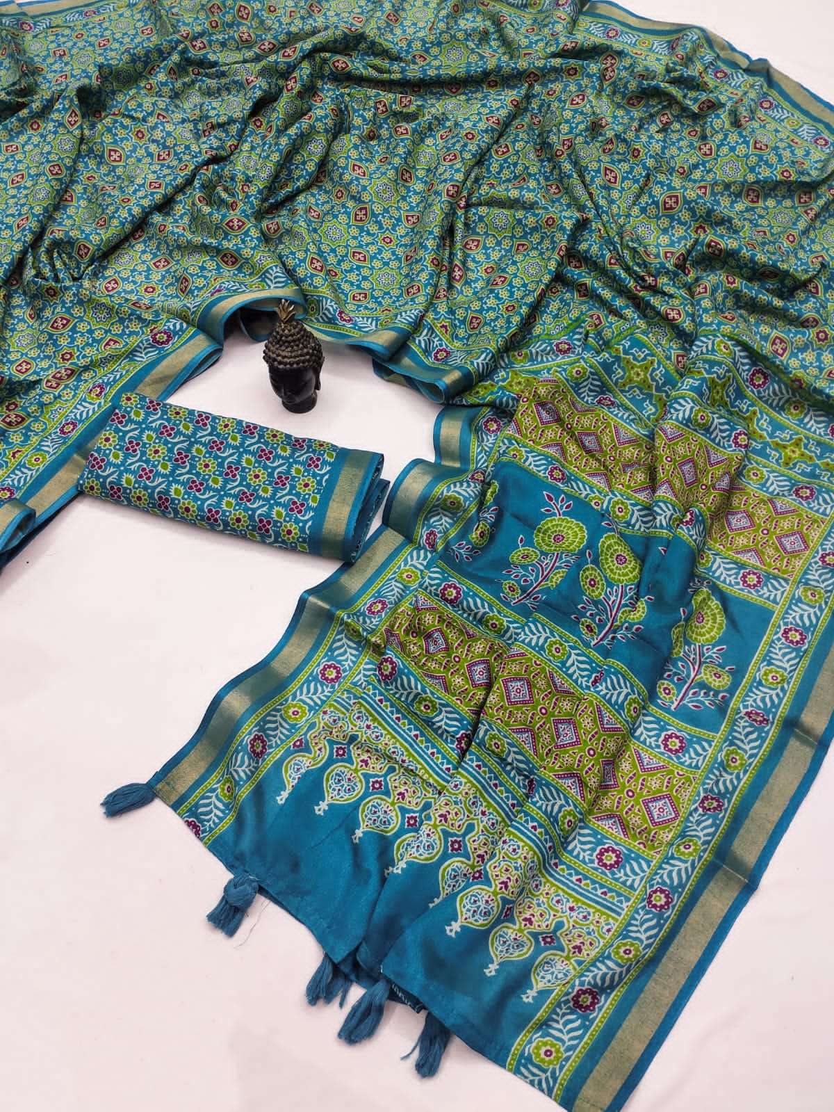 Presenting the graceful Soft Mal Mal Cotton Ajrakh Print Saree, designed for comfort and everyday elegance. Crafted from soft mal mal cotton fabric, this saree is lightweight, breathable, and perfect for all-day wear. The saree features beautiful Ajrakh-inspired prints all over, giving it a traditional yet stylish look. It is enhanced with a fancy floral printed pallu that adds a charming highlight to the design. Paired with a running blouse piece, this saree creates a simple yet elegant ethnic outfit suitable for casual wear, office wear, and small gatherings. Product Highlights: