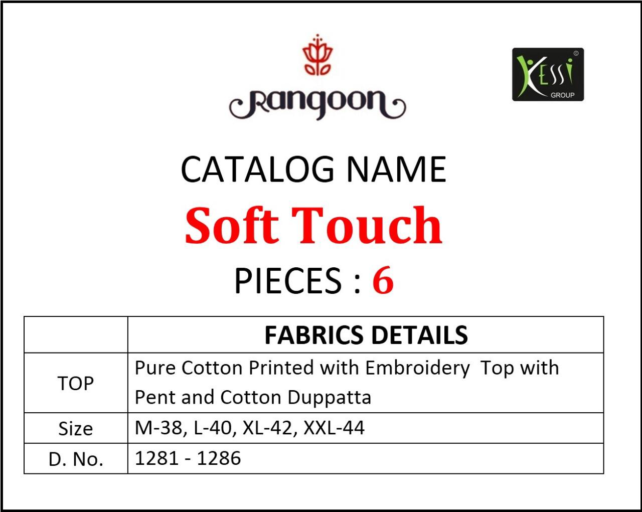 ? *Rangoon (Kessi Fabrics Pvt. Ltd.)* has launched _Catalog name_ : *Soft Touch* ? _Fabric Details_ ? ?Top :- Pure Cotton Printed with Embroidery Top with Pent and Cotton Duppatta ?Total Design :- 6 ?Size;- M-38, L-40, XL-42, XXL-44 ?Dispatching 5 to 6 days later ?Booking started from now... ?Order yours soon.... Rate -799 per pcs . Set To Set. GST 5 Percent Extra. |