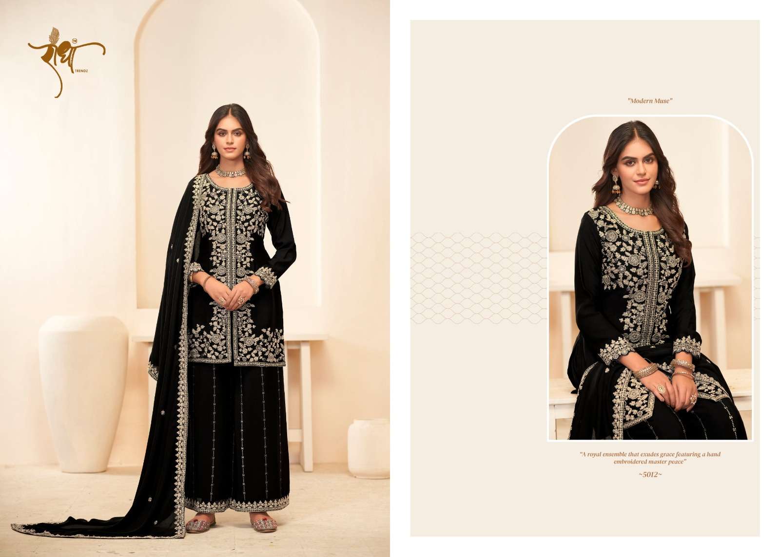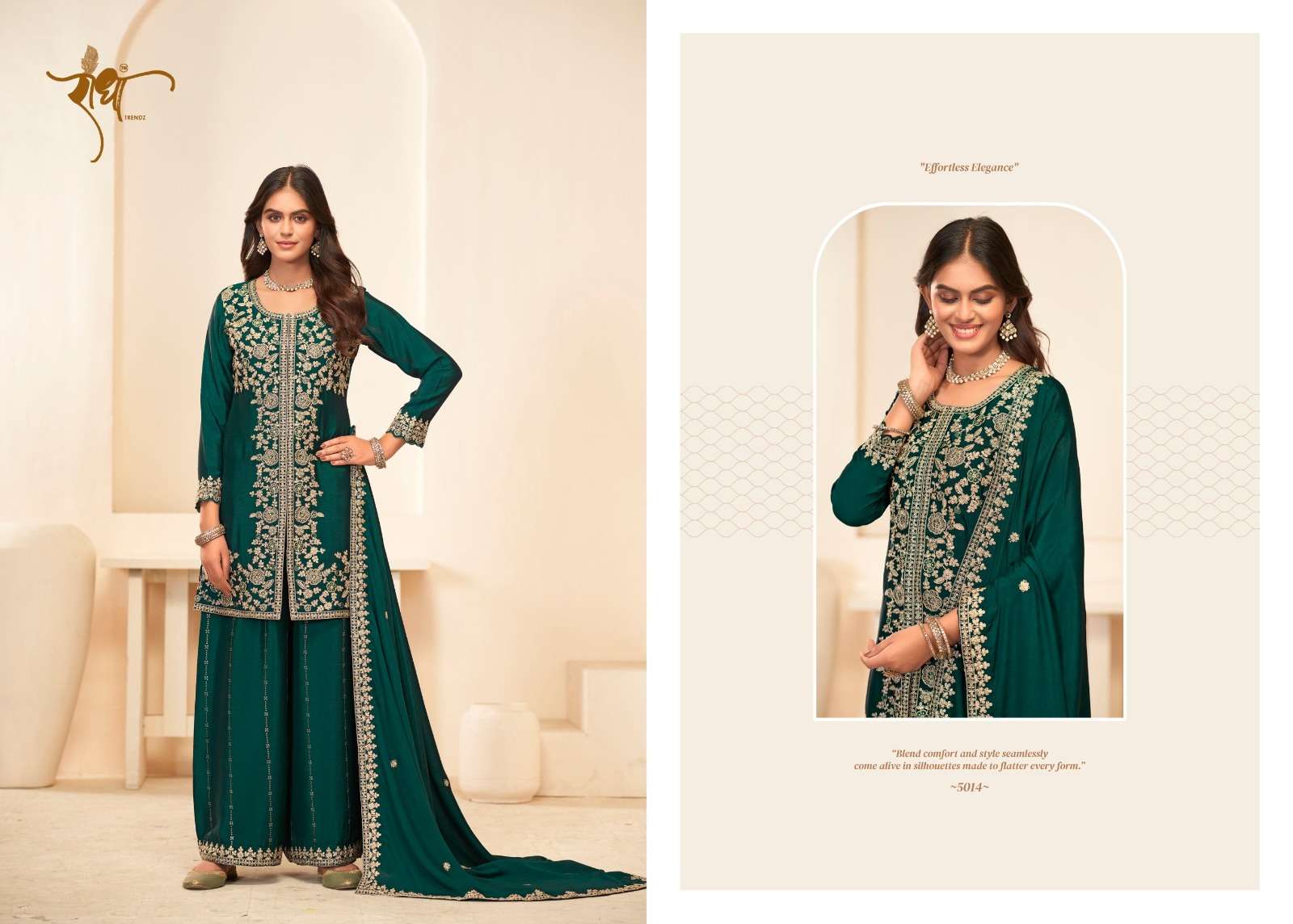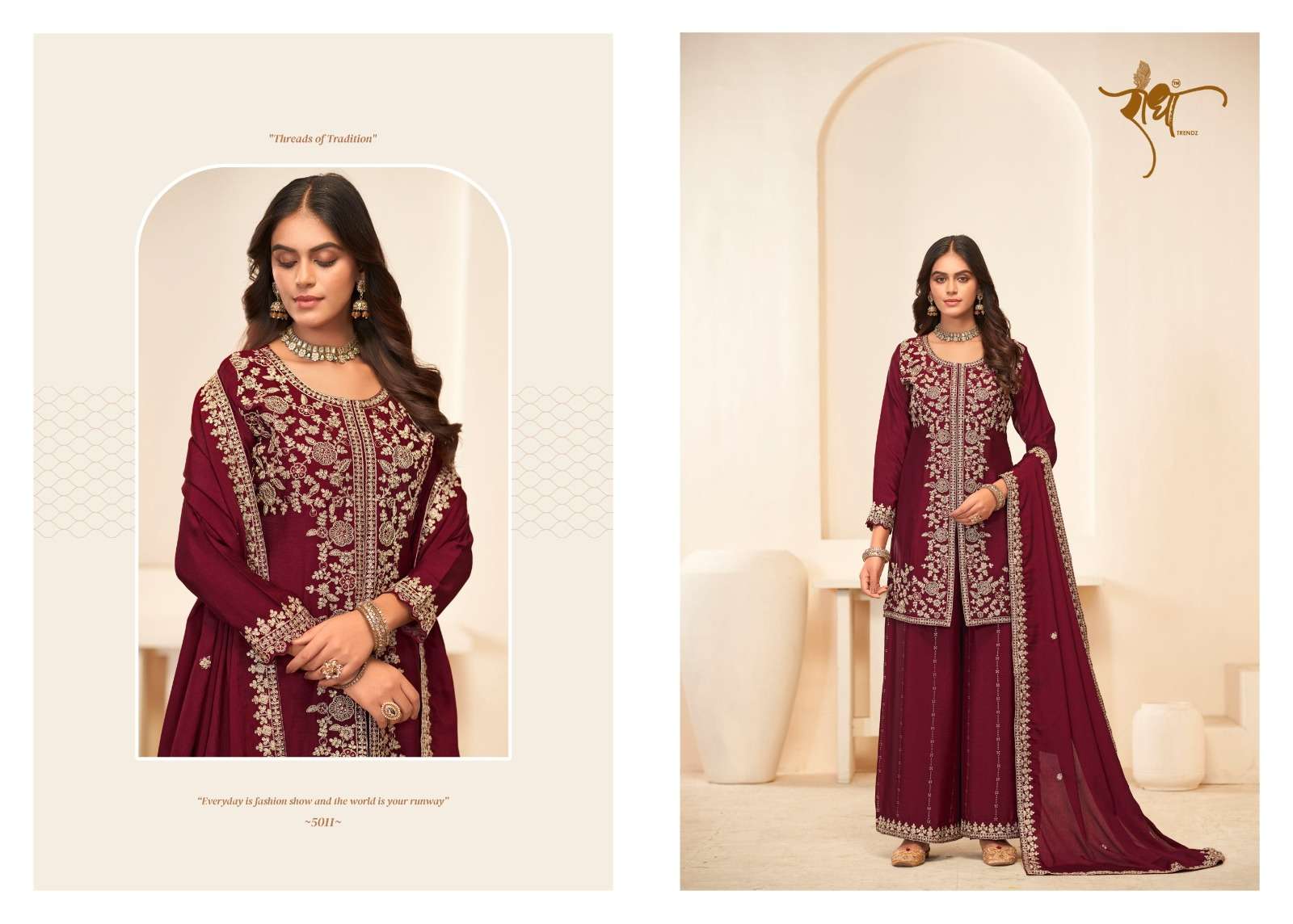 BRAND: RADHA TRENDZ CATALOG - SONALI 🌺 FESTIVE COLLECTION SERIES – 5011 TO 5014 TOP: PREMIUM BLOOMING CHINON WITH EMBROIDARY THREAD WORK & ZERKAN WORk BOTTOM : PREMIUM BLOOMING CHINON WITH FULL PLAZO WORK DUPATTA: PREMIUM BLOOMING CHINON WITH FOUR SIDE LACE EMBROIDARY WORK RATE:1995/- PER PCS GST EXTRA NOTE: FREE SIZE STITCHED SUIT SINGLE AVAILABLE |