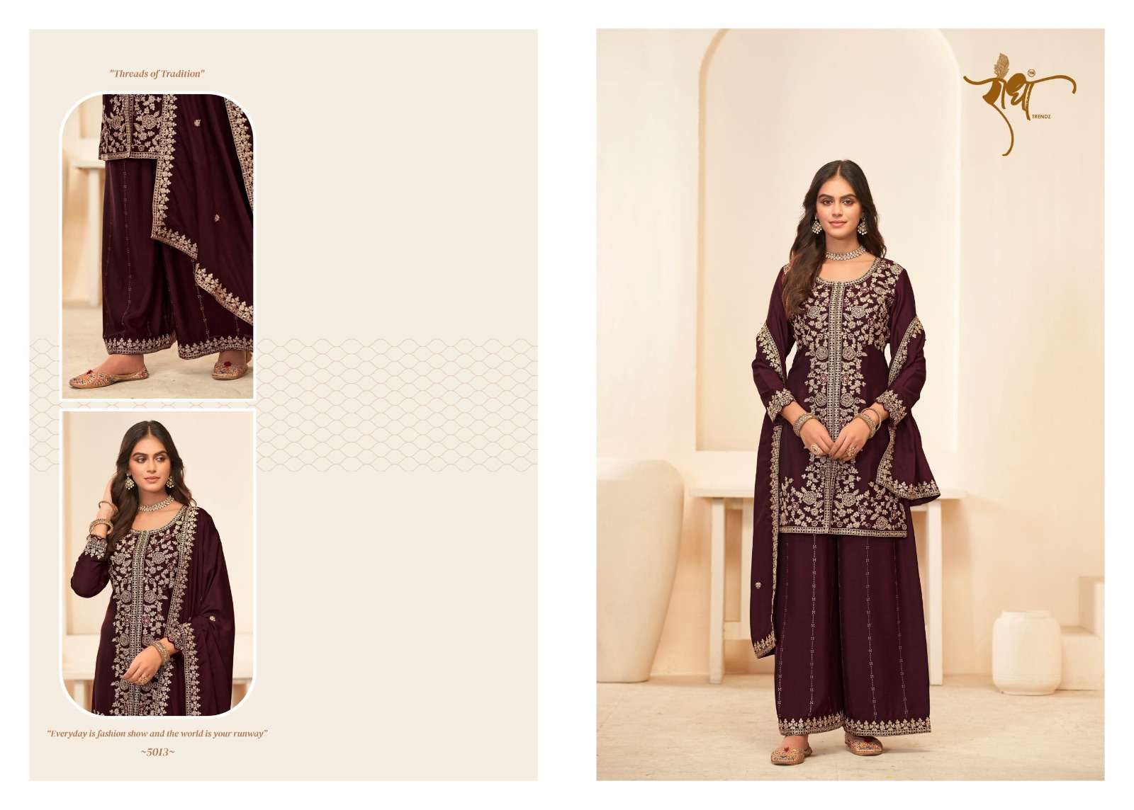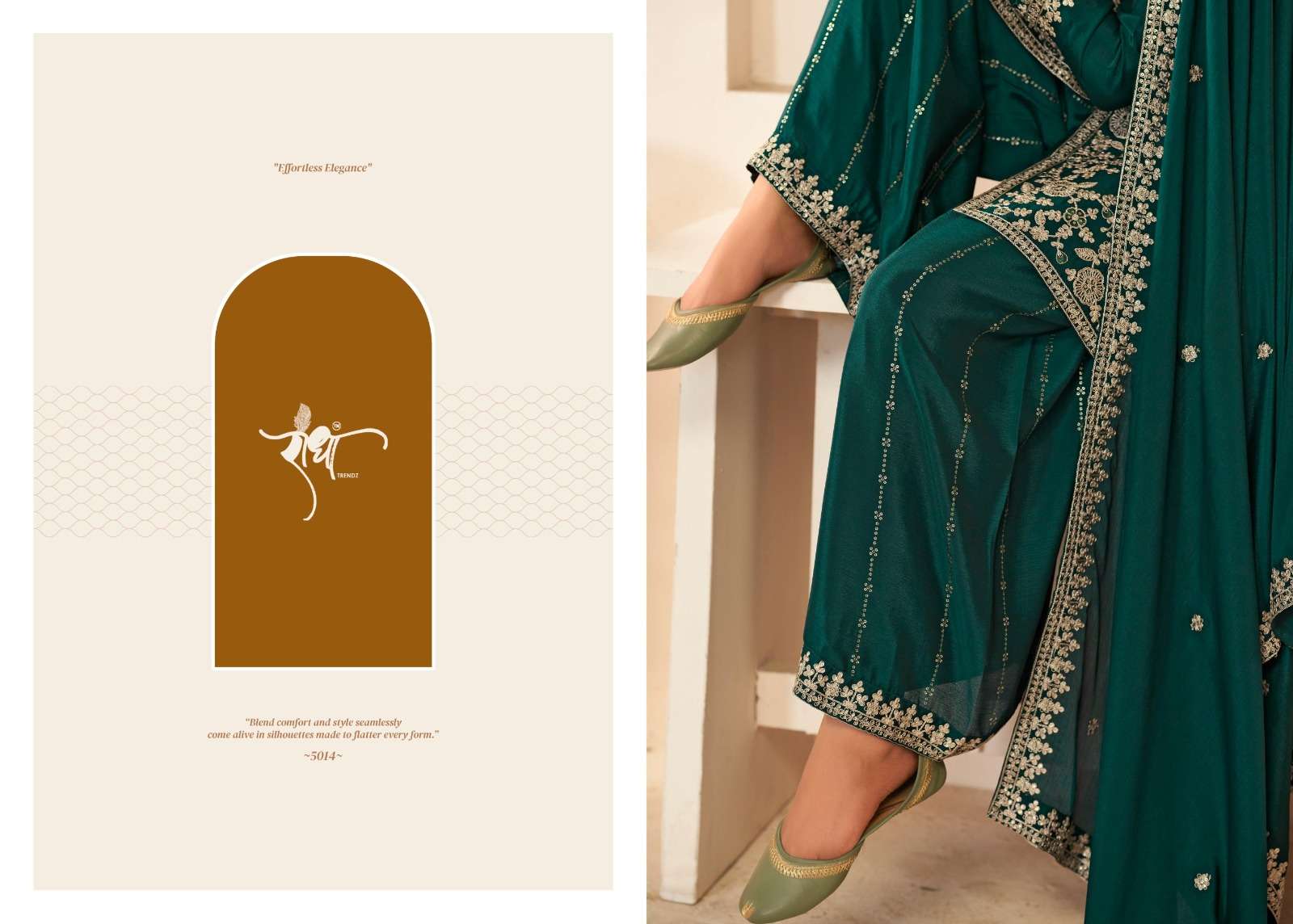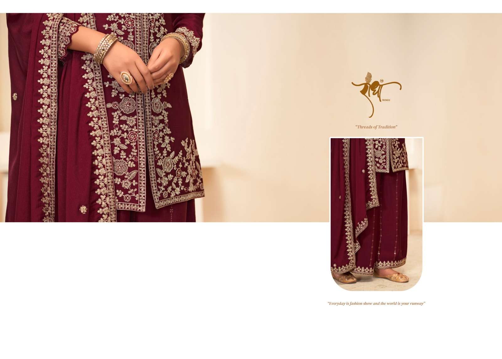 BRAND: RADHA TRENDZ CATALOG - SONALI 🌺 FESTIVE COLLECTION SERIES – 5011 TO 5014 TOP: PREMIUM BLOOMING CHINON WITH EMBROIDARY THREAD WORK & ZERKAN WORk BOTTOM : PREMIUM BLOOMING CHINON WITH FULL PLAZO WORK DUPATTA: PREMIUM BLOOMING CHINON WITH FOUR SIDE LACE EMBROIDARY WORK RATE:1995/- PER PCS GST EXTRA NOTE: FREE SIZE STITCHED SUIT SINGLE AVAILABLE |