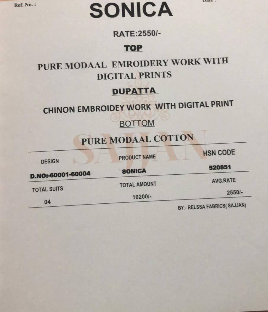 Buy Online Sonica By Relsaa Designer Suits Wholesale Suppliers And Dealer From India 4 Pcs of Full Catalogue at Wholesale Price. Looking for Sonica By Relsaa Designer Suits Wholesale Suppliers And Dealer From India Full Catalouge at Best Price? Buy Now Sonica By Relsaa Designer Suits Wholesale Suppliers And Dealer From India at Wholesale Rate of Rs 10200 with Total 4 Pcs from authroized dealer and supplier of Brand. Cost of Each piece is just only Rs 2550 which is very low and affordable price to resale the product in your retail store ,This is Surat based Wholesale Supplier & Dealer of Brand. Click on Brand name to Know more about Brand's products.Call or Whatsapp on 9898838984 for booking or enquiry