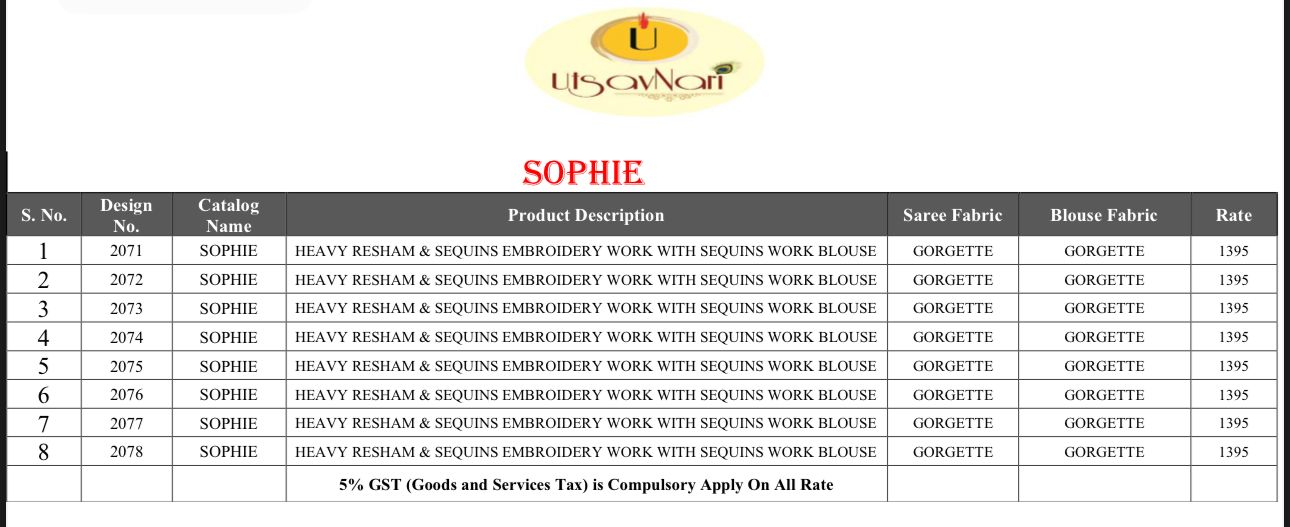 Buy Online Sophie Utsav Nari Georgette Saree 8 Pcs of Full Catalogue at Wholesale Price. Looking for Sophie Utsav Nari Georgette Saree Full Catalouge at Best Price? Buy Now Sophie Utsav Nari Georgette Saree at Wholesale Rate of Rs 11160 with Total 8 Pcs from authroized dealer and supplier of Brand. Cost of Each piece is just only Rs 1395 which is very low and affordable price to resale the product in your retail store ,This is Surat based Wholesale Supplier & Dealer of Brand. Click on Brand name to Know more about Brand's products.Call or Whatsapp on 9898838984 for booking or enquiry