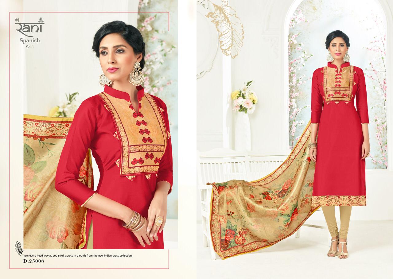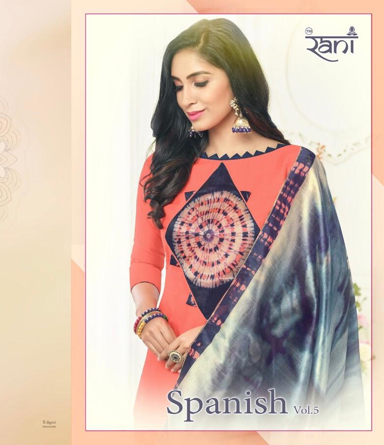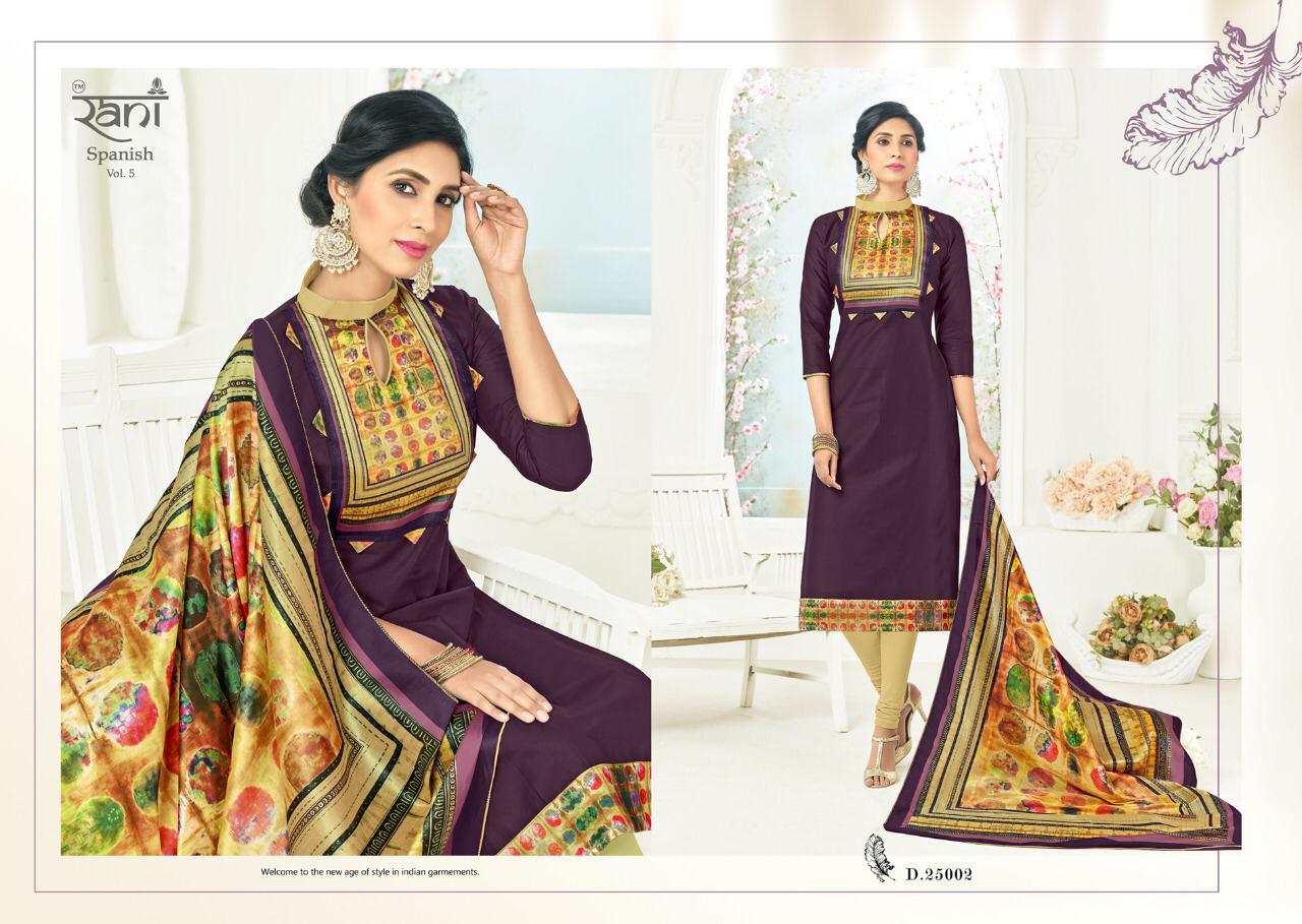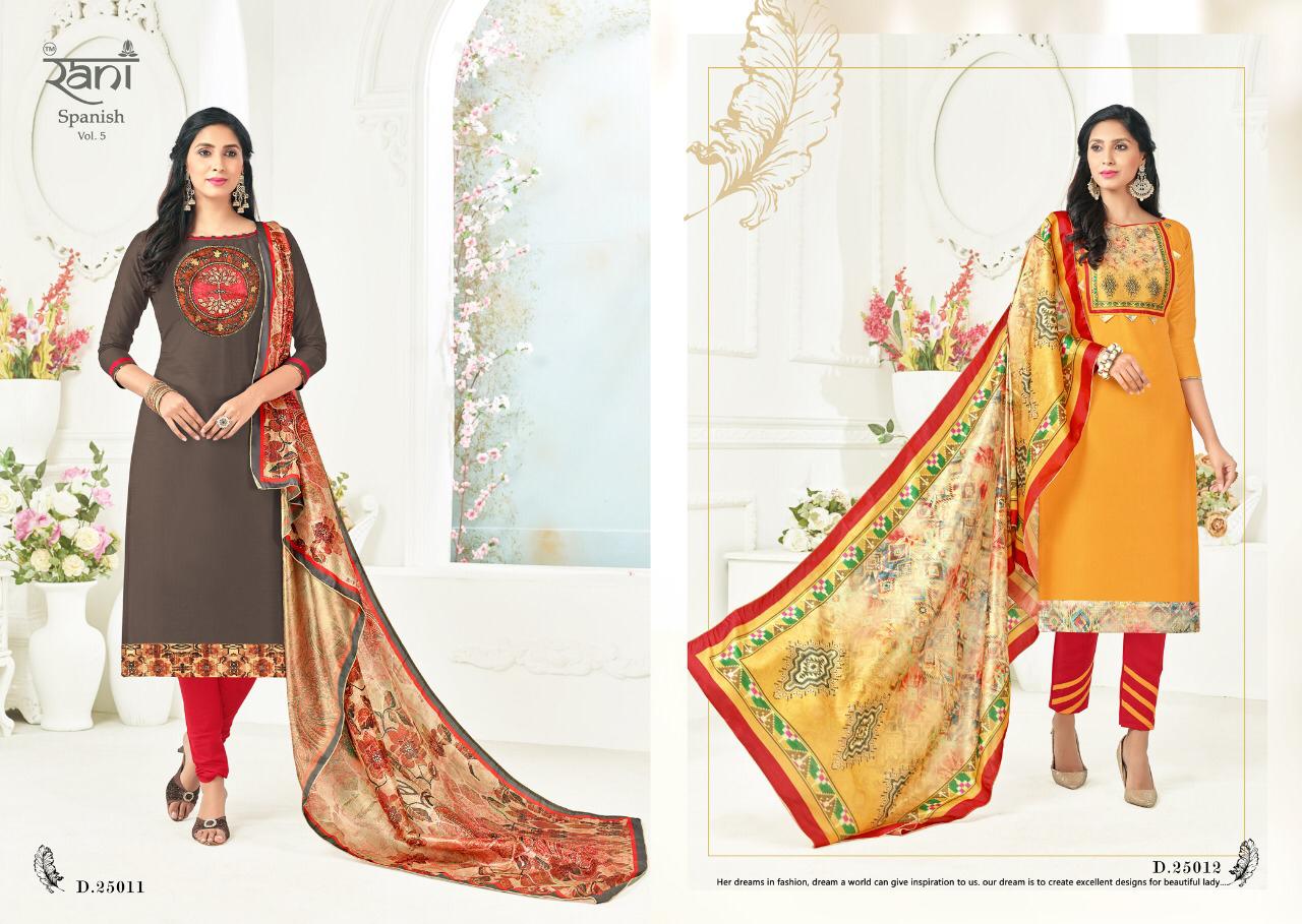 Buy Online Spanish Vol 5 By Rani 25001 Series Fancy Cotton Satin Printed Salwar Kameez Catlog Wholesaler Surat 12 Pcs of Full Catalogue at Wholesale Price. Looking for Spanish Vol 5 By Rani 25001 Series Fancy Cotton Satin Printed Salwar Kameez Catlog Wholesaler Surat Full Catalouge at Best Price? Buy Now Spanish Vol 5 By Rani 25001 Series Fancy Cotton Satin Printed Salwar Kameez Catlog Wholesaler Surat at Wholesale Rate of Rs 6612 with Total 12 Pcs from authroized dealer and supplier of RANI Brand. Cost of Each piece is just only Rs 551 which is very low and affordable price to resale the product in your retail store ,This is Surat based Wholesale Supplier & Dealer of RANI Brand. Click on Brand name to Know more about RANI Brand's products.Call or Whatsapp on 9898838984 for booking or enquiry