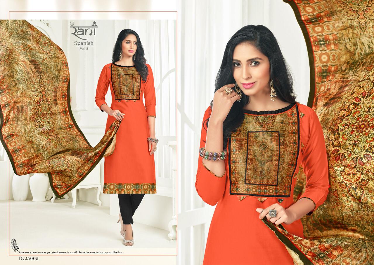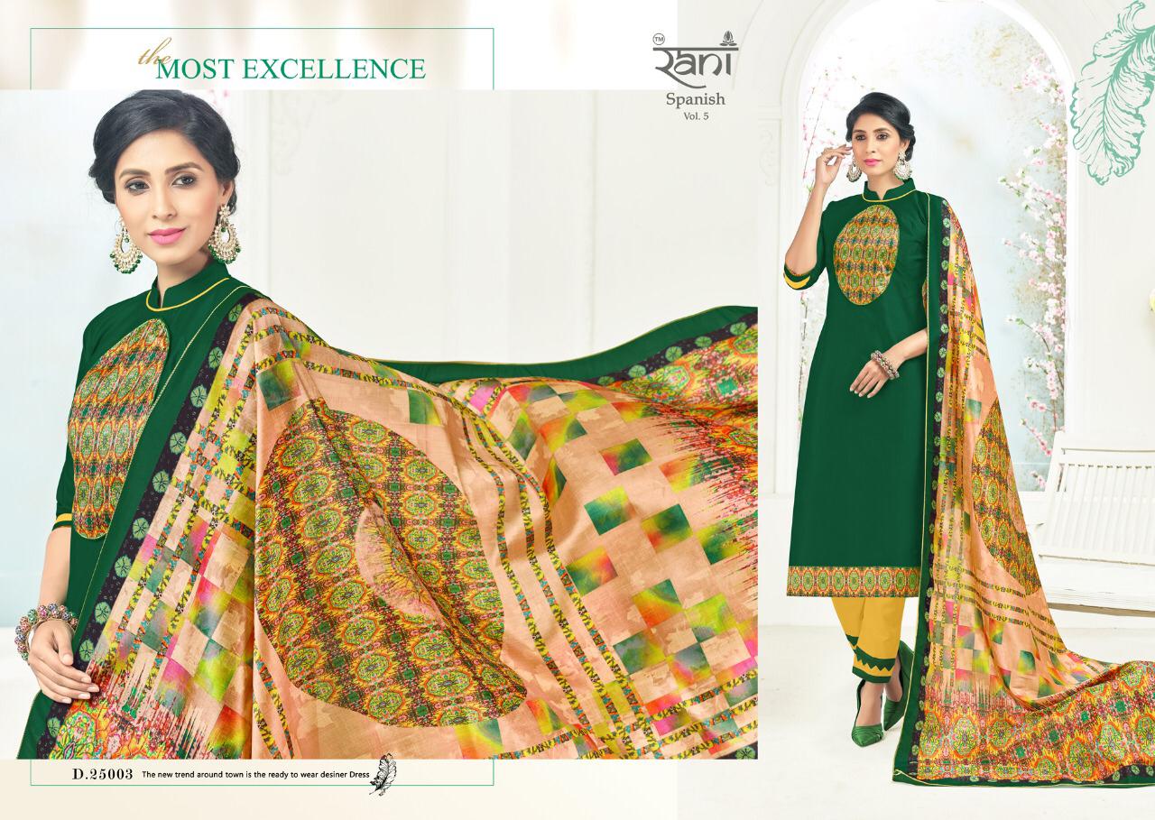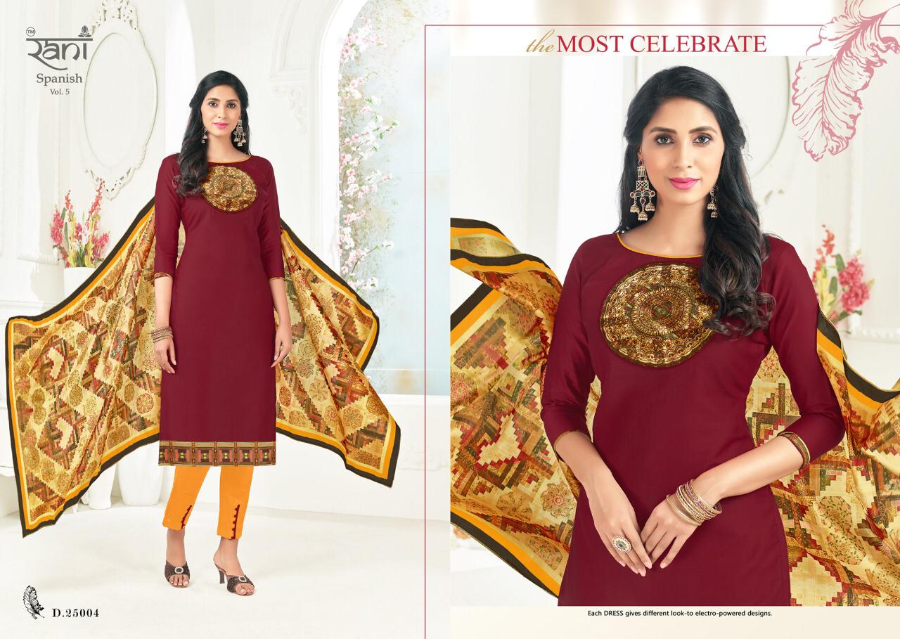 Buy Online Spanish Vol 5 By Rani 25001 Series Fancy Cotton Satin Printed Salwar Kameez Catlog Wholesaler Surat 12 Pcs of Full Catalogue at Wholesale Price. Looking for Spanish Vol 5 By Rani 25001 Series Fancy Cotton Satin Printed Salwar Kameez Catlog Wholesaler Surat Full Catalouge at Best Price? Buy Now Spanish Vol 5 By Rani 25001 Series Fancy Cotton Satin Printed Salwar Kameez Catlog Wholesaler Surat at Wholesale Rate of Rs 6612 with Total 12 Pcs from authroized dealer and supplier of RANI Brand. Cost of Each piece is just only Rs 551 which is very low and affordable price to resale the product in your retail store ,This is Surat based Wholesale Supplier & Dealer of RANI Brand. Click on Brand name to Know more about RANI Brand's products.Call or Whatsapp on 9898838984 for booking or enquiry