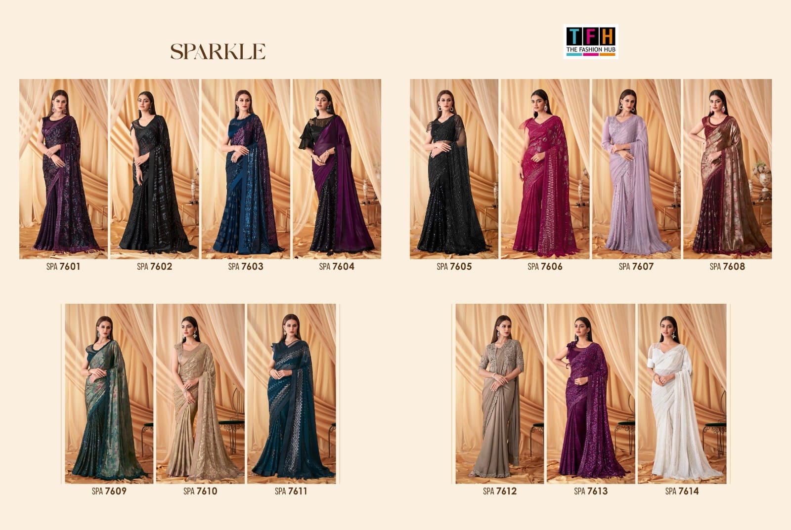 *BRAND : TFH* *CATALOG : 7600 SERIES - SPARKLE VOL - 4* *PRICE & FABRIC :- ATTACHED + 5% GST EXTRA* *SINGLES & SET WISE AVAILABLE ?* *READY TO SHIP* SPA-7601 2472/- SPA-7602 2394/- SPA-7603 2172/- SPA-7604 2394/- SPA-7605 2172/- SPA-7606 2439/- SPA-7607 2283/- SPA-7608 2394/- SPA-7609 2472/- SPA-7610 2172/- SPA-7611 2217/- SPA-7612 2283/- SPA-7613 2439/- SPA-7614 2472/- 100+single |