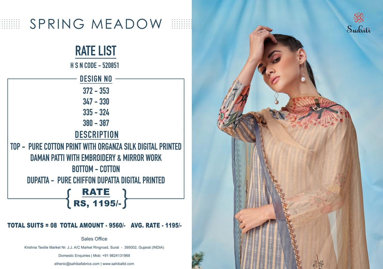 Buy Online Spring Meadow By Sudriti Designer Suits Wholesale Suppliers And Dealer From India La 8 Pcs of Full Catalogue at Wholesale Price. Looking for Spring Meadow By Sudriti Designer Suits Wholesale Suppliers And Dealer From India La Full Catalouge at Best Price? Buy Now Spring Meadow By Sudriti Designer Suits Wholesale Suppliers And Dealer From India La at Wholesale Rate of Rs 9560 with Total 8 Pcs from authroized dealer and supplier of Brand. Cost of Each piece is just only Rs 1195 which is very low and affordable price to resale the product in your retail store ,This is Surat based Wholesale Supplier & Dealer of Brand. Click on Brand name to Know more about Brand's products.Call or Whatsapp on 9898838984 for booking or enquiry