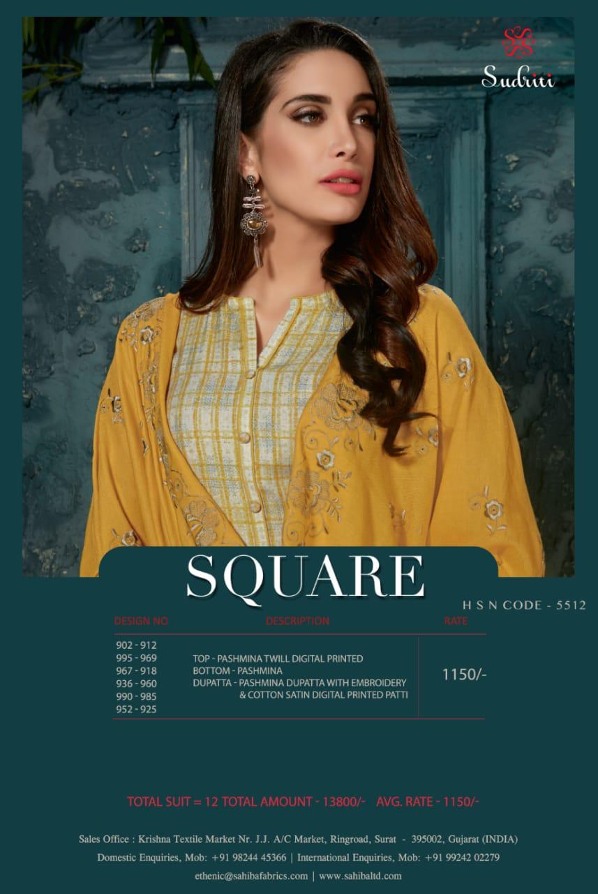 Buy Online Square By Sudriti 902 Series Fancy Pashmina Twill Printed Salwar Kameez Catlog Wholesale Dealer Surat 12 Pcs of Full Catalogue at Wholesale Price. Looking for Square By Sudriti 902 Series Fancy Pashmina Twill Printed Salwar Kameez Catlog Wholesale Dealer Surat Full Catalouge at Best Price? Buy Now Square By Sudriti 902 Series Fancy Pashmina Twill Printed Salwar Kameez Catlog Wholesale Dealer Surat at Wholesale Rate of Rs 13800 with Total 12 Pcs from authroized dealer and supplier of SUDRITI Brand. Cost of Each piece is just only Rs 1150 which is very low and affordable price to resale the product in your retail store ,This is Surat based Wholesale Supplier & Dealer of SUDRITI Brand. Click on Brand name to Know more about SUDRITI Brand's products.Call or Whatsapp on 9898838984 for booking or enquiry