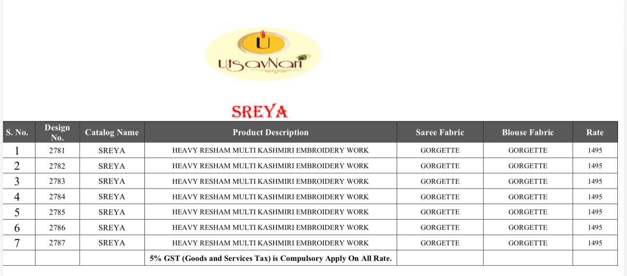 Buy Online SREYA by utsav nari fashion saree Collection manufacturer surat 7 Pcs of Full Catalogue at Wholesale Price. Looking for SREYA by utsav nari fashion saree Collection manufacturer surat Full Catalouge at Best Price? Buy Now SREYA by utsav nari fashion saree Collection manufacturer surat at Wholesale Rate of Rs 10465 with Total 7 Pcs from authroized dealer and supplier of UTSAV NARI Brand. Cost of Each piece is just only Rs 1495 which is very low and affordable price to resale the product in your retail store ,This is Surat based Wholesale Supplier & Dealer of UTSAV NARI Brand. Click on Brand name to Know more about UTSAV NARI Brand's products.Call or Whatsapp on 9898838984 for booking or enquiry
