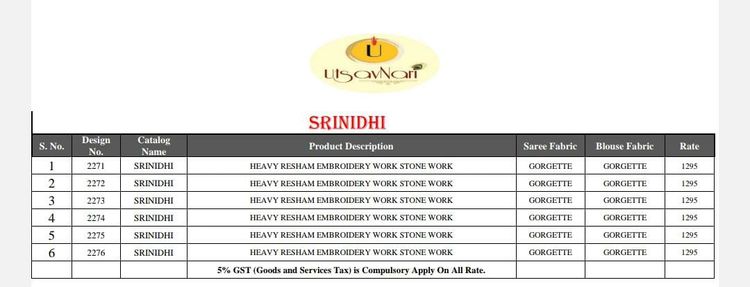 SRINIDHI RATE CARD ATTACHED 1295+5% GST SHIP EXTRA SINGLE AVAILABLE 100+singl |