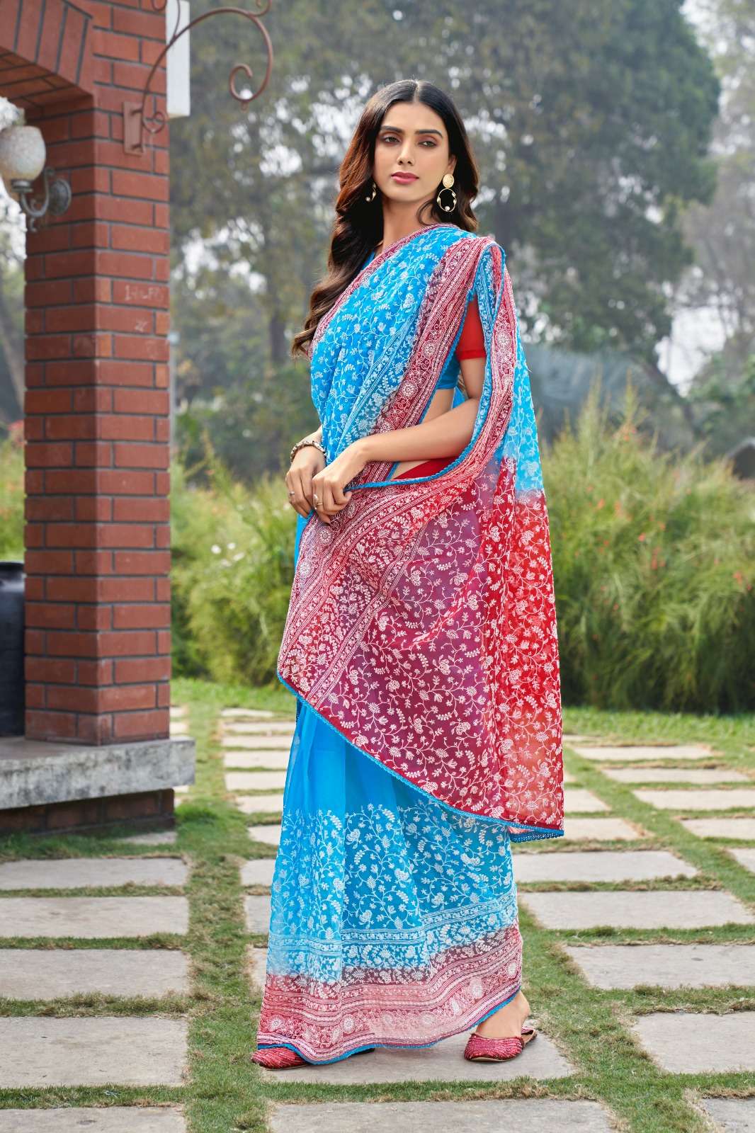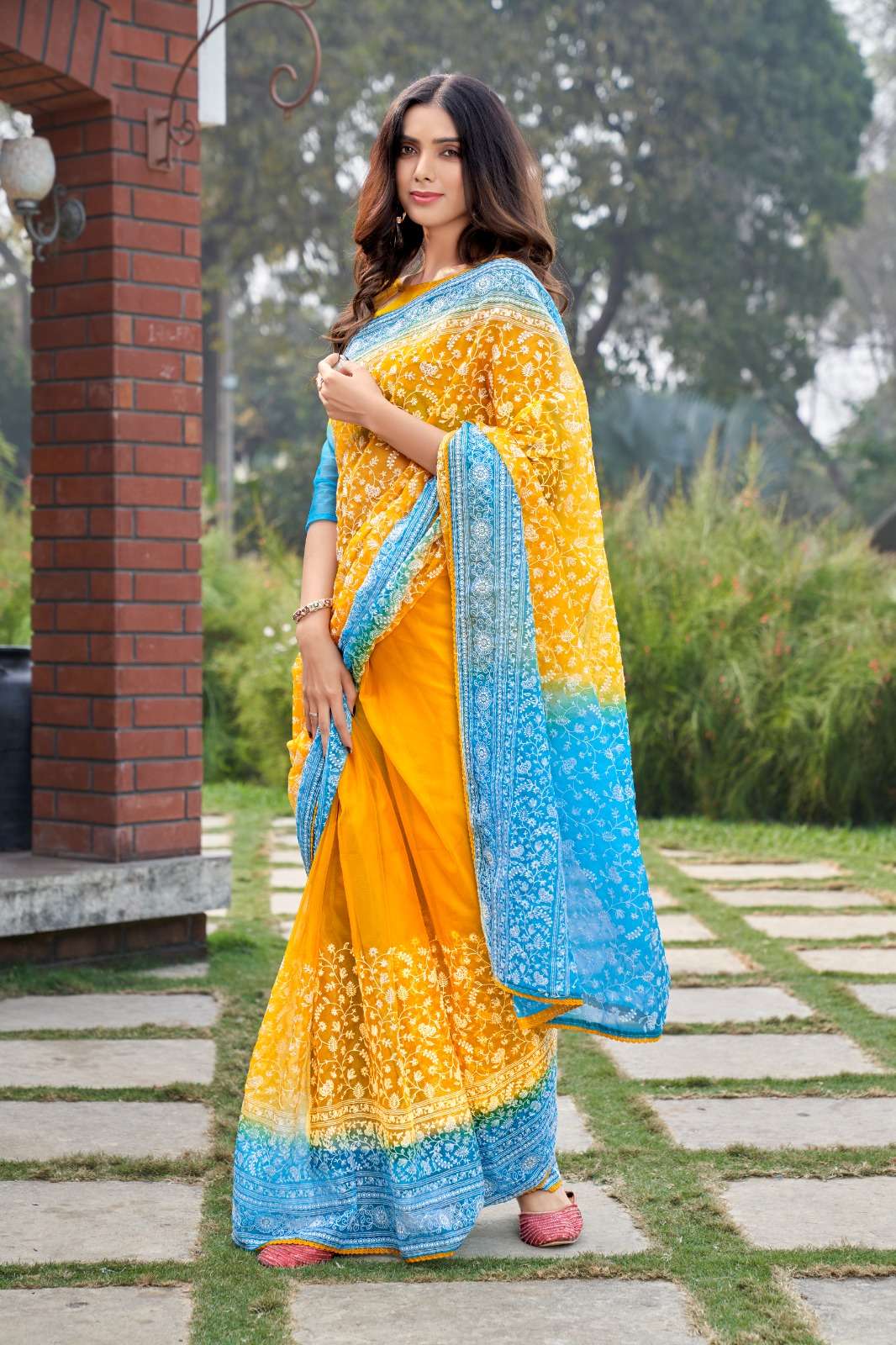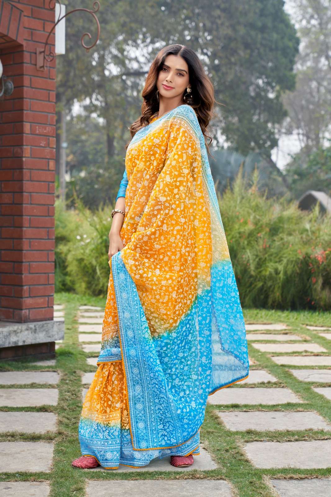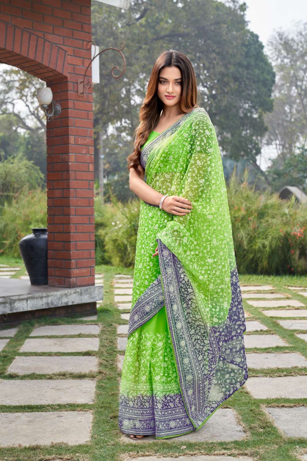 Catalog Name : *Srivani chikankari * No of Pcs : 1 Fabric : Organza silk Work : Pure Organza silk saree, hand dying colors with beautiful viscos thread work in saree also attached a chikankari lace border, Mono silk blouse of white Color with banglori sattin silk blouse