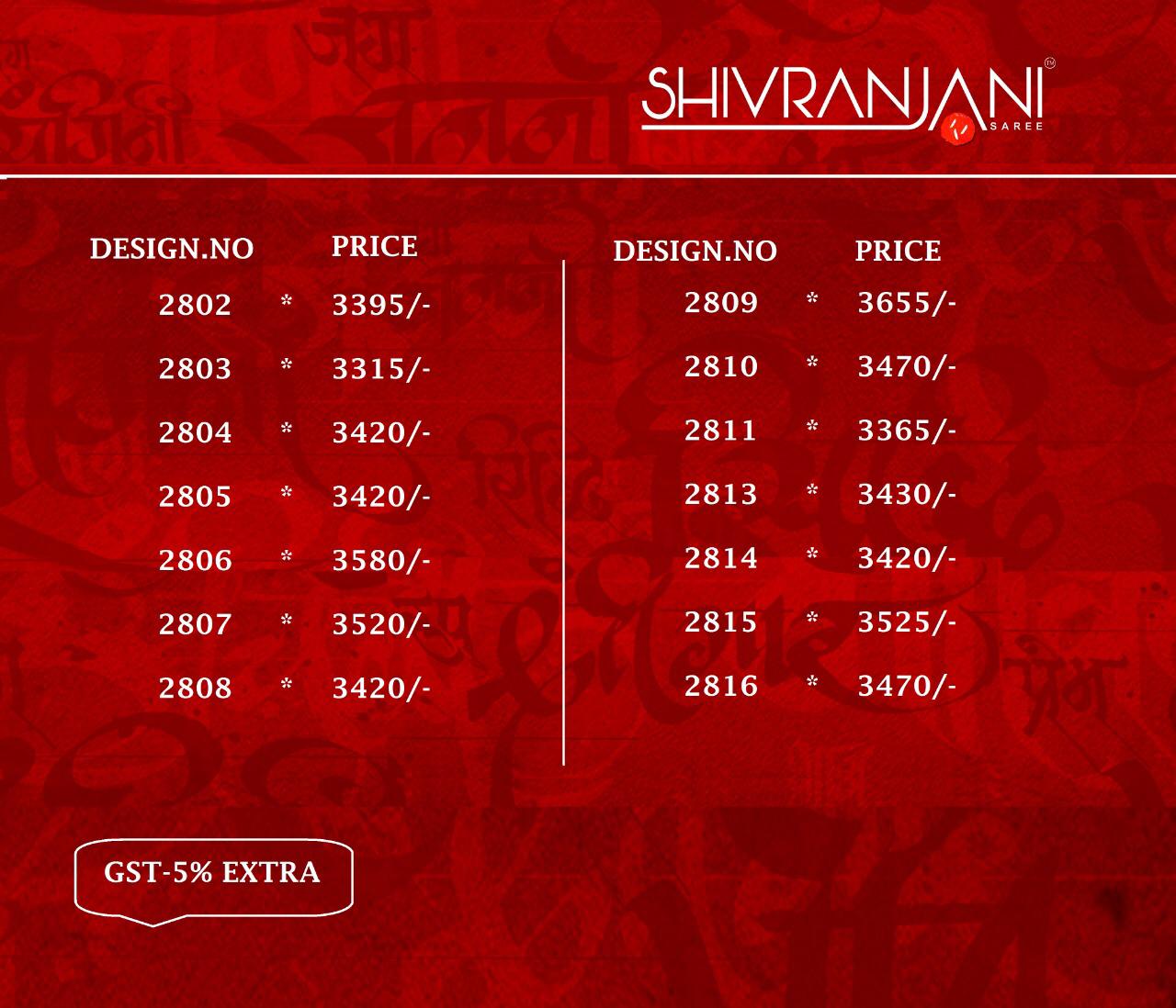 Buy Online Srushti Series 2802 To 2816 By Shivranjani Sarees Beautiful Designer Occasion Wear Sarees Wholesale Supplier And Dealer Gujarat 14 Pcs of Full Catalogue at Wholesale Price. Looking for Srushti Series 2802 To 2816 By Shivranjani Sarees Beautiful Designer Occasion Wear Sarees Wholesale Supplier And Dealer Gujarat Full Catalouge at Best Price? Buy Now Srushti Series 2802 To 2816 By Shivranjani Sarees Beautiful Designer Occasion Wear Sarees Wholesale Supplier And Dealer Gujarat at Wholesale Rate of Rs 48412 with Total 14 Pcs from authroized dealer and supplier of SHIVRANJANI SAREE Brand. Cost of Each piece is just only Rs 3458 which is very low and affordable price to resale the product in your retail store ,This is Surat based Wholesale Supplier & Dealer of SHIVRANJANI SAREE Brand. Click on Brand name to Know more about SHIVRANJANI SAREE Brand's products.Call or Whatsapp on 9898838984 for booking or enquiry