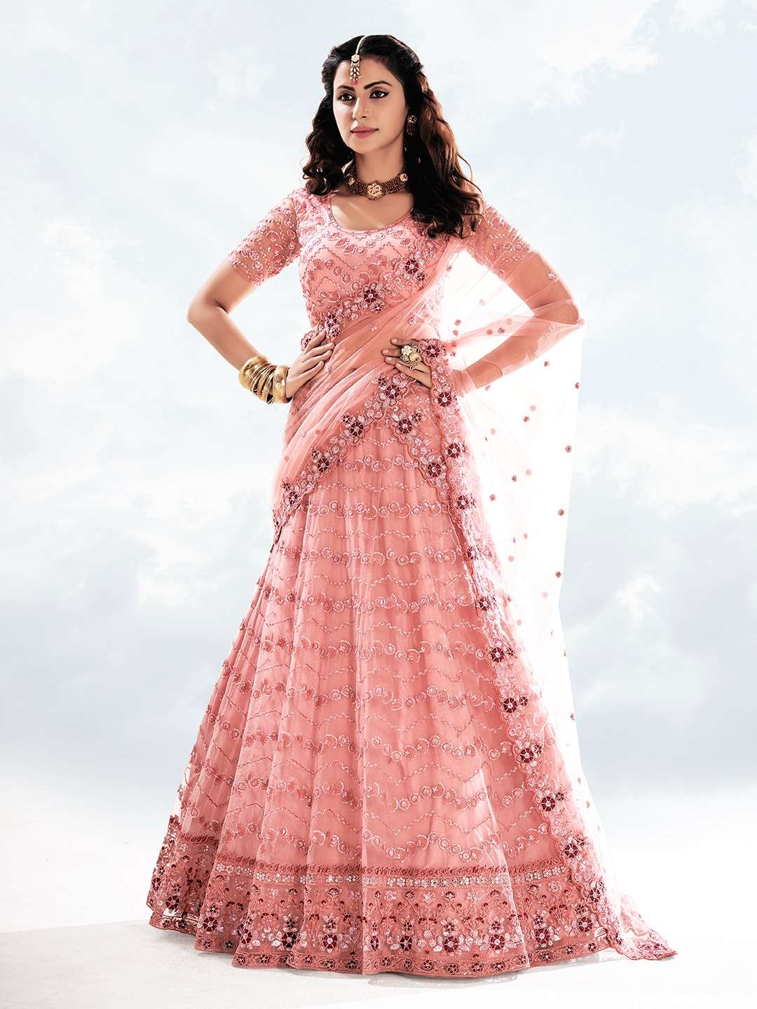 *Lehenga(Semi - Stitched)* Lehenga Fabric : Soft Net Lehenga Work : Sequins and embroidery Work Lehenga Waist : Support Up To 44 Stitching : stitching with Canvas and Can-Can Length : 44 Flair : 3.50 Mtr Inner : Micro Cotton