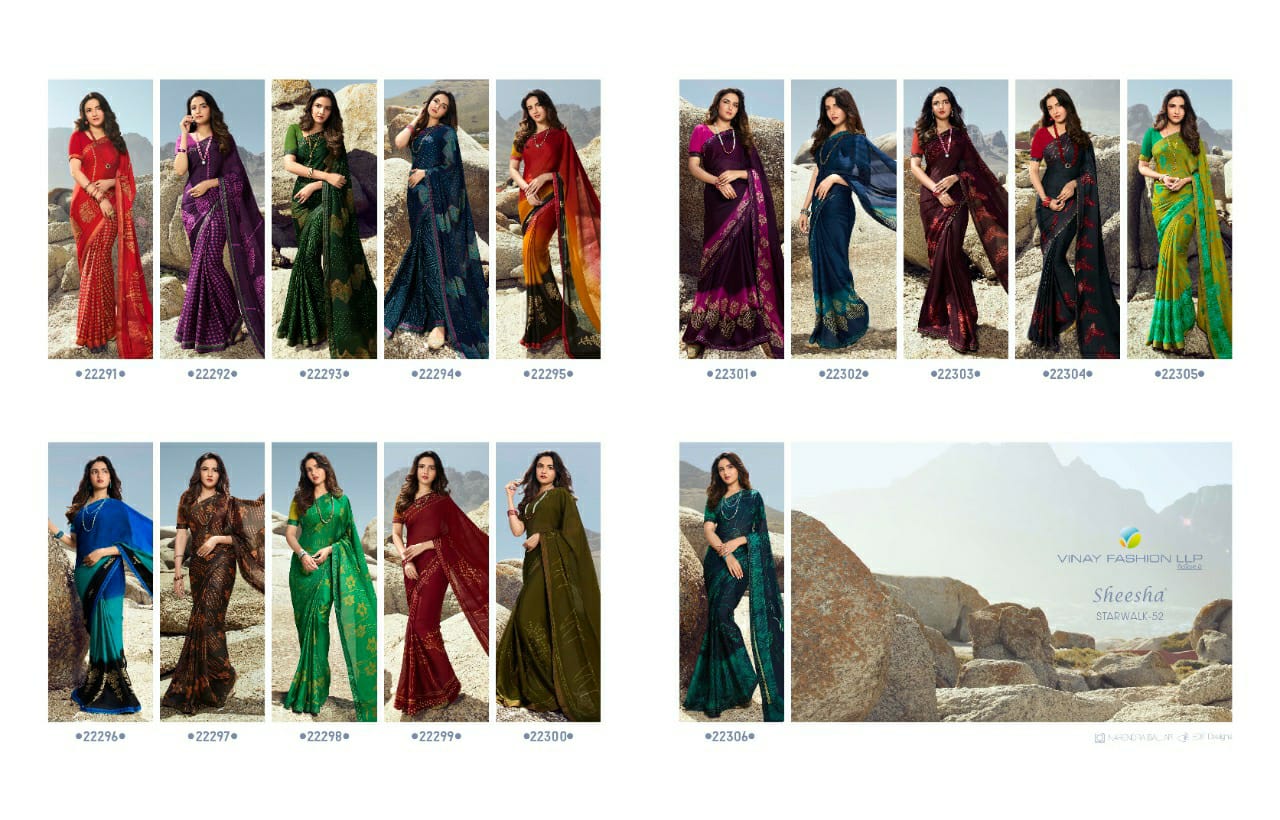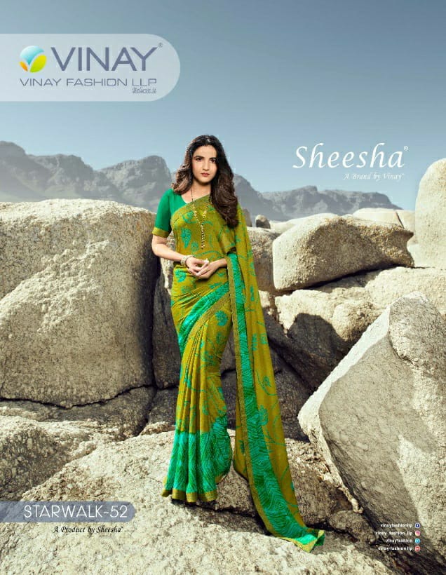 *Brand :* Vinay Fashion *Catalog Name:* Starwalk Vol-52 *Price:* ?890 *Piece:* 16 *Total Price:* 14240 ( GST Extra ) *Size:* Unstitched *Fabric:* Georgette *Availibility:* On Booking |