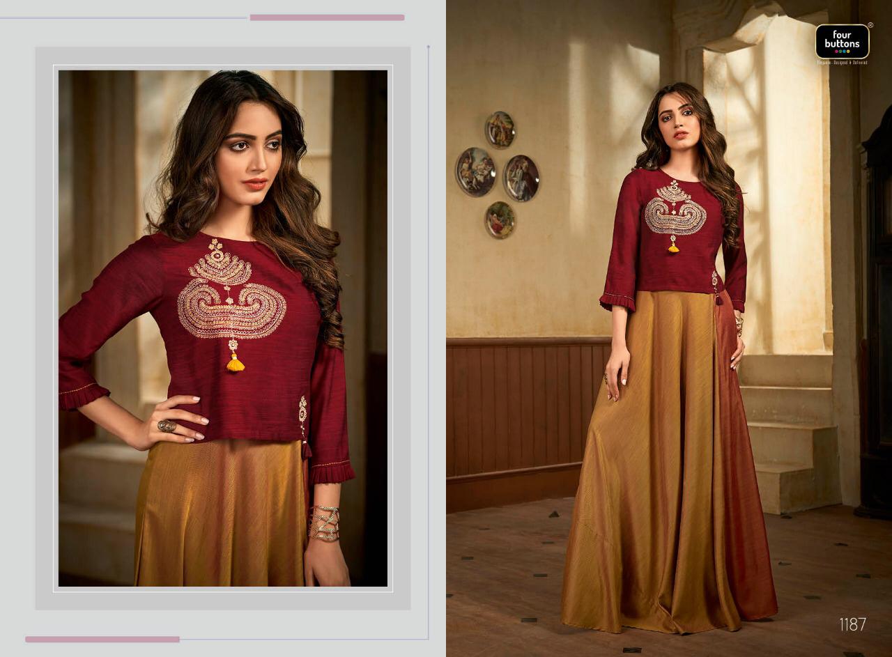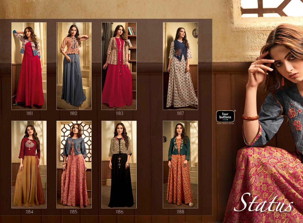 Buy Online Status By Four Buttons Beuatiful Designer Kurtis Wholesale Supplier Surat 8 Pcs of Full Catalogue at Wholesale Price. Looking for Status By Four Buttons Beuatiful Designer Kurtis Wholesale Supplier Surat Full Catalouge at Best Price? Buy Now Status By Four Buttons Beuatiful Designer Kurtis Wholesale Supplier Surat at Wholesale Rate of Rs 8400 with Total 8 Pcs from authroized dealer and supplier of FOUR BUTTONS Brand. Cost of Each piece is just only Rs 1050 which is very low and affordable price to resale the product in your retail store ,This is Surat based Wholesale Supplier & Dealer of FOUR BUTTONS Brand. Click on Brand name to Know more about FOUR BUTTONS Brand's products.Call or Whatsapp on 9898838984 for booking or enquiry