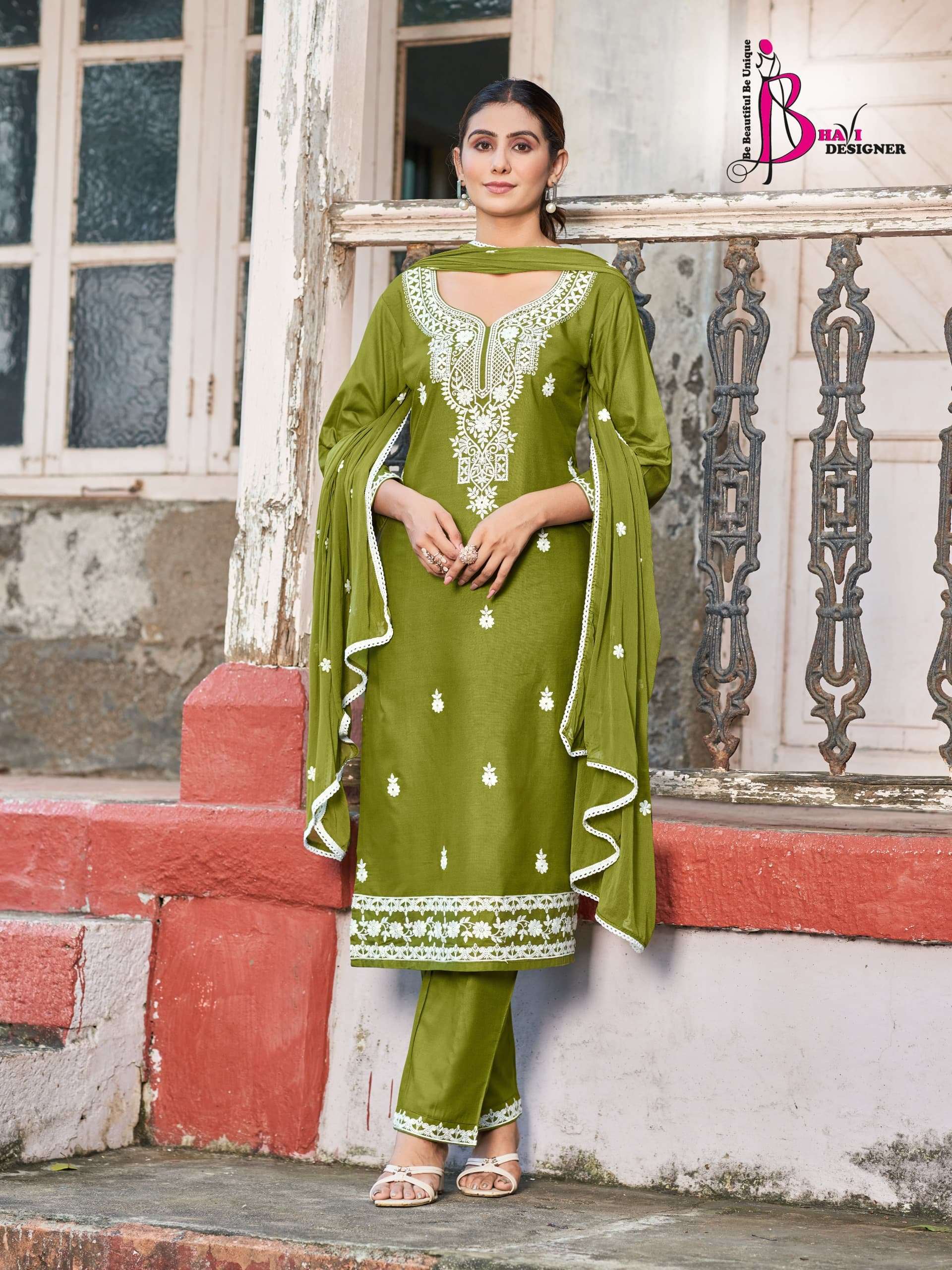 💃🏼 *Status VoL-3* 💃🏼 Step out in the most pleasant hues of this Winter season! Dyed and Rayon cotton to enhance your charm in this Winter... Turn heads in awe with our elegant a beautiful medley of rich bright tones,pure weaves of fabric with touch of White embroidery in Garments.. Bhavi Designer is stocked to celebrate the season of Winter with its Royal collection of 3 pieces ..