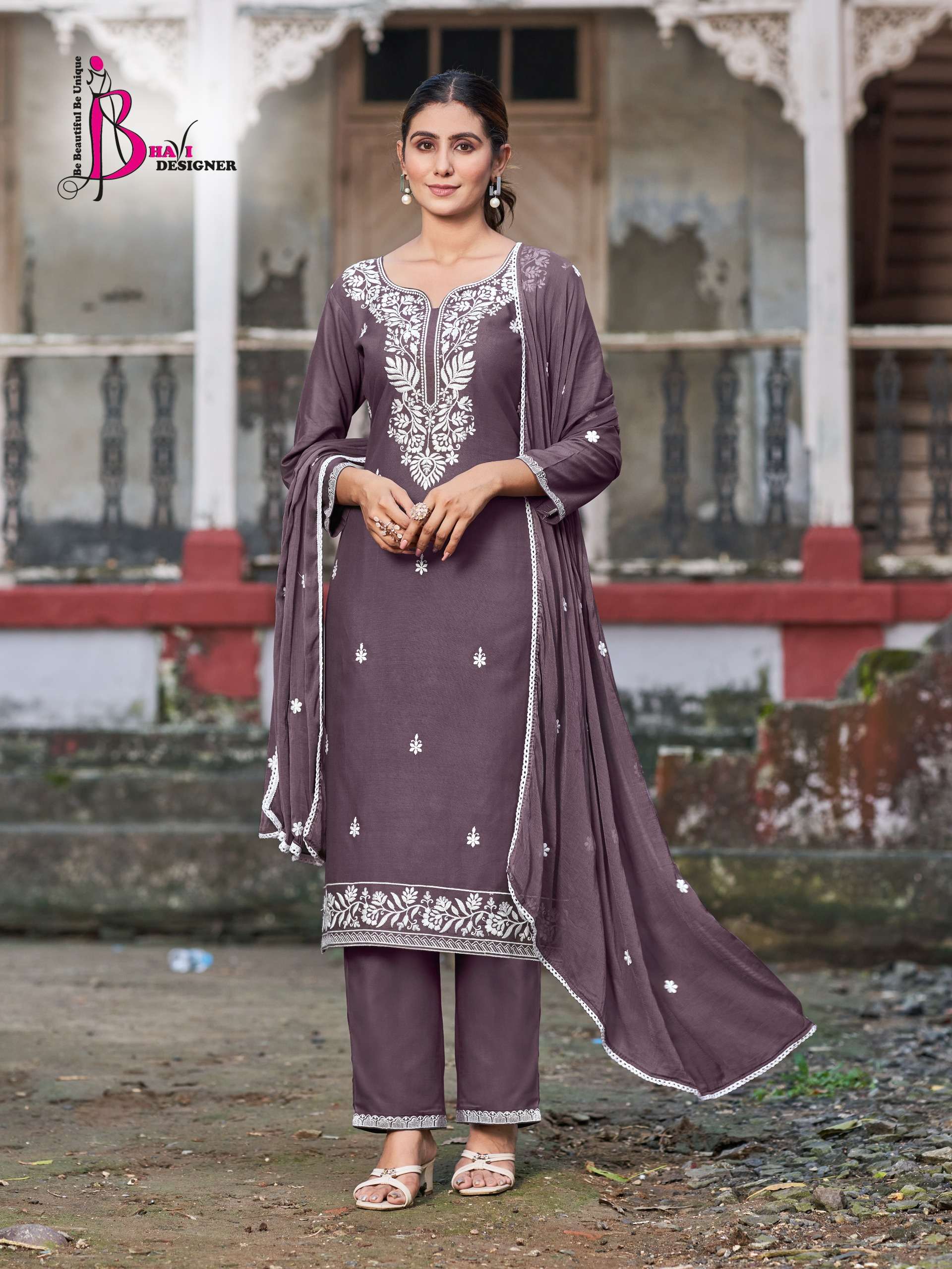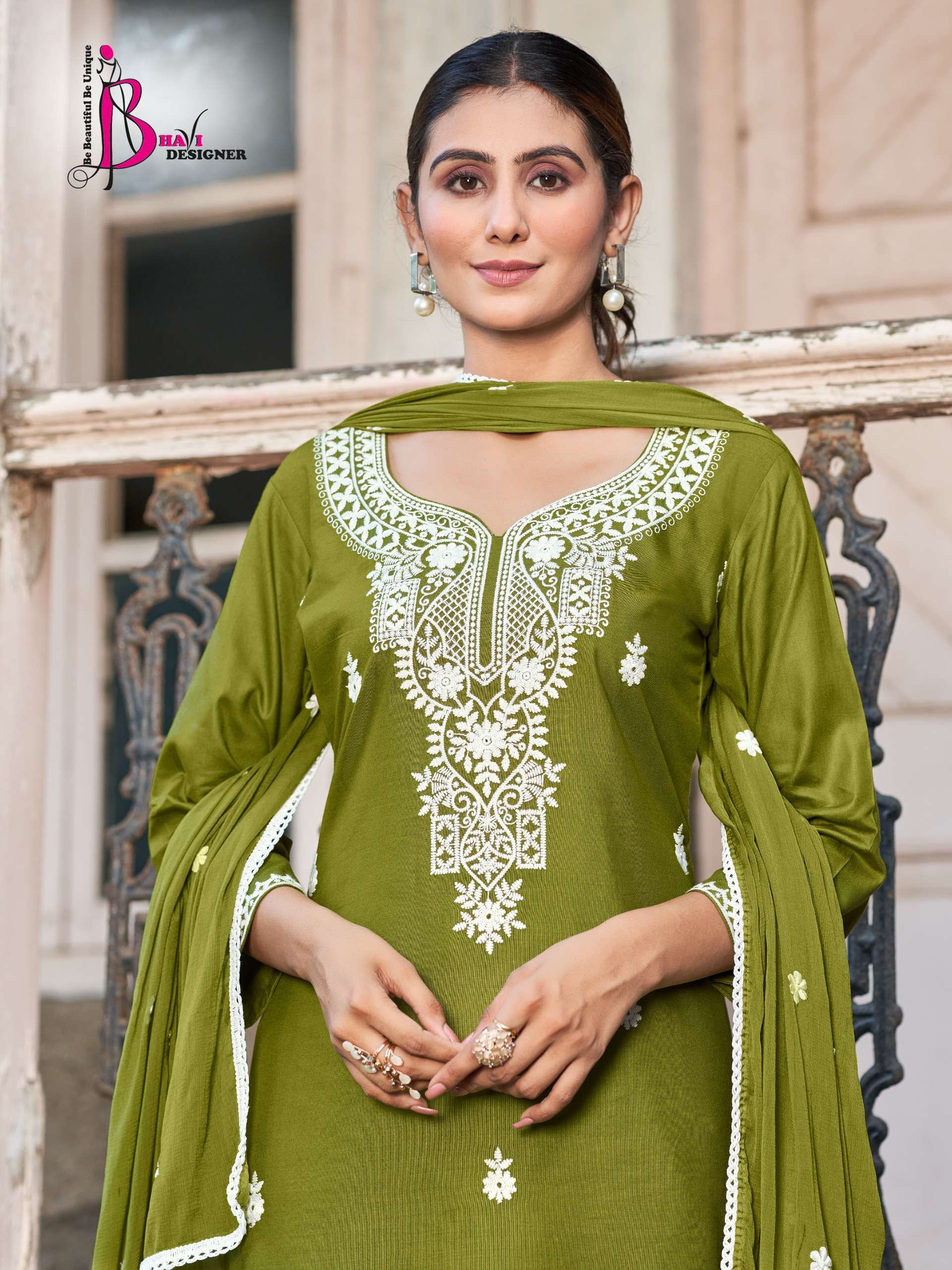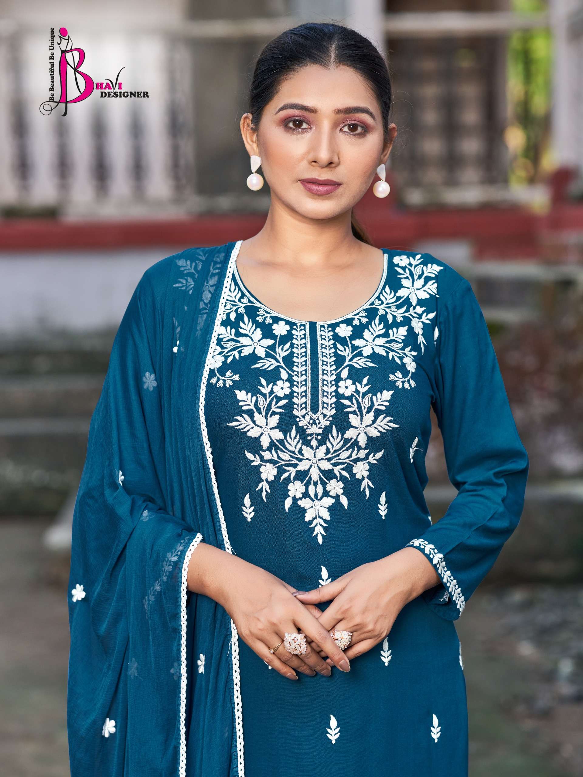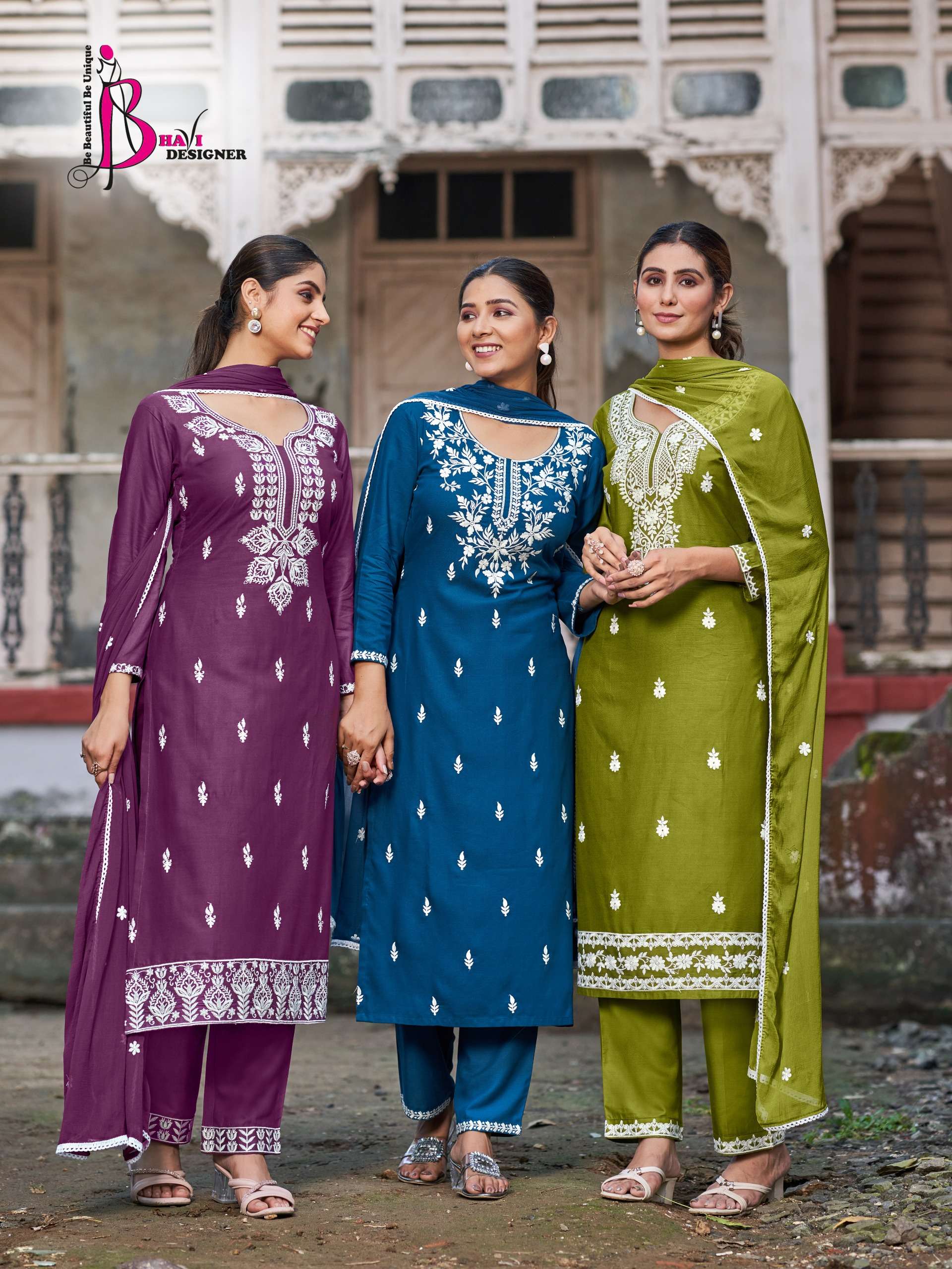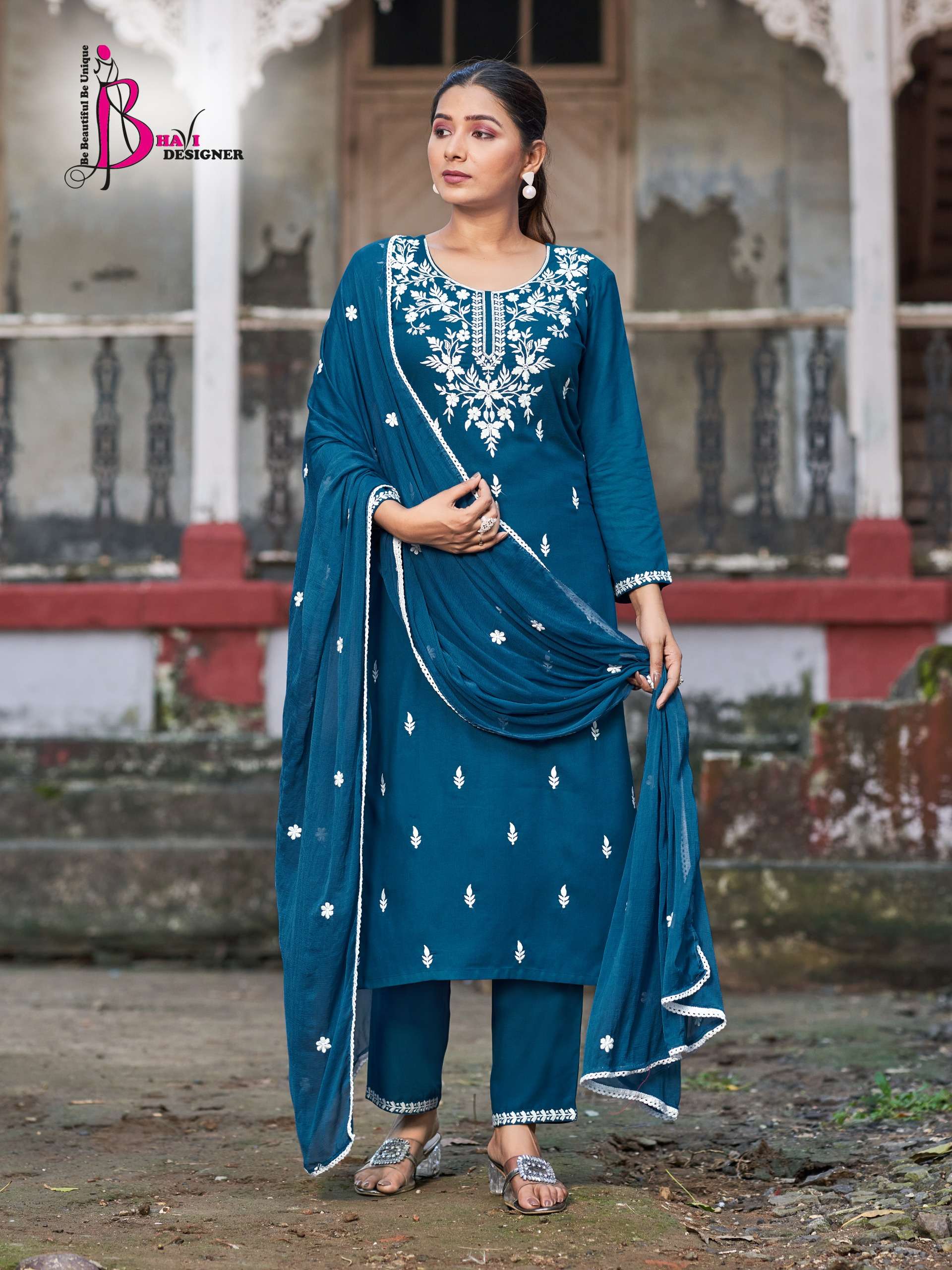 💃🏼 *Status VoL-3* 💃🏼 Step out in the most pleasant hues of this Winter season! Dyed and Rayon cotton to enhance your charm in this Winter... Turn heads in awe with our elegant a beautiful medley of rich bright tones,pure weaves of fabric with touch of White embroidery in Garments.. Bhavi Designer is stocked to celebrate the season of Winter with its Royal collection of 3 pieces ..