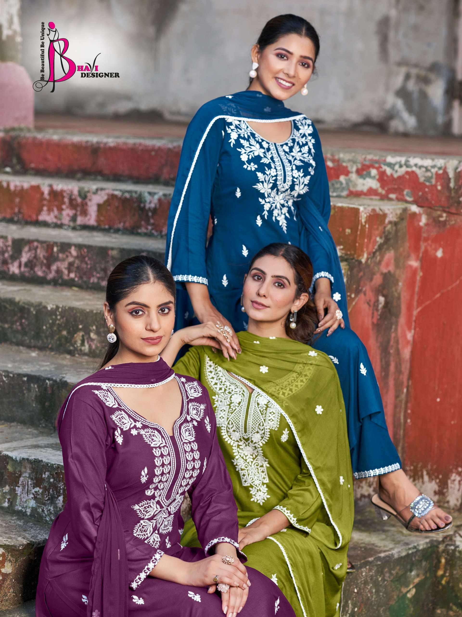 💃🏼 *Status VoL-3* 💃🏼 Step out in the most pleasant hues of this Winter season! Dyed and Rayon cotton to enhance your charm in this Winter... Turn heads in awe with our elegant a beautiful medley of rich bright tones,pure weaves of fabric with touch of White embroidery in Garments.. Bhavi Designer is stocked to celebrate the season of Winter with its Royal collection of 3 pieces ..