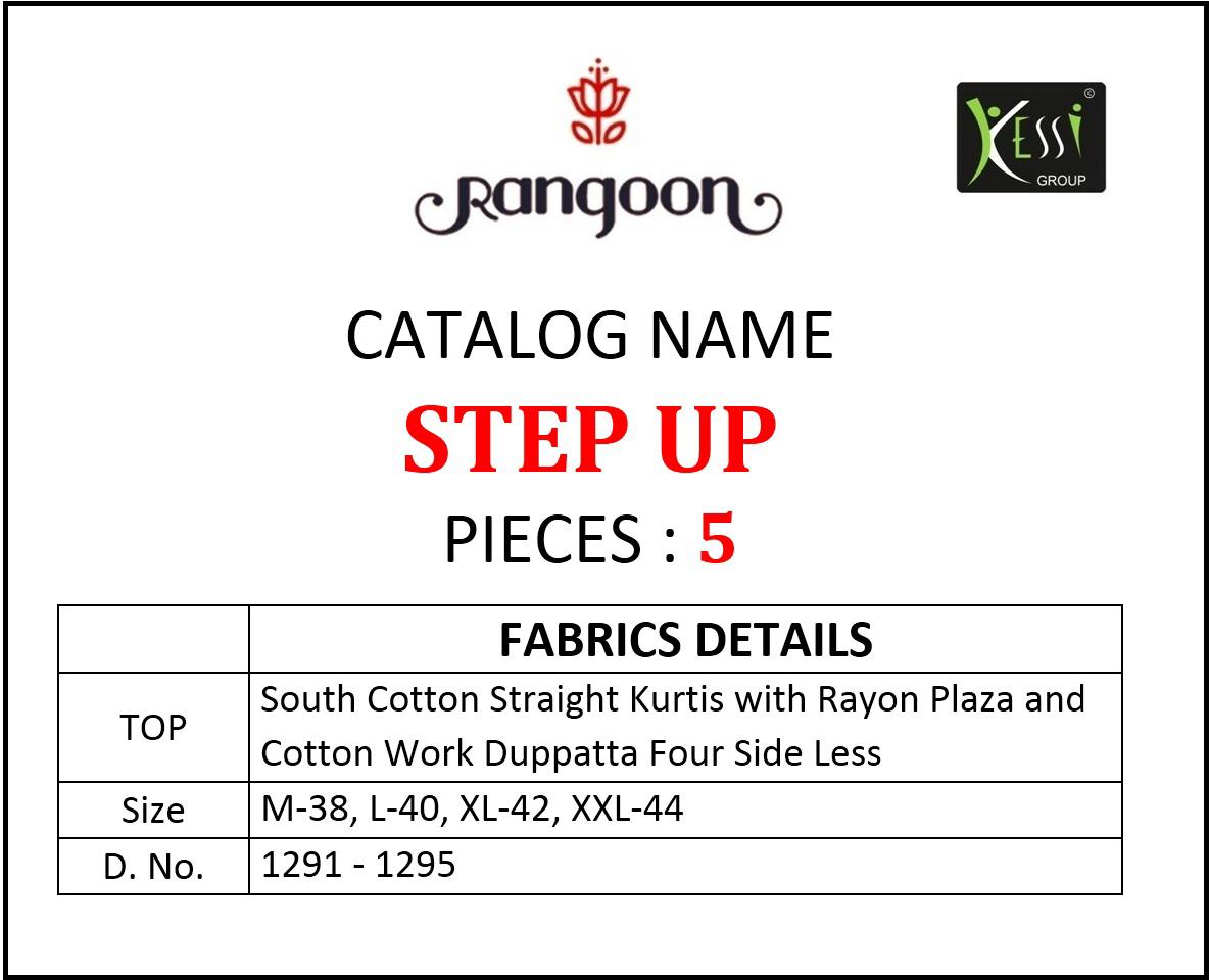 ? *Rangoon (Kessi Fabrics Pvt. Ltd.)* has launched _Catalog name_ : *STEP UP* ? _Fabric Details_ ? ?Top :- South Cotton Straight Kurtis with Rayon Plaza and Cotton Work Duppatta Four Side Less ?Total Design :- 5 ?Size;- M-38, L-40, XL-42, XXL-44 Rate -899 per Pcs . Set To Set. GST 5 Percent Extra. ?Dispatching 5 to 6 days later ?Booking started from now... ?Order yours soon.... |