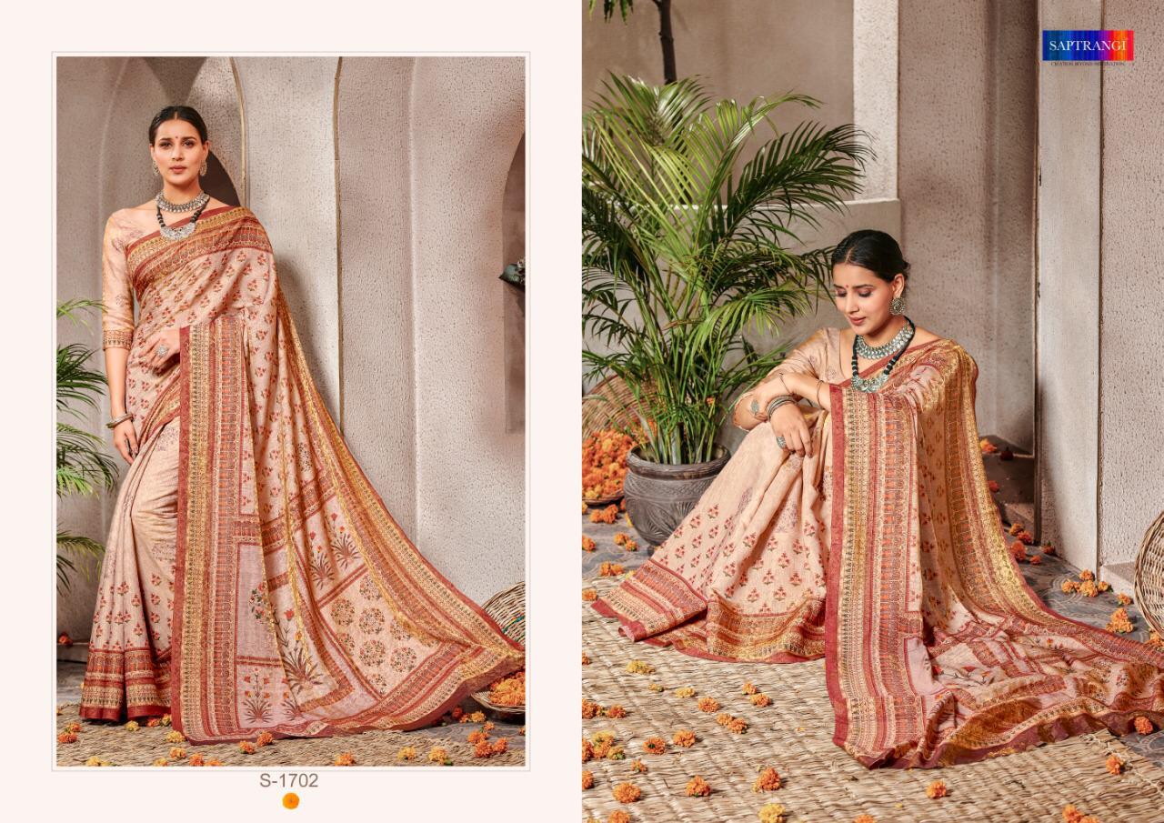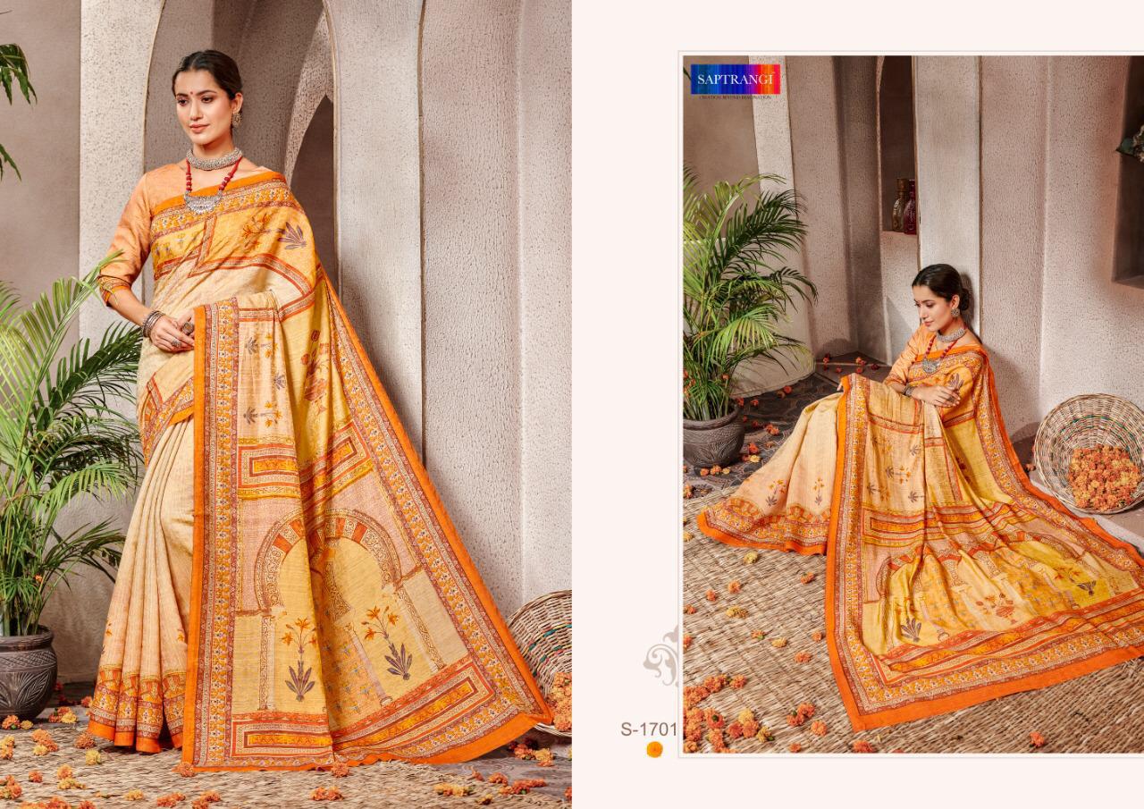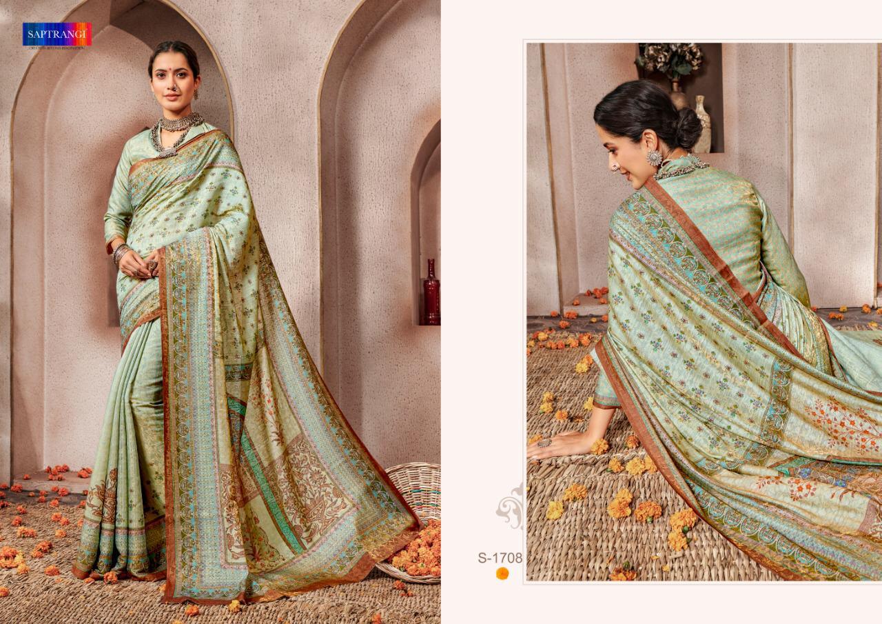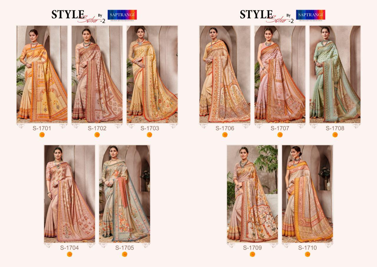 Brand - Saptrangi. Series - T-1701 To T-1711. Catlog Name - STYLE SUTRA VOL -2. * set & loose & Singel * Single Extra 100 GST 5 Percent Extra. Delivery from tomorrow |