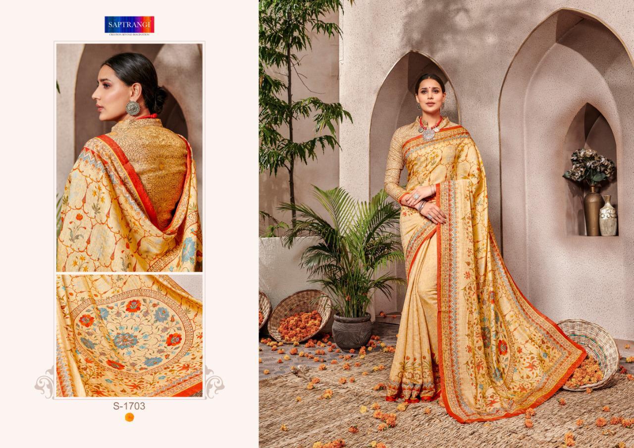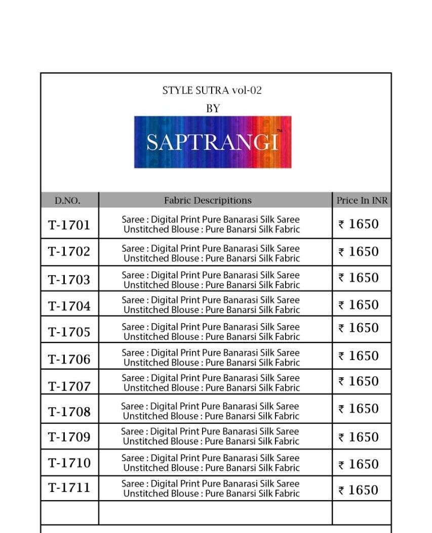 Buy Online Style Sutra Vol 2 By Saptrangi Series T 1701 To 1711 Banarasi Silk Sarees Wholesale Supplier Gujarat 11 Pcs of Full Catalogue at Wholesale Price. Looking for Style Sutra Vol 2 By Saptrangi Series T 1701 To 1711 Banarasi Silk Sarees Wholesale Supplier Gujarat Full Catalouge at Best Price? Buy Now Style Sutra Vol 2 By Saptrangi Series T 1701 To 1711 Banarasi Silk Sarees Wholesale Supplier Gujarat at Wholesale Rate of Rs 18150 with Total 11 Pcs from authroized dealer and supplier of SAPTARANGI Brand. Cost of Each piece is just only Rs 1650 which is very low and affordable price to resale the product in your retail store ,This is Surat based Wholesale Supplier & Dealer of SAPTARANGI Brand. Click on Brand name to Know more about SAPTARANGI Brand's products.Call or Whatsapp on 9898838984 for booking or enquiry